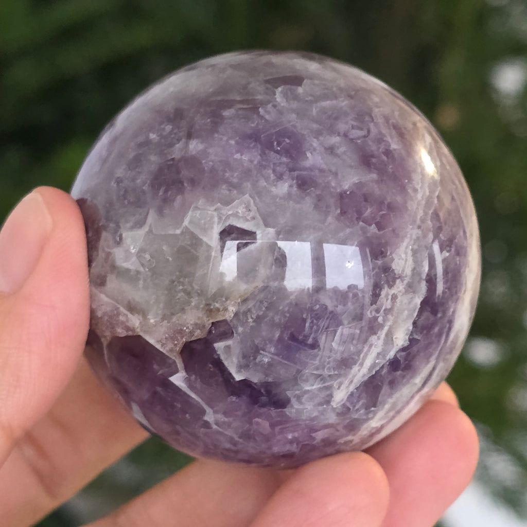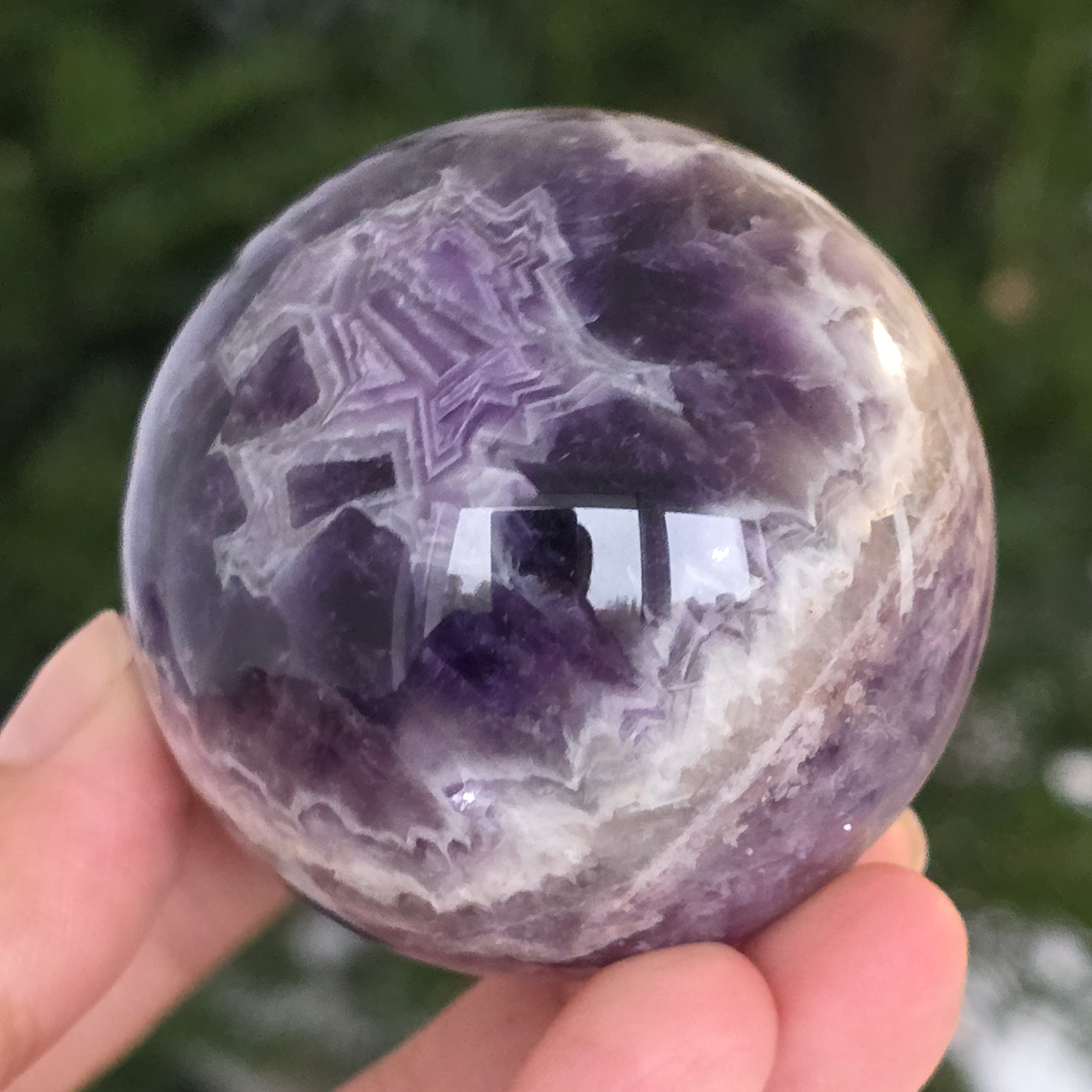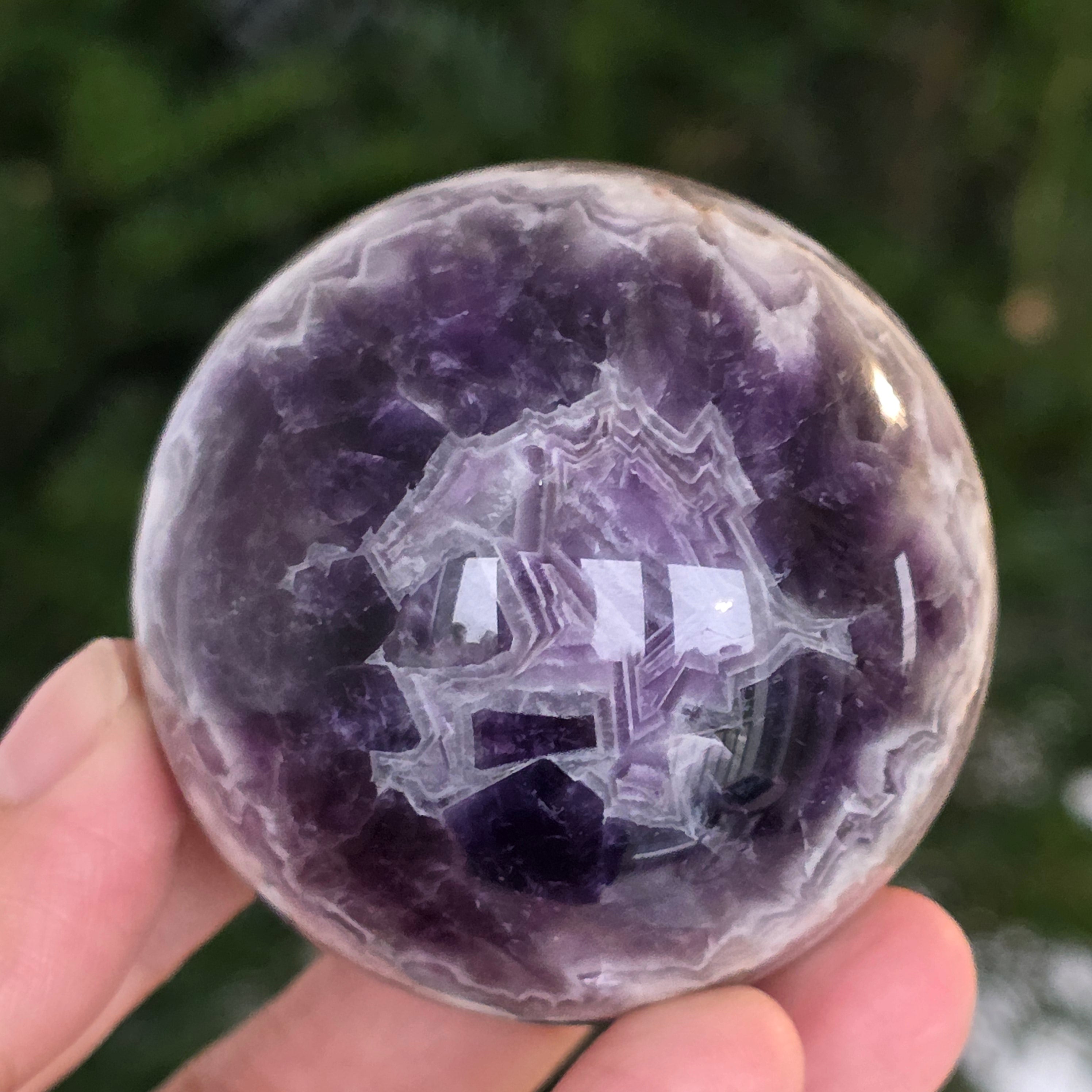 O sferă ce pare să concentreze în interior lumina unei nopți liliachii. Această piesă unicat din ametist chevron natural, dezvăluie straturi uimitoare de violet, alb și lavandă, dispuse în forme în V – semnul distinctiv al acestei varietăți rare de ametist. Suprafața perfect șlefuită, catifelată la atingere, oglindește lumina cu o finețe hipnotică, aducând liniște și rafinament în orice spațiu.