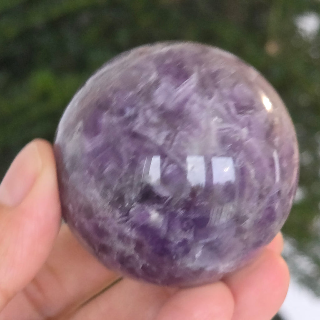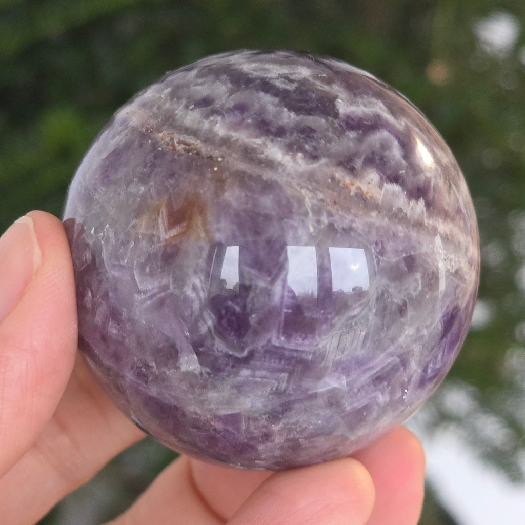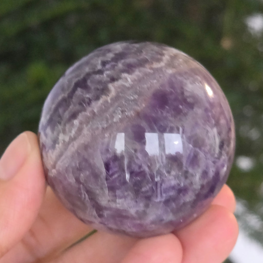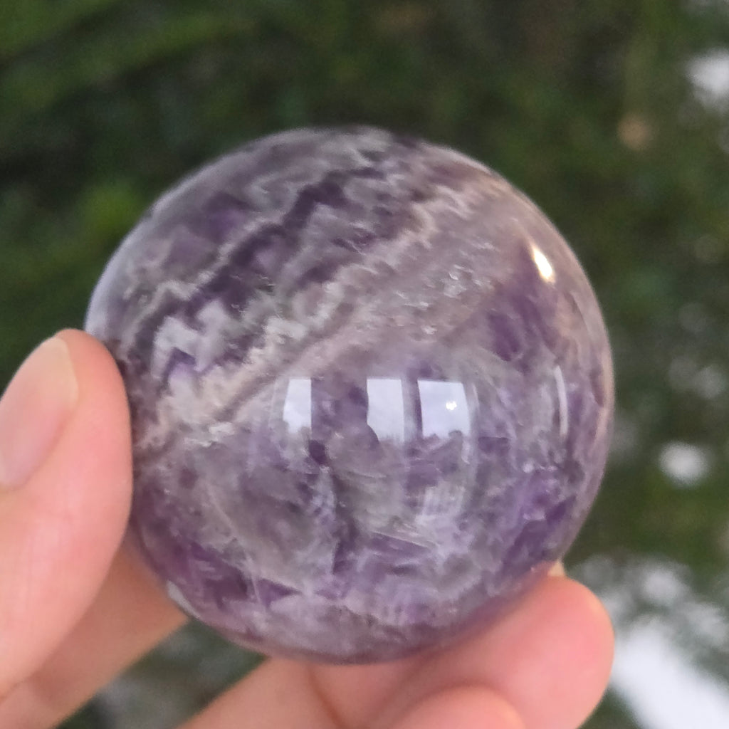 O sferă ce pare să concentreze în interior lumina unei nopți liliachii. Această piesă unicat din ametist chevron natural, dezvăluie straturi uimitoare de violet, alb și lavandă, dispuse în forme în V – semnul distinctiv al acestei varietăți rare de ametist. Suprafața perfect șlefuită, catifelată la atingere, oglindește lumina cu o finețe hipnotică, aducând liniște și rafinament în orice spațiu.