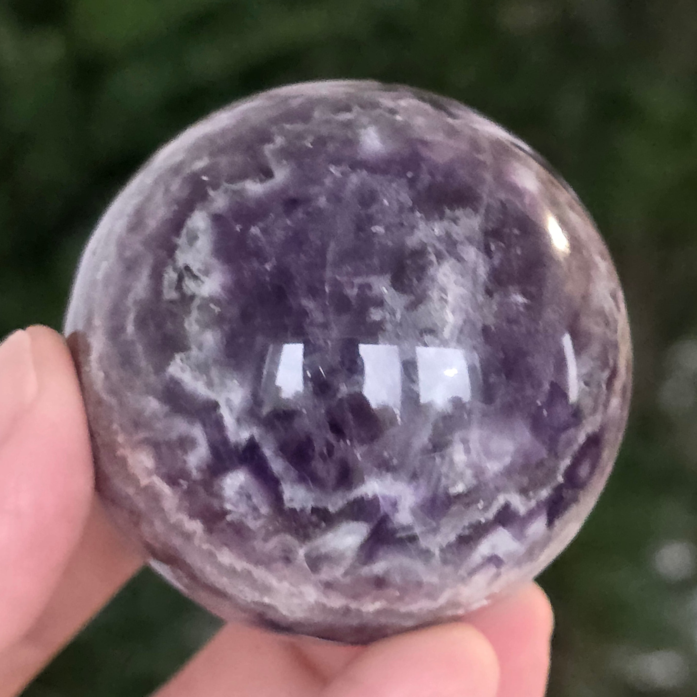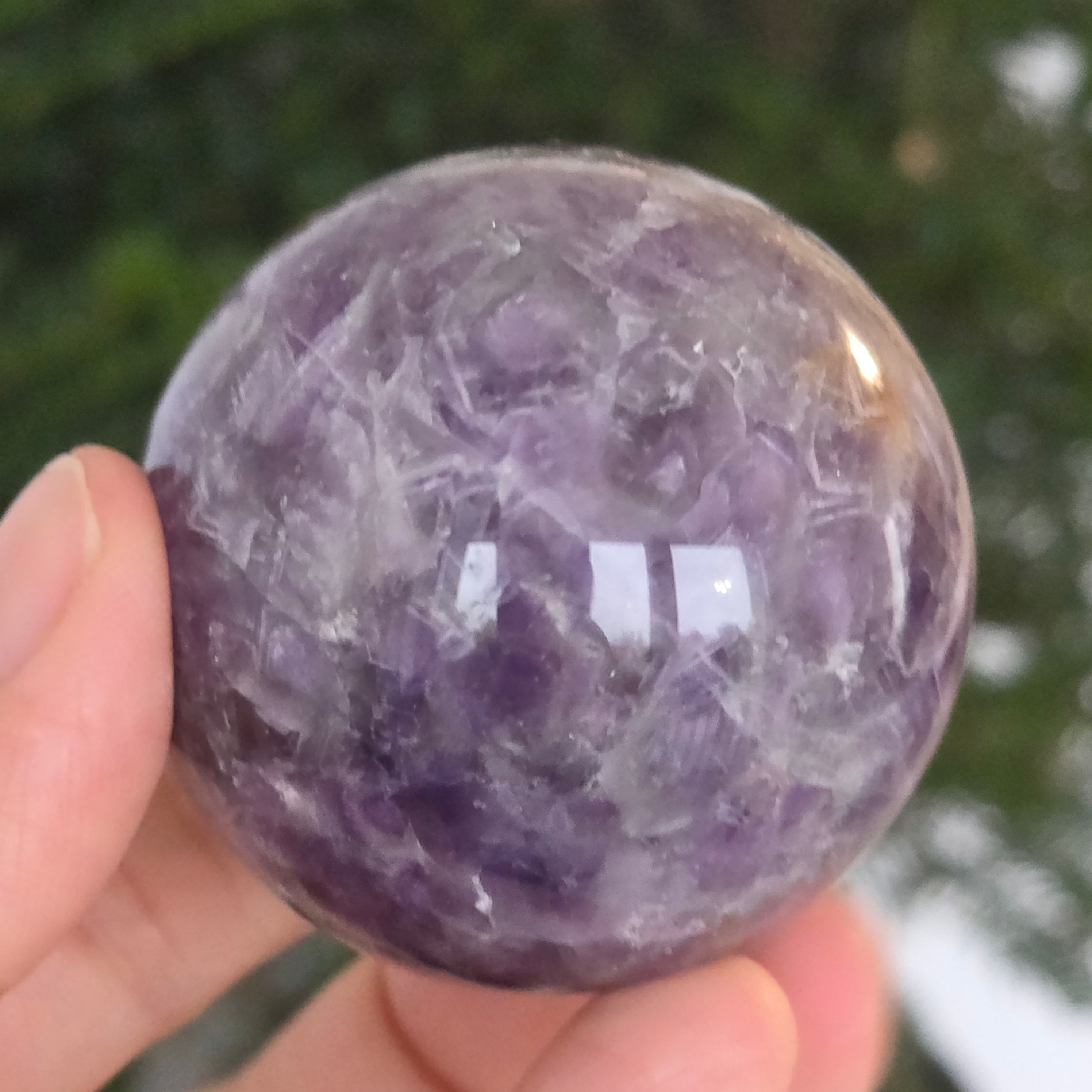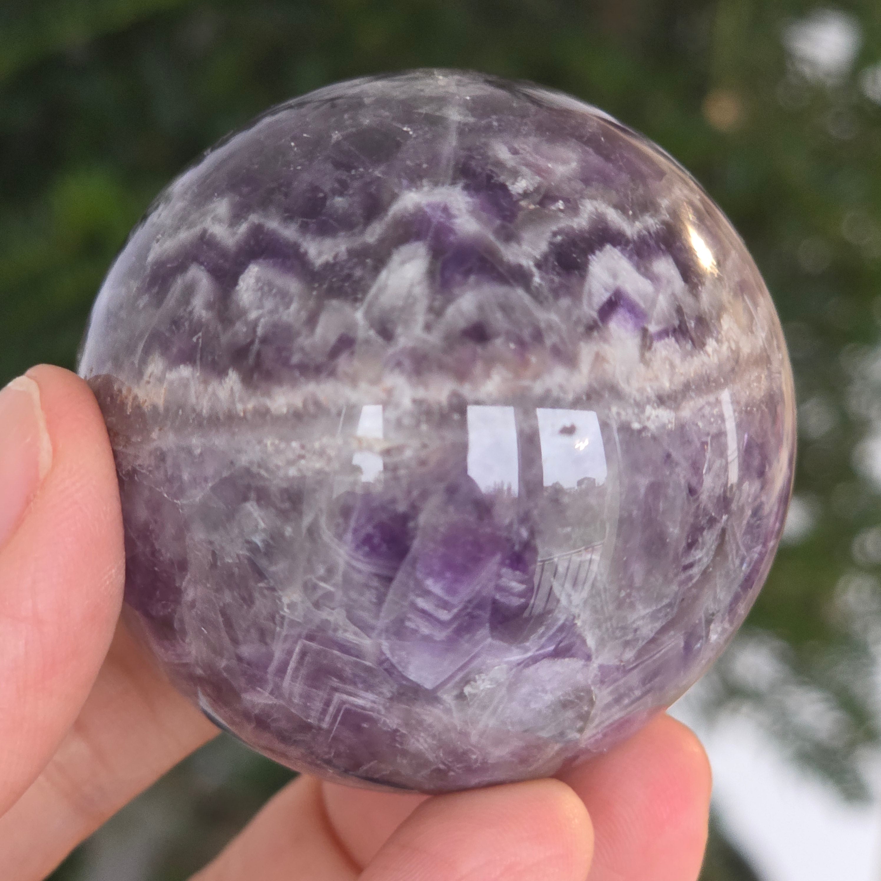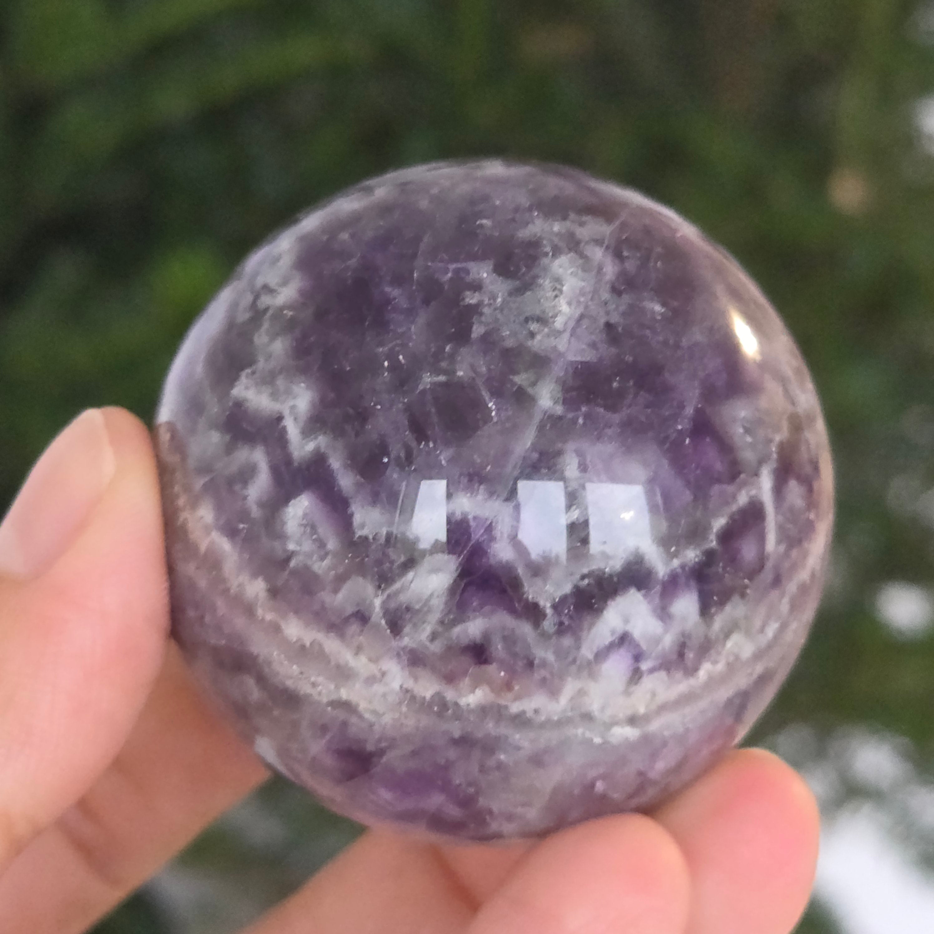 O sferă ce pare să concentreze în interior lumina unei nopți liliachii. Această piesă unicat din ametist chevron natural, dezvăluie straturi uimitoare de violet, alb și lavandă, dispuse în forme în V – semnul distinctiv al acestei varietăți rare de ametist. Suprafața perfect șlefuită, catifelată la atingere, oglindește lumina cu o finețe hipnotică, aducând liniște și rafinament în orice spațiu.