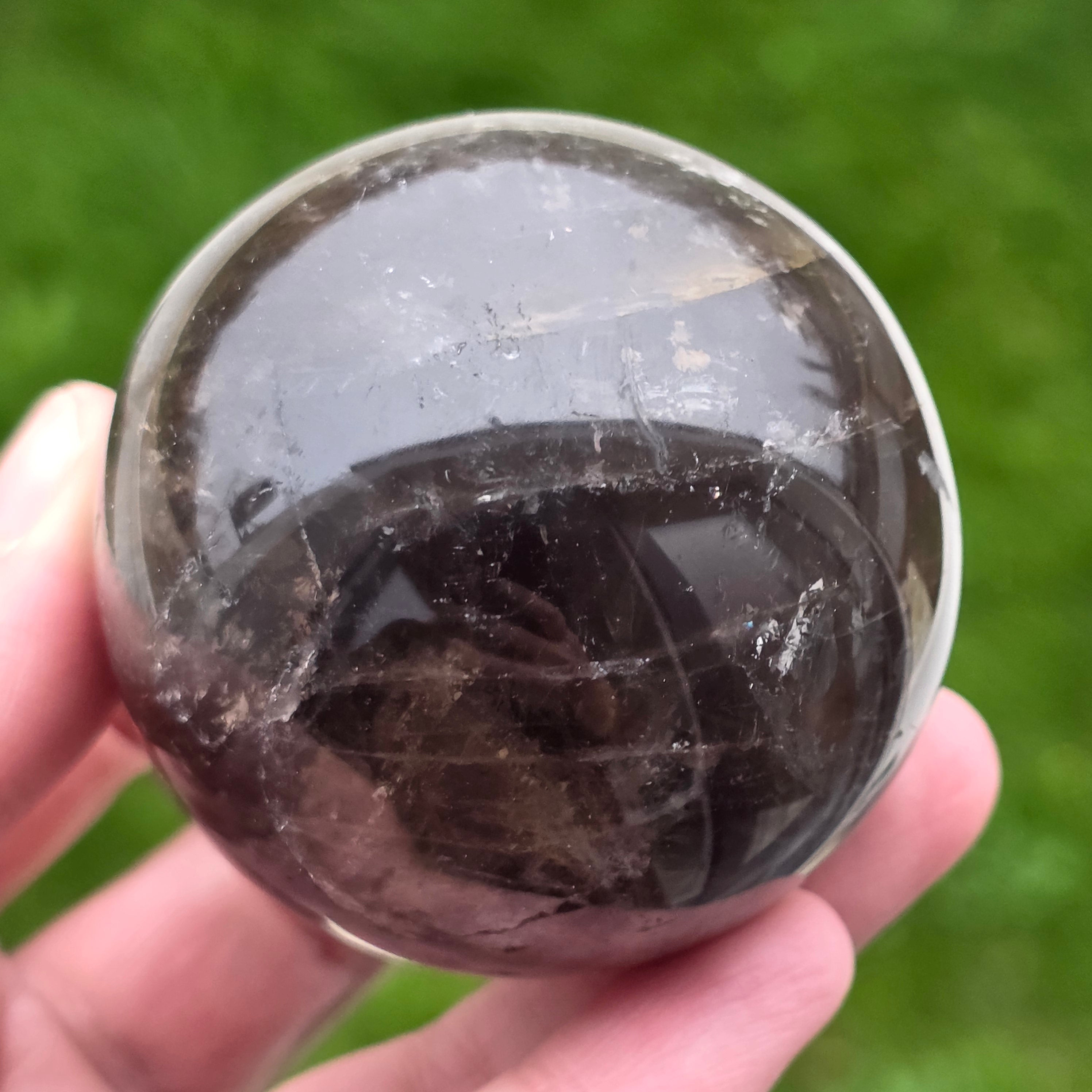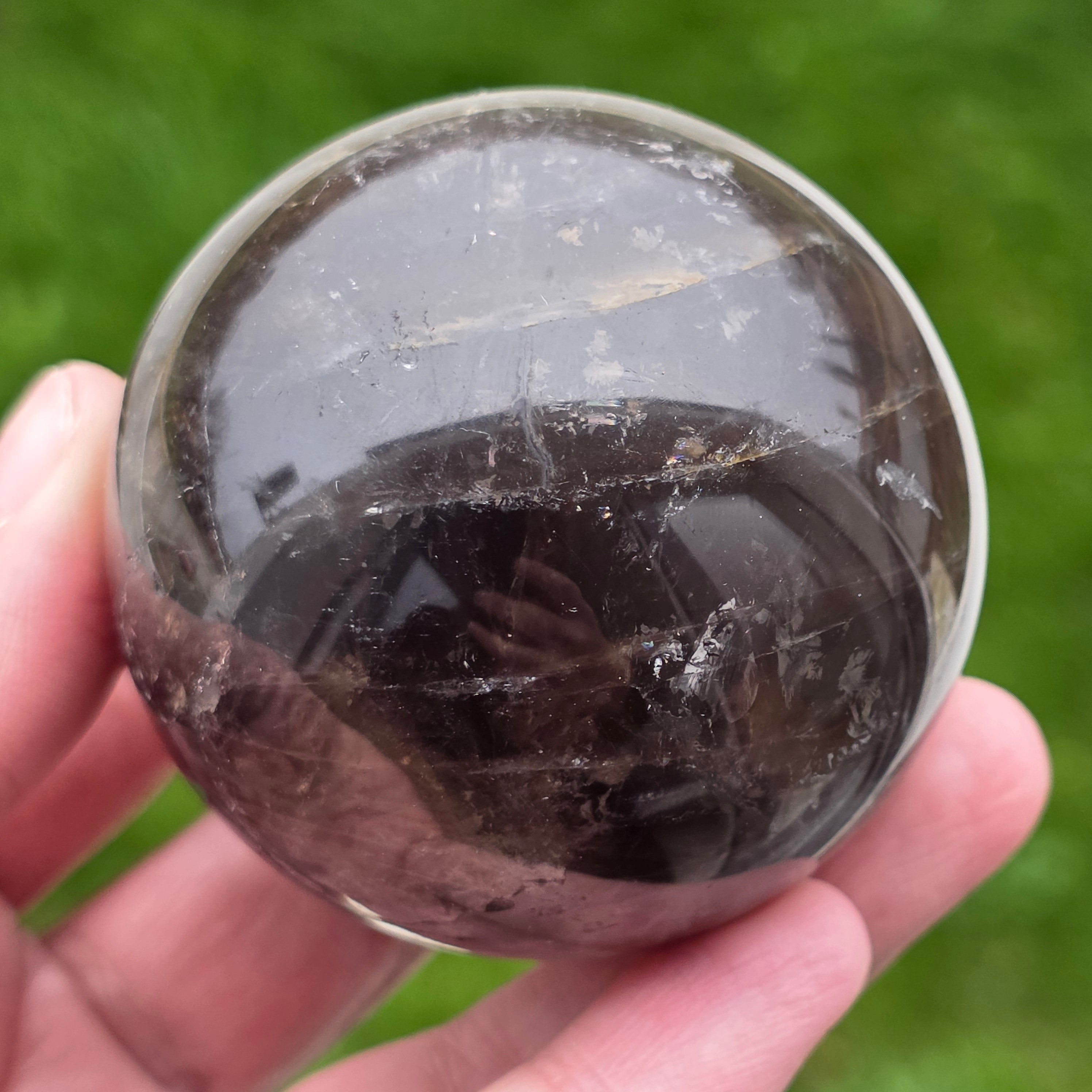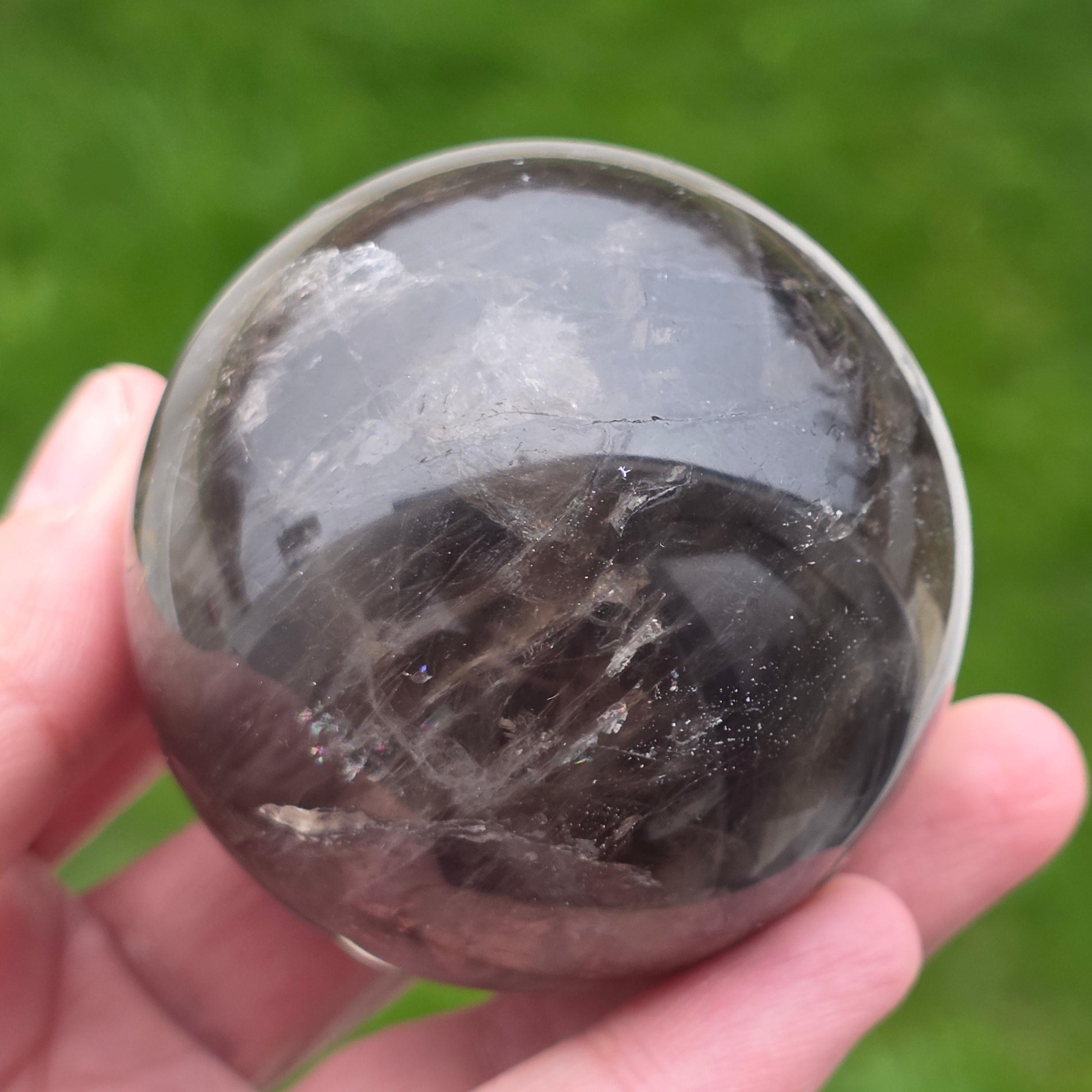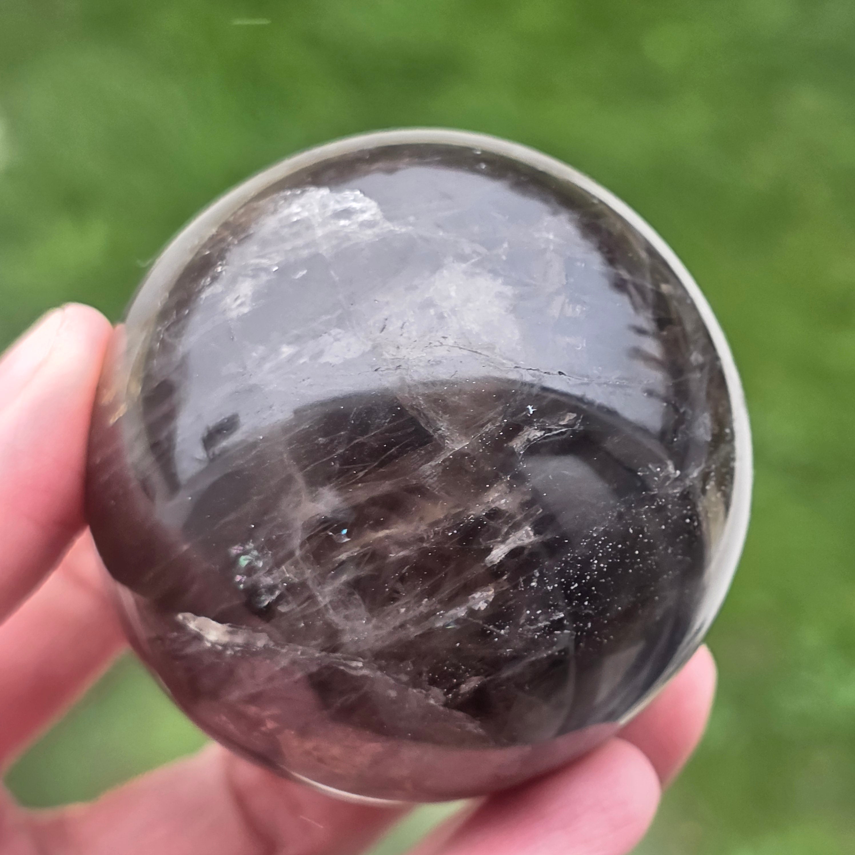 Sfera din cuarț morion este o piesă puternică și elegantă, cunoscută pentru nuanța sa profundă, asemănătoare fumului dens sau obsidianului transparent. Morionul este cea mai închisă varietate de cuarț fumuriu, iar în această formă perfect rotundă dezvăluie reflexii discrete, detalii interne fine și o prezență vizuală cu adevărat sofisticată.