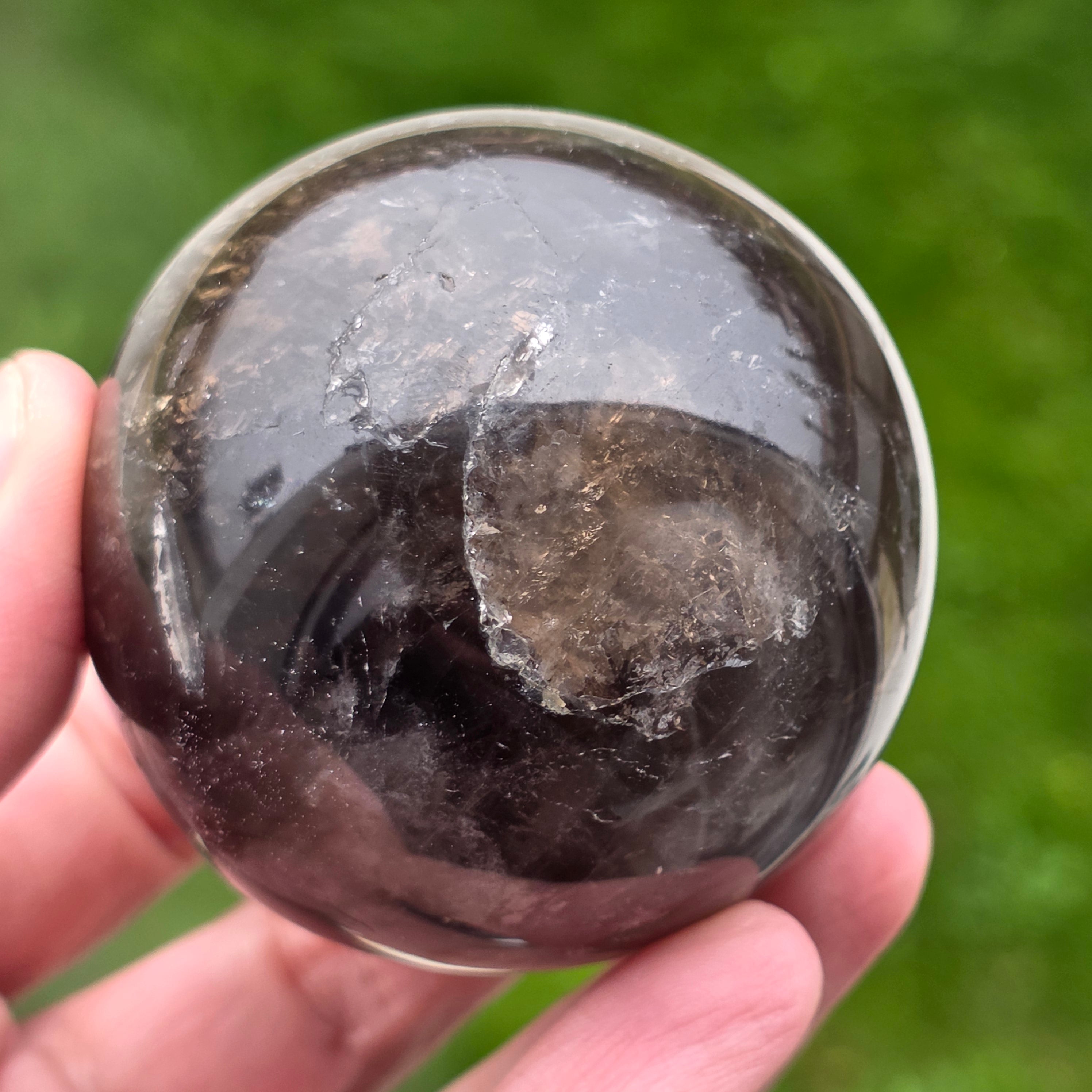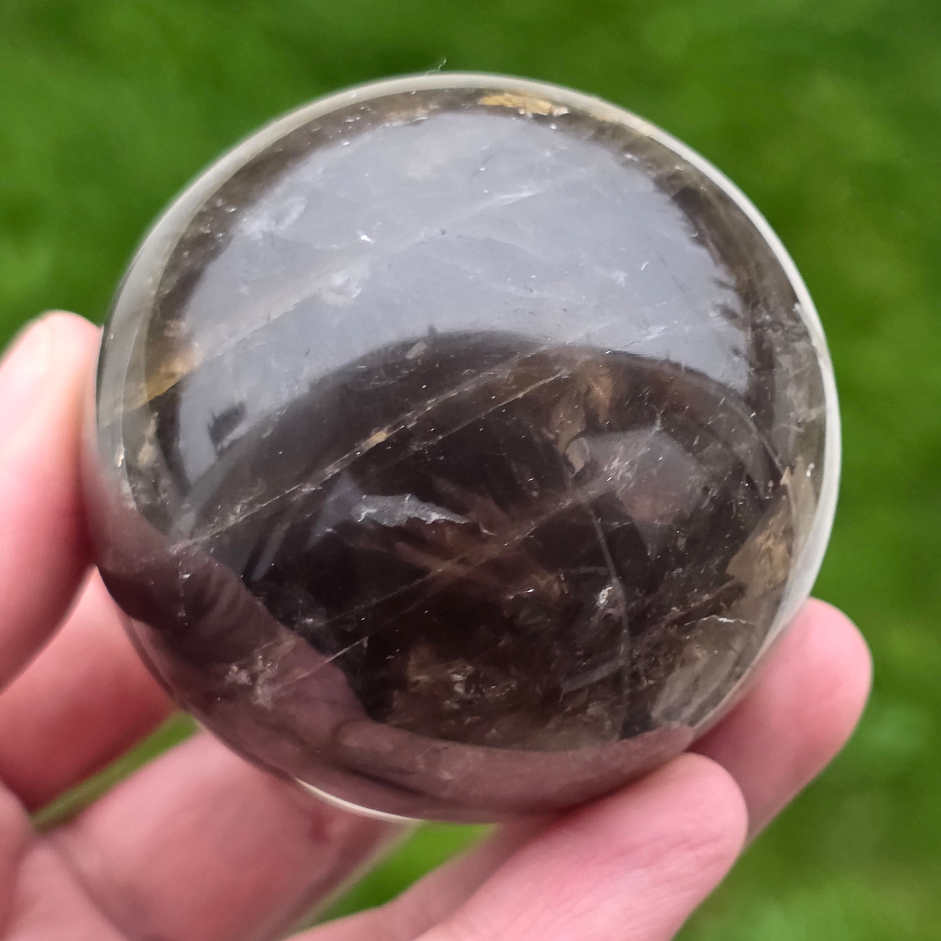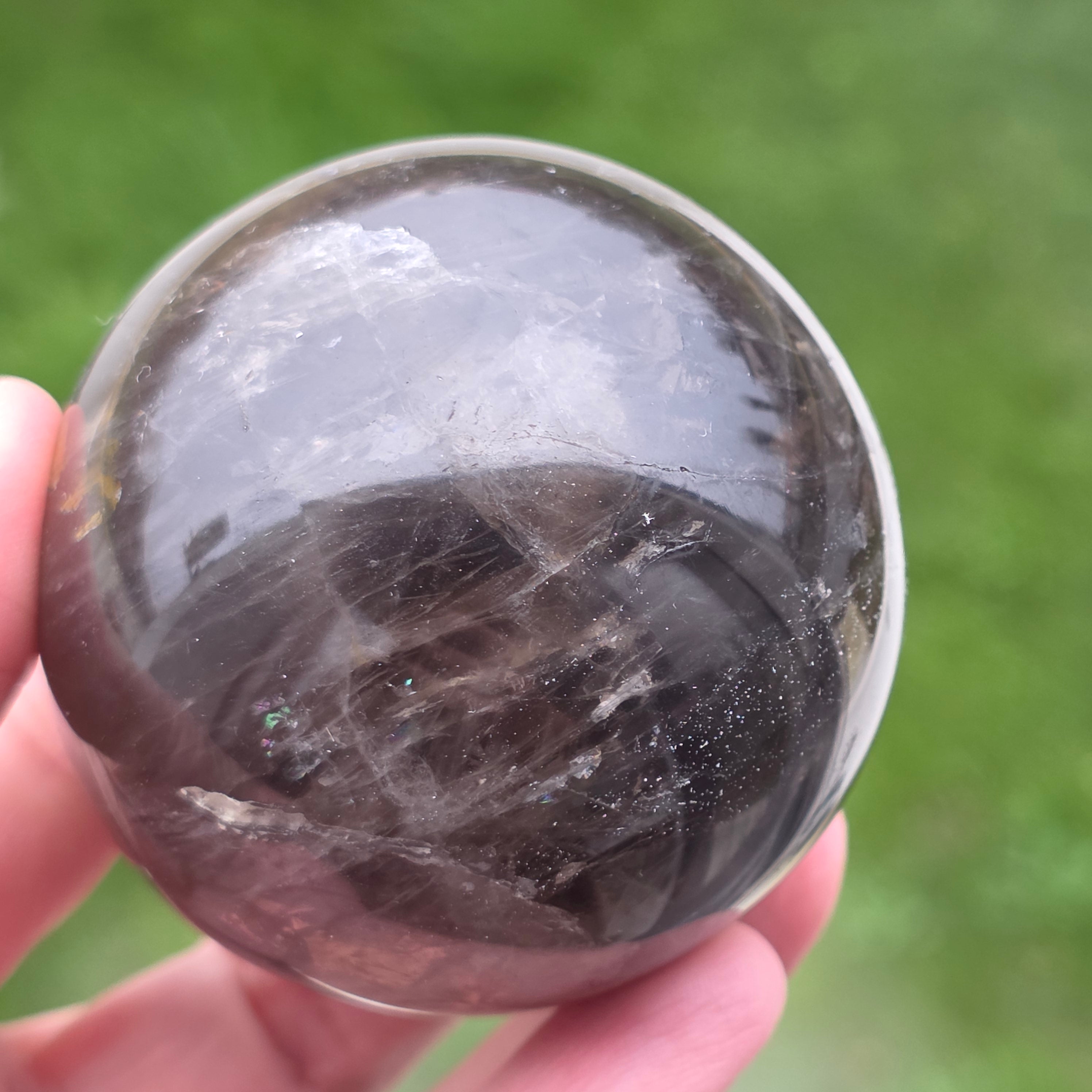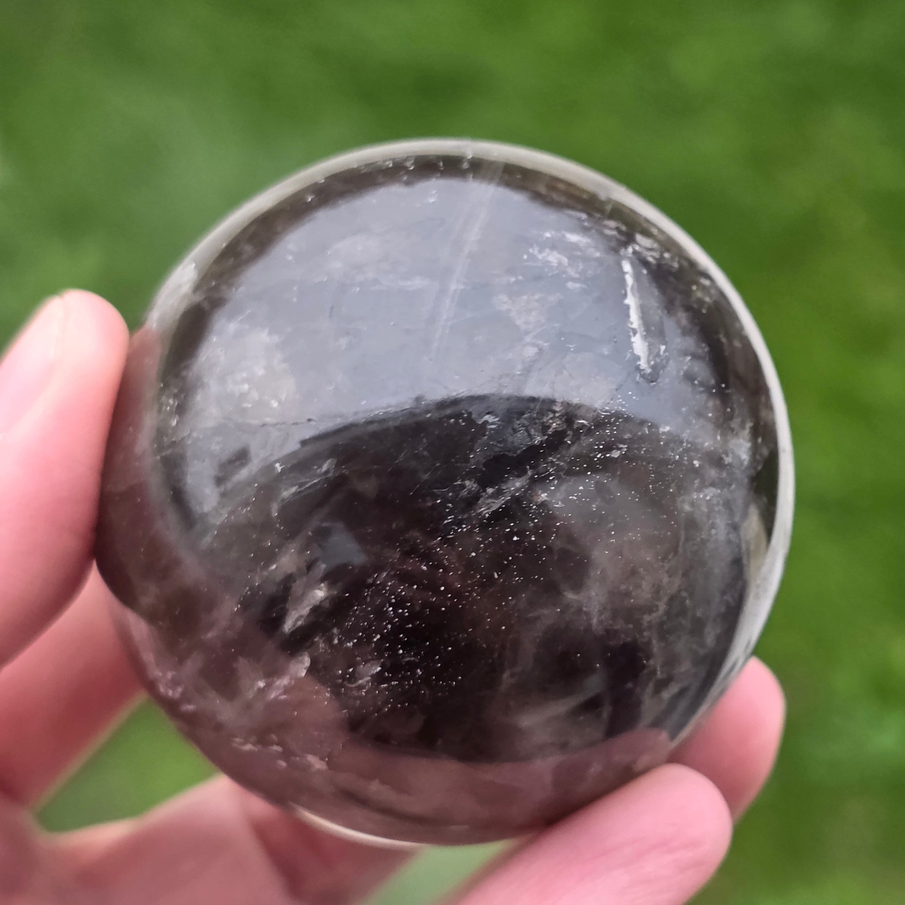 Sfera din cuarț morion este o piesă puternică și elegantă, cunoscută pentru nuanța sa profundă, asemănătoare fumului dens sau obsidianului transparent. Morionul este cea mai închisă varietate de cuarț fumuriu, iar în această formă perfect rotundă dezvăluie reflexii discrete, detalii interne fine și o prezență vizuală cu adevărat sofisticată.