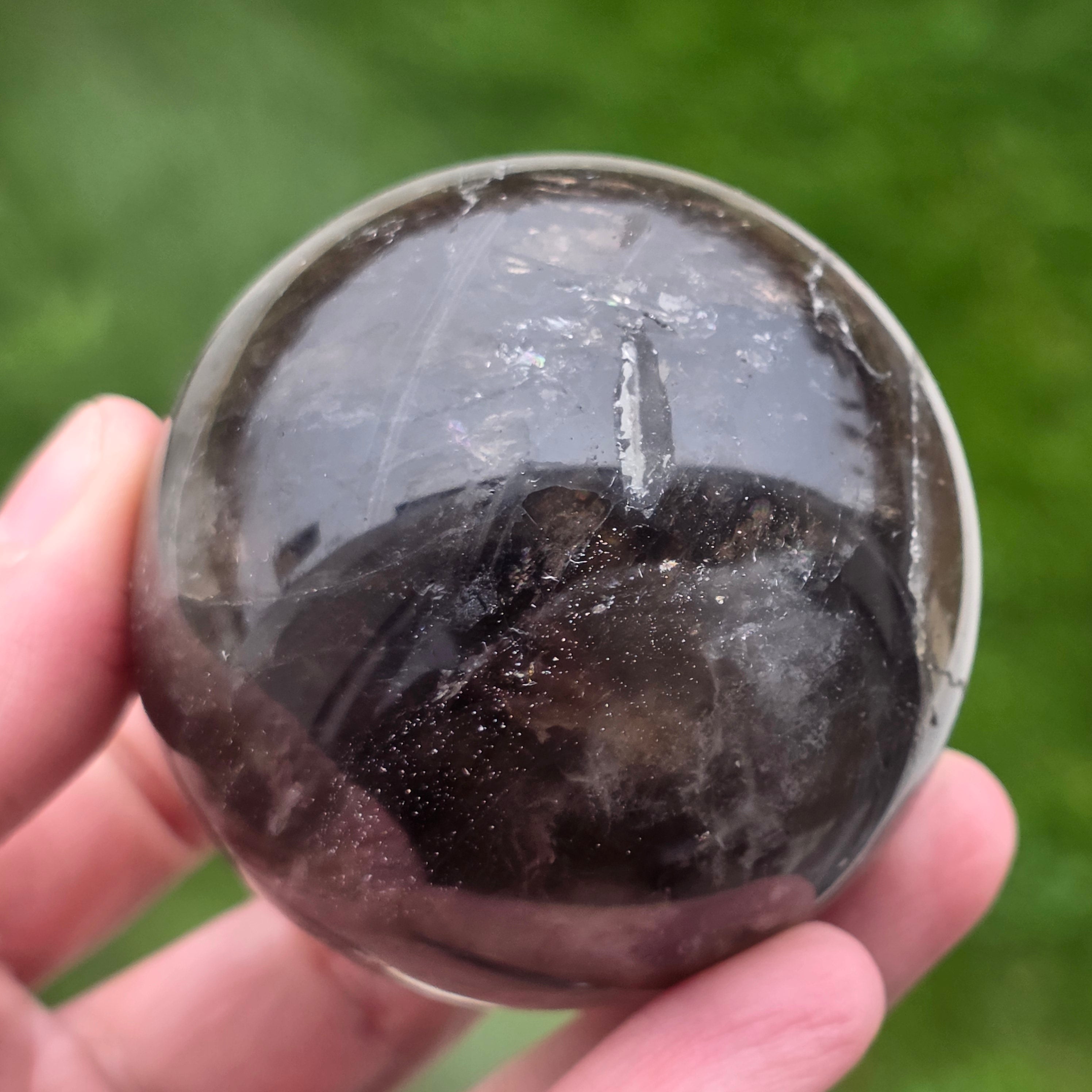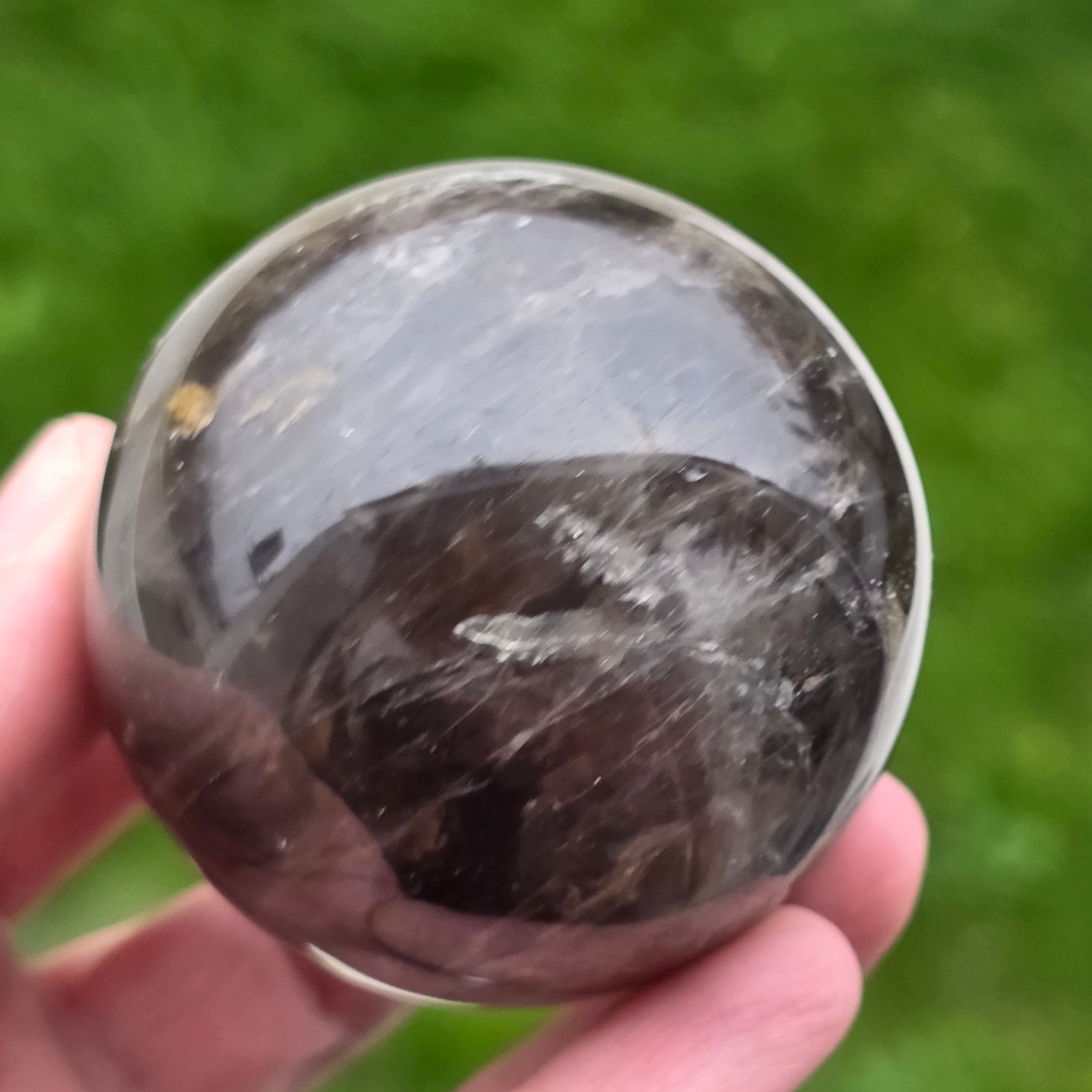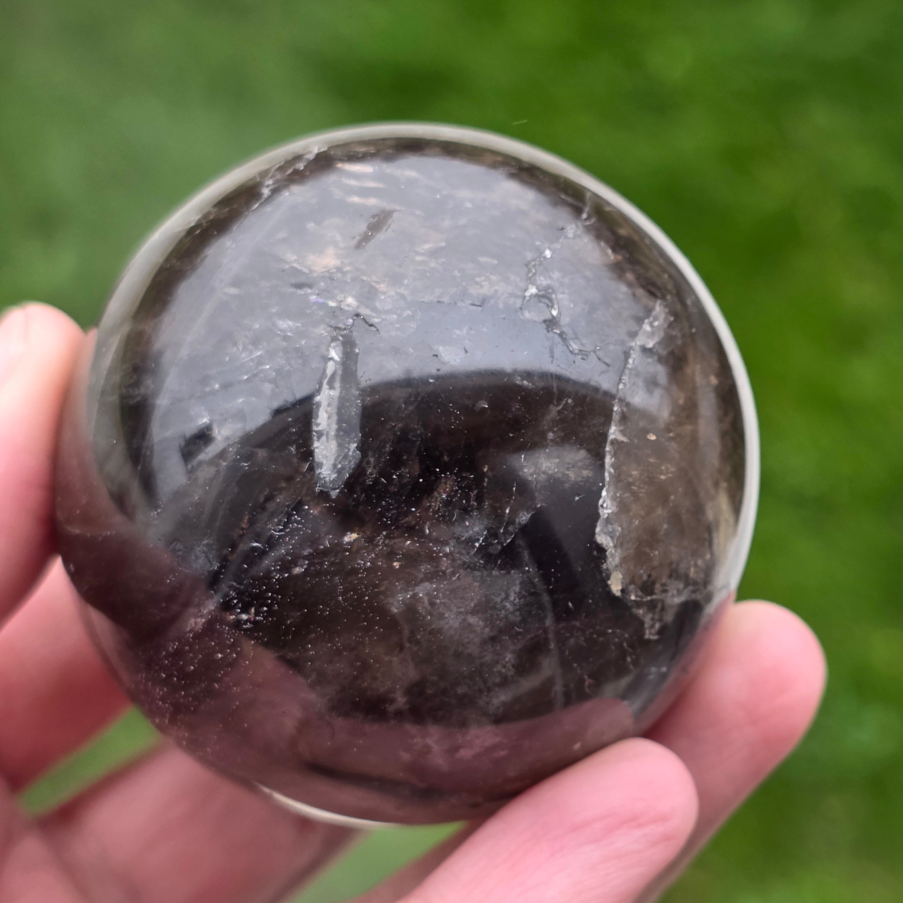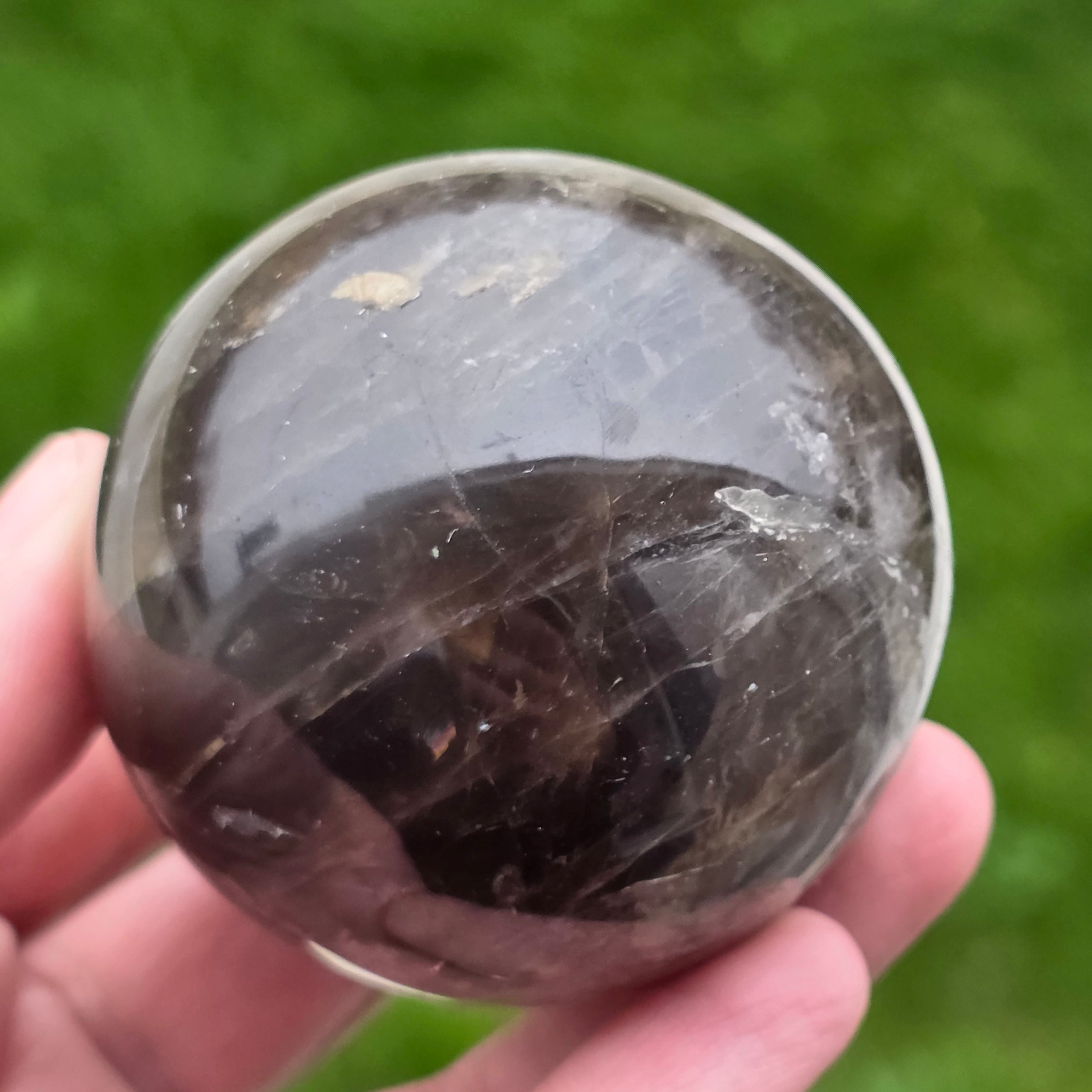 Sfera din cuarț morion este o piesă puternică și elegantă, cunoscută pentru nuanța sa profundă, asemănătoare fumului dens sau obsidianului transparent. Morionul este cea mai închisă varietate de cuarț fumuriu, iar în această formă perfect rotundă dezvăluie reflexii discrete, detalii interne fine și o prezență vizuală cu adevărat sofisticată.