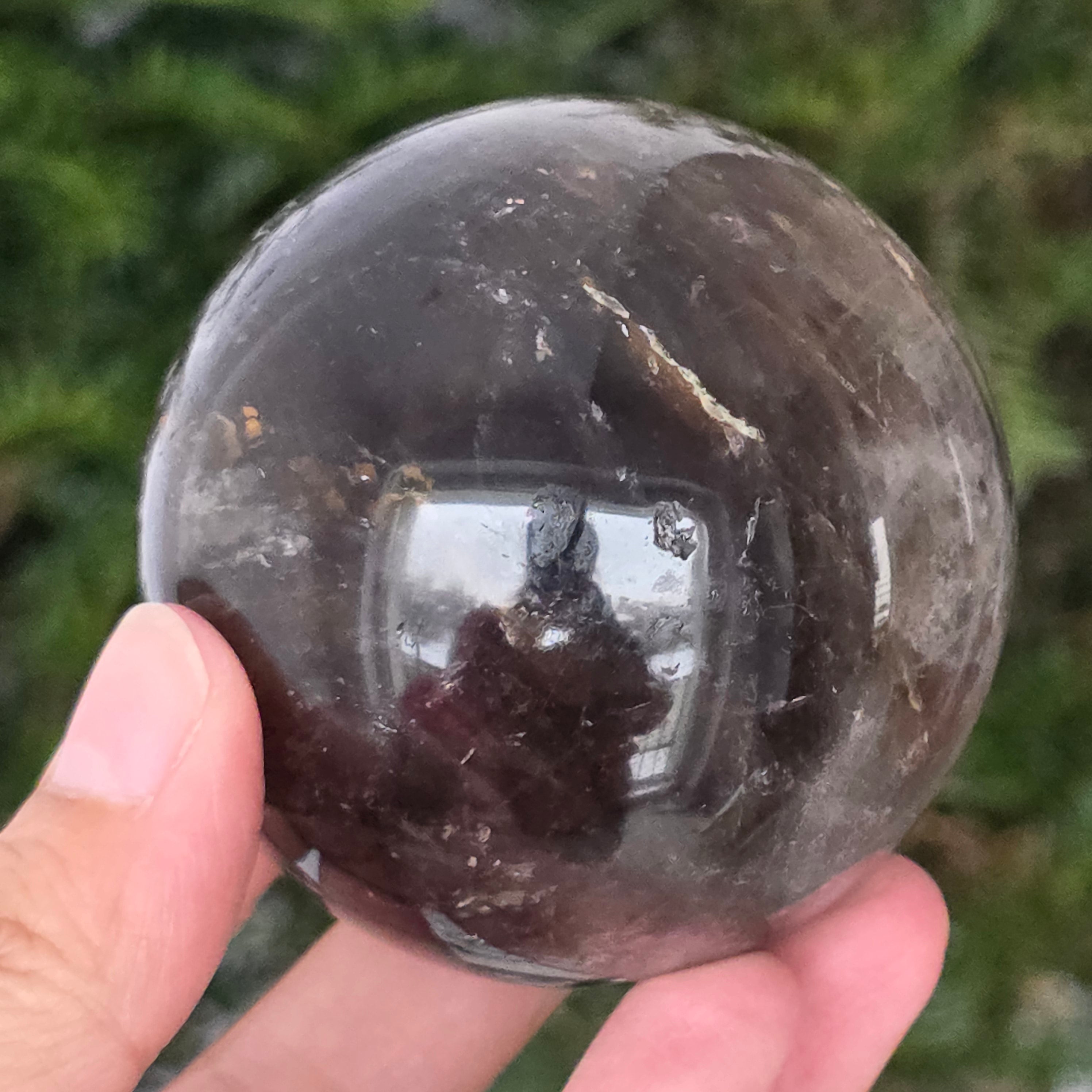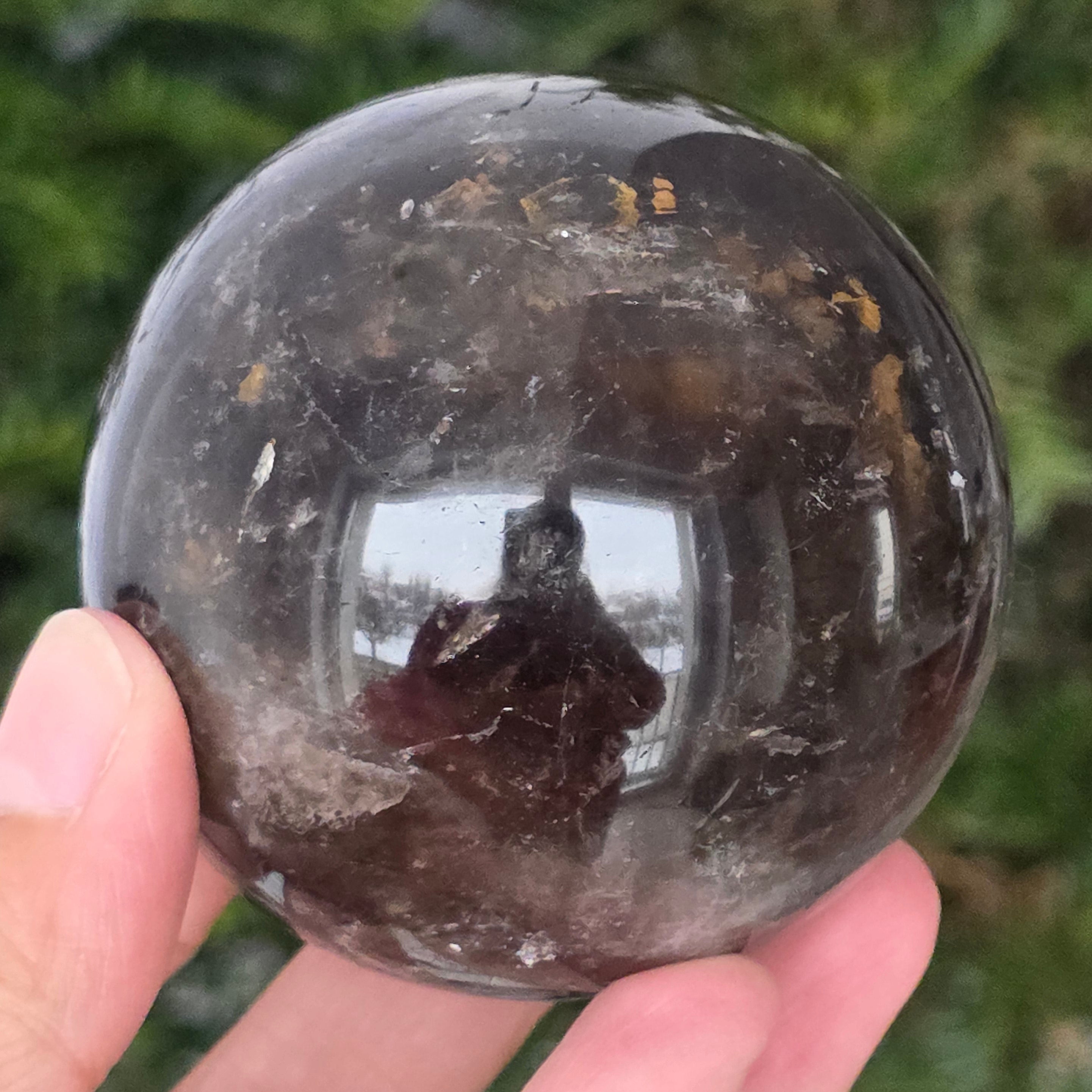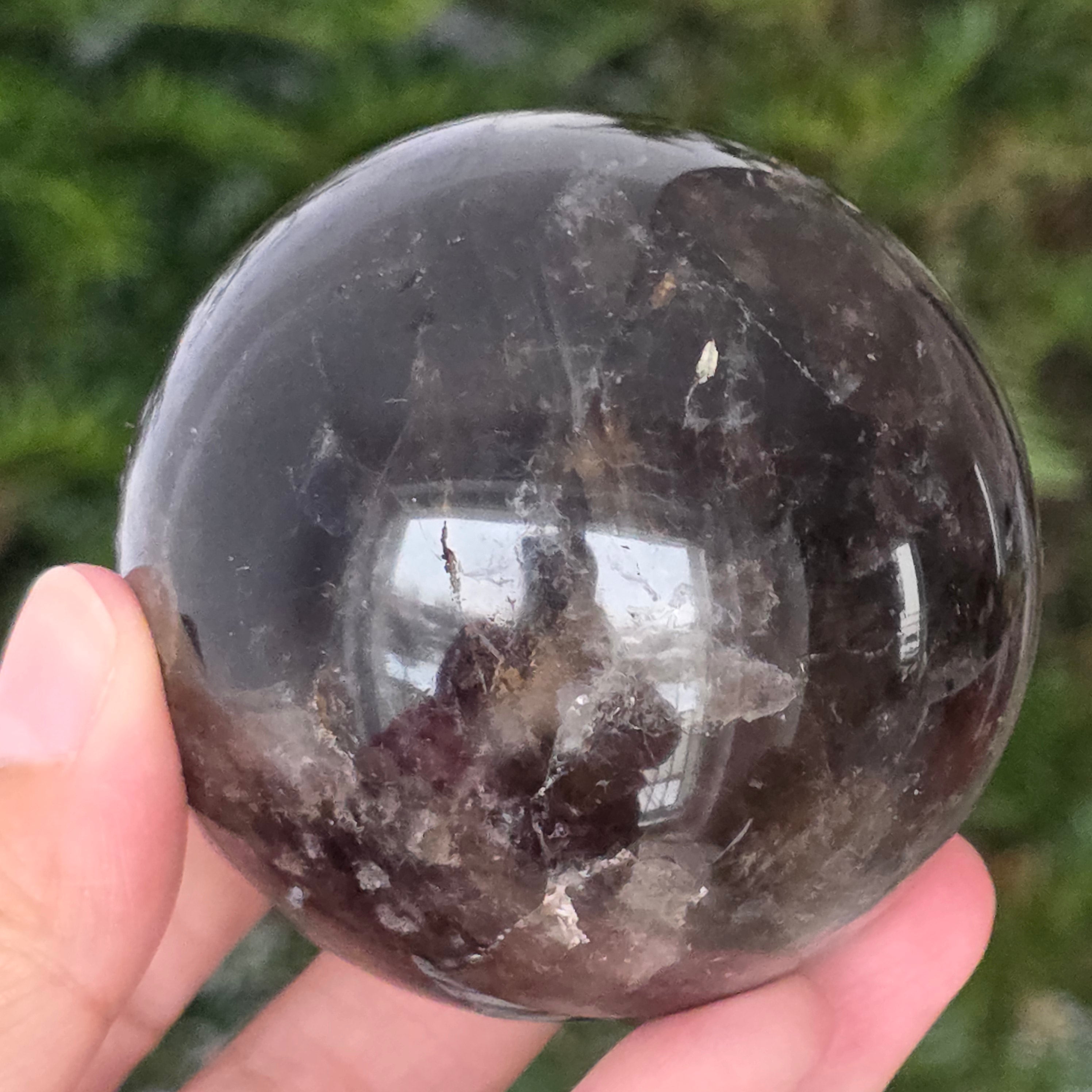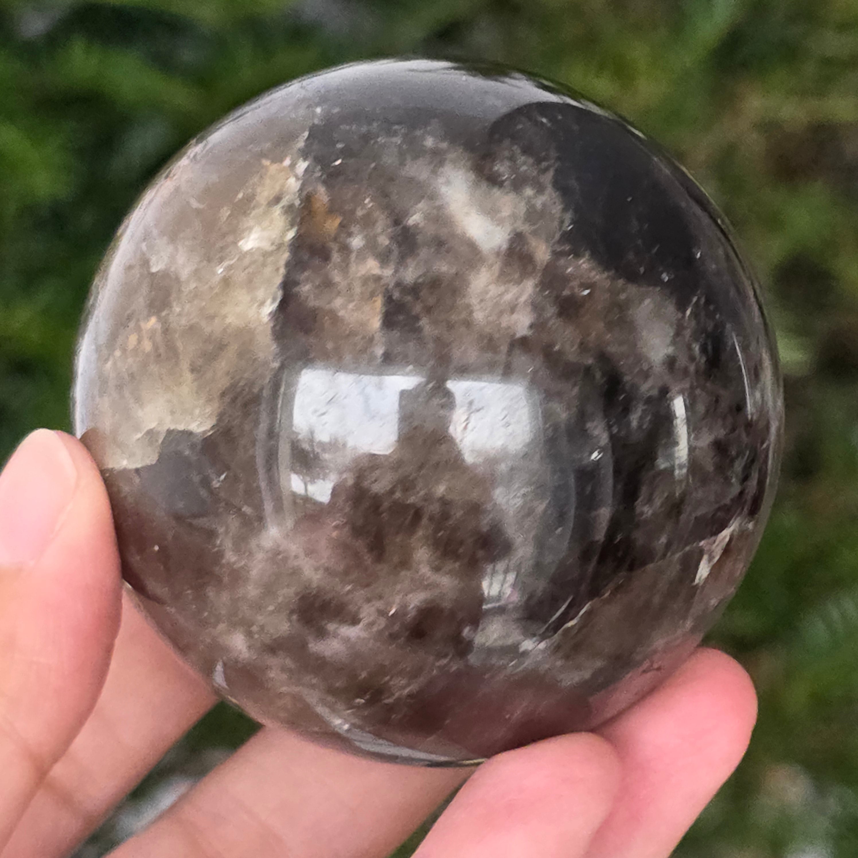 Sfera din cuarț morion este o piesă puternică și elegantă, cunoscută pentru nuanța sa profundă, asemănătoare fumului dens sau obsidianului transparent. Morionul este cea mai închisă varietate de cuarț fumuriu, iar în această formă perfect rotundă dezvăluie reflexii discrete, detalii interne fine și o prezență vizuală cu adevărat sofisticată.