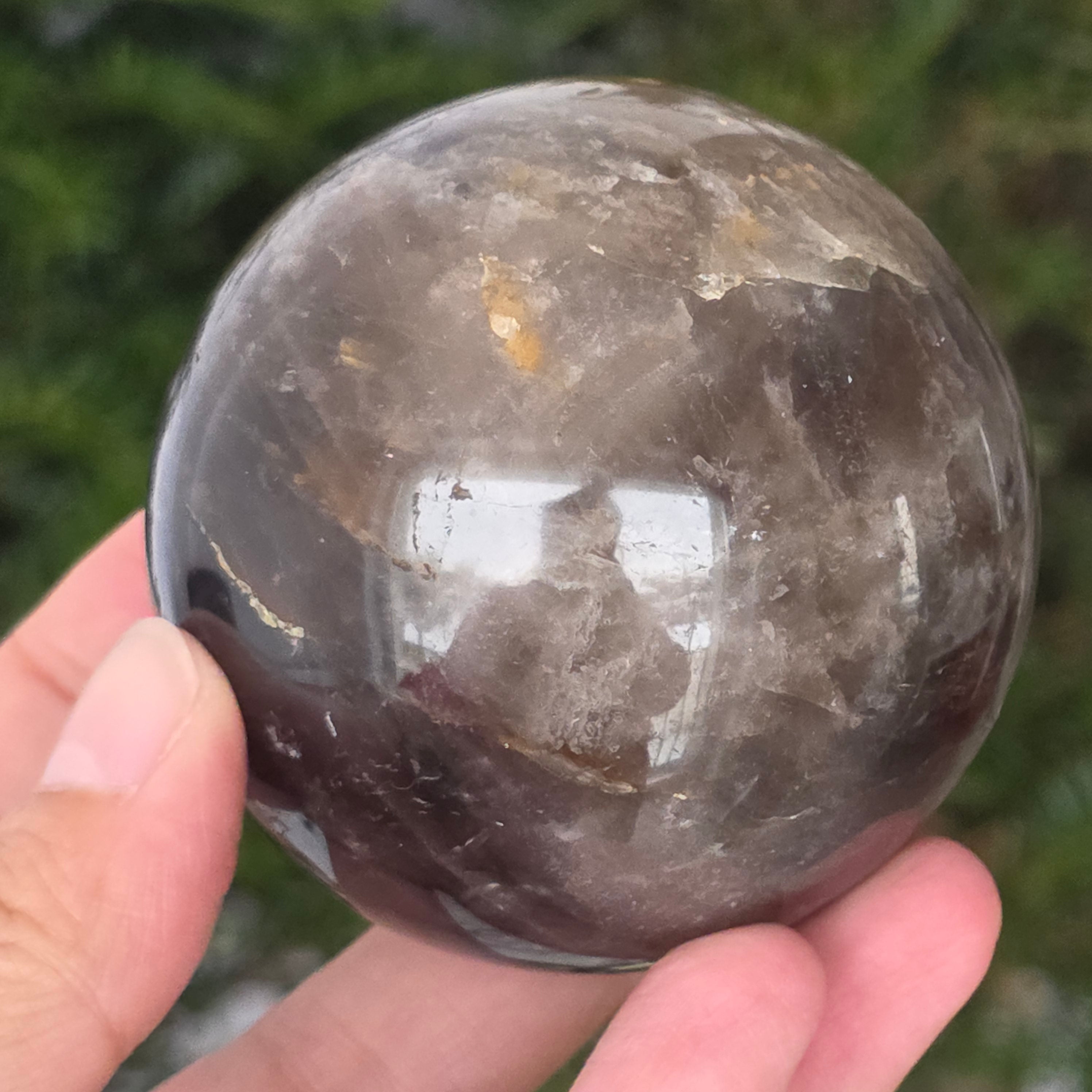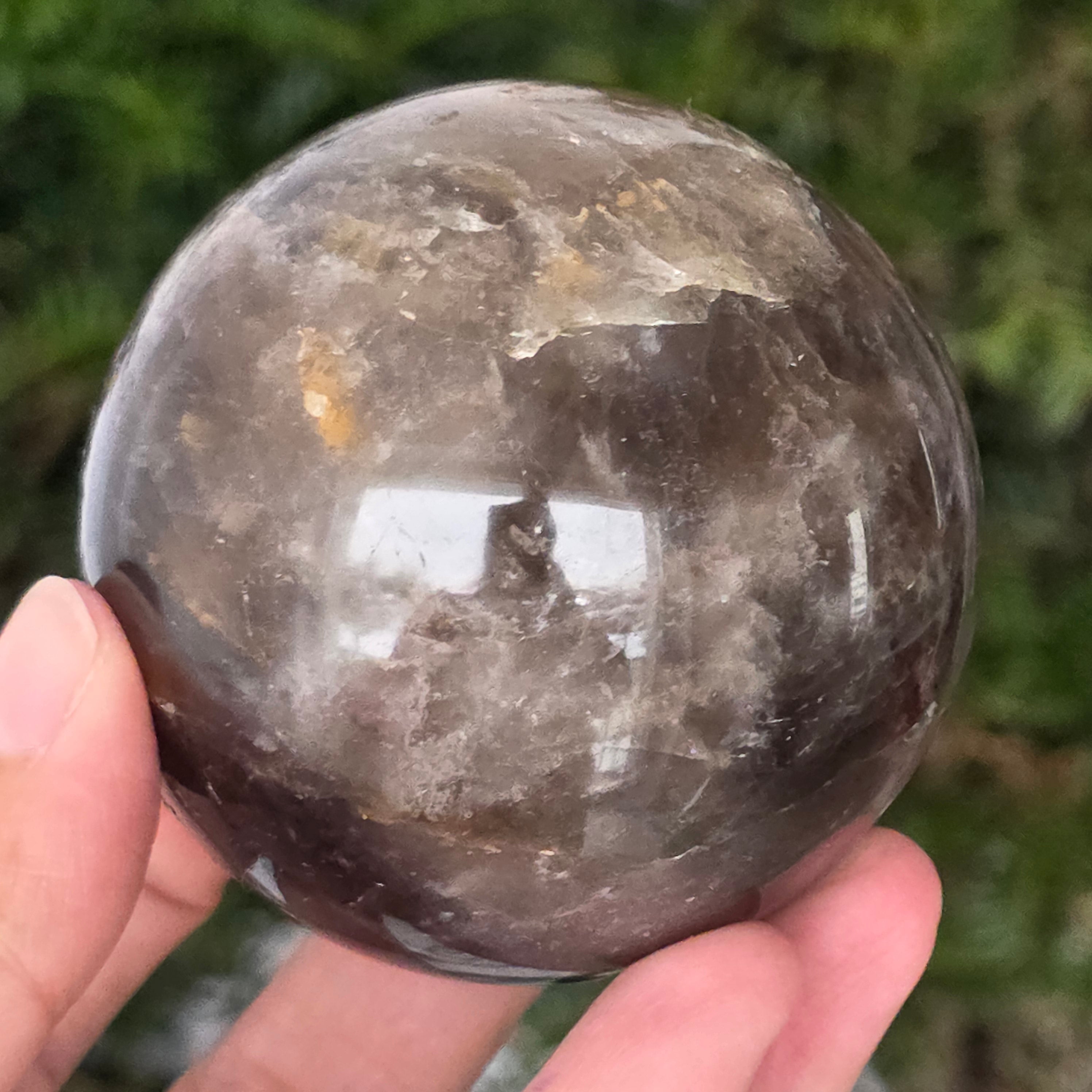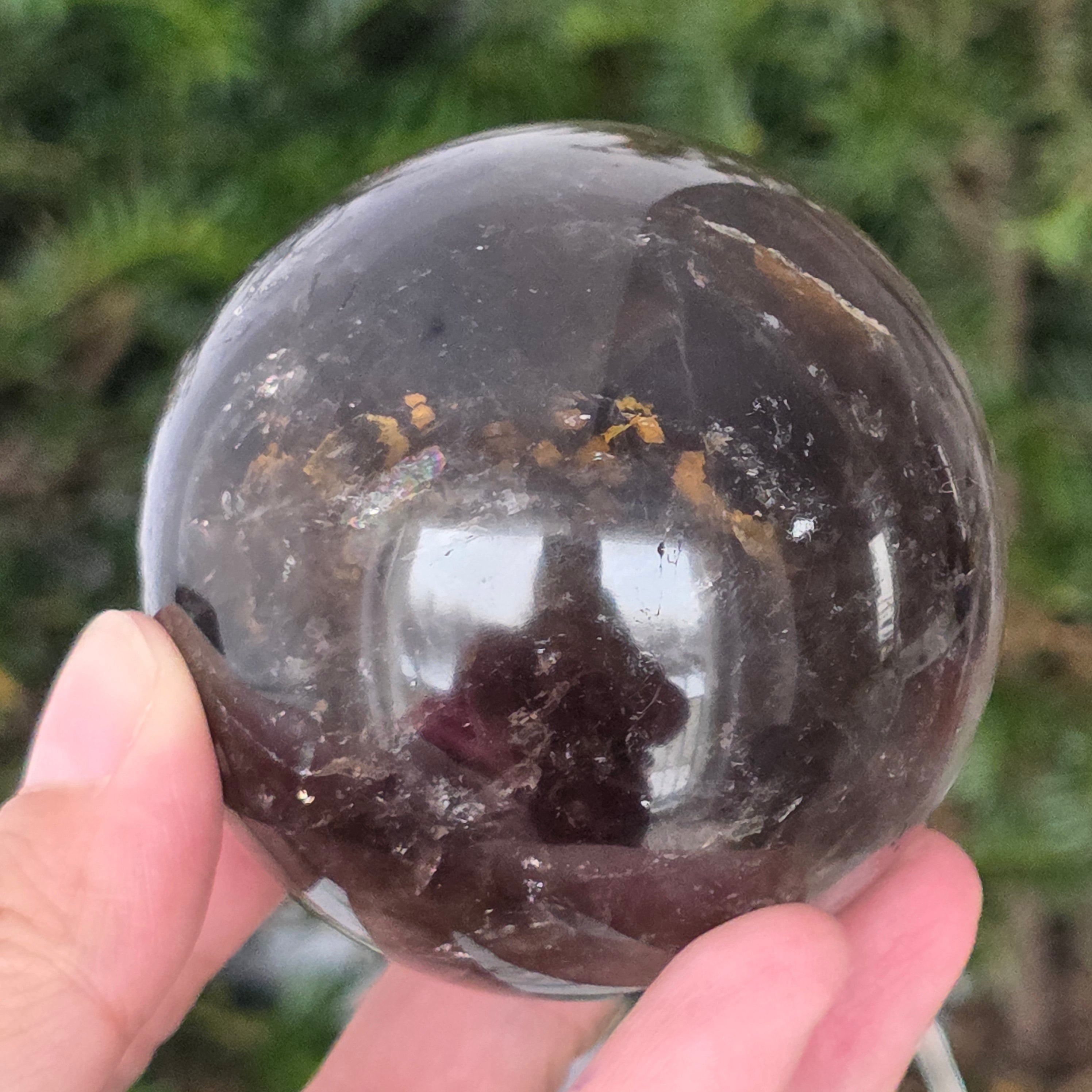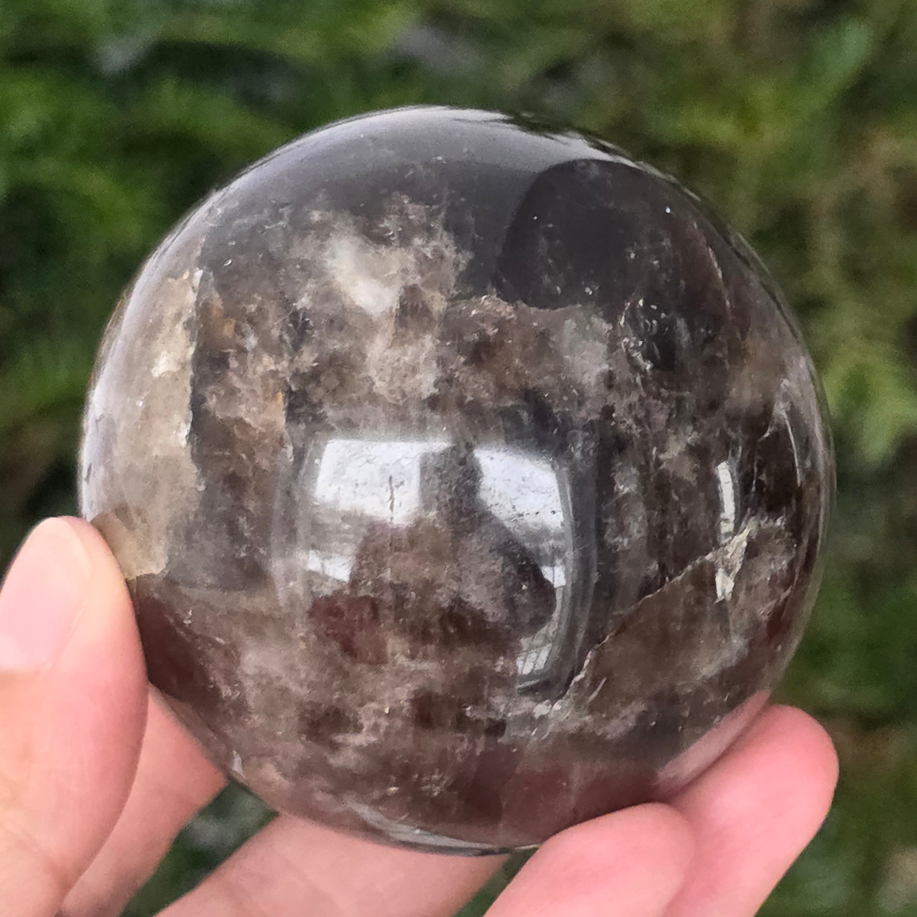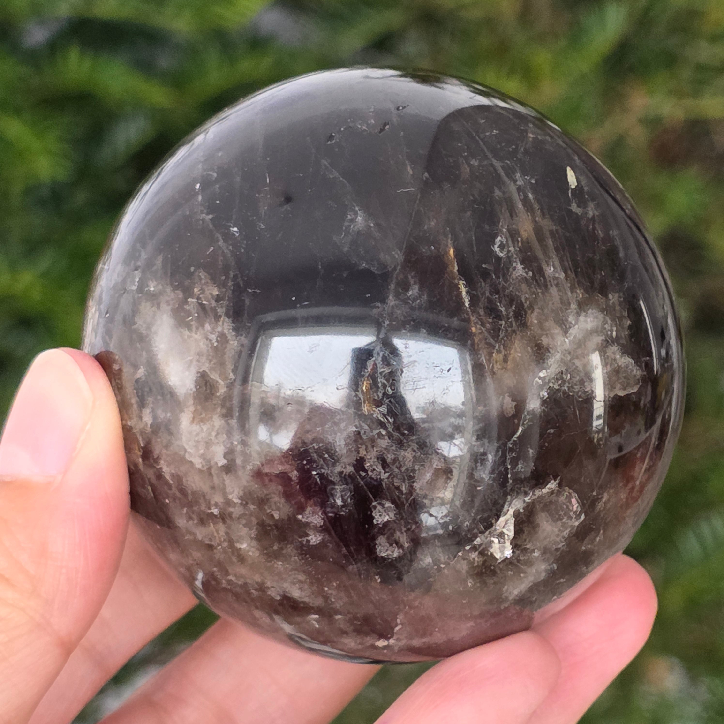 Sfera din cuarț morion este o piesă puternică și elegantă, cunoscută pentru nuanța sa profundă, asemănătoare fumului dens sau obsidianului transparent. Morionul este cea mai închisă varietate de cuarț fumuriu, iar în această formă perfect rotundă dezvăluie reflexii discrete, detalii interne fine și o prezență vizuală cu adevărat sofisticată.