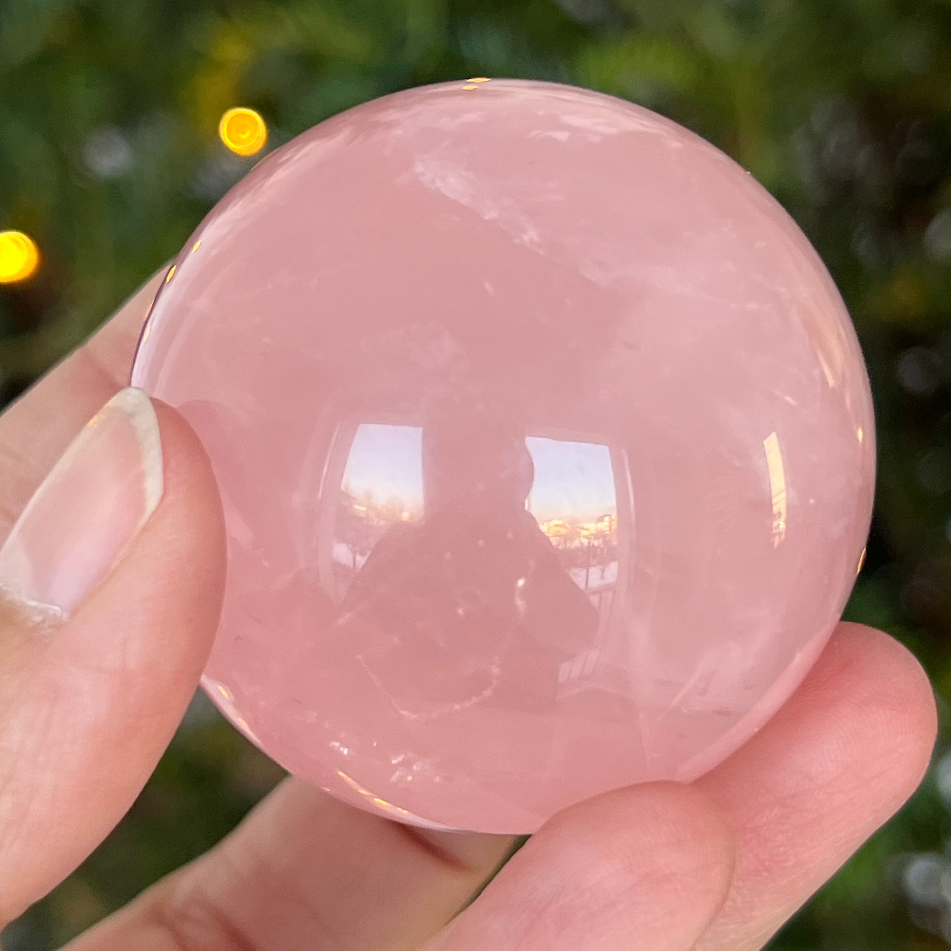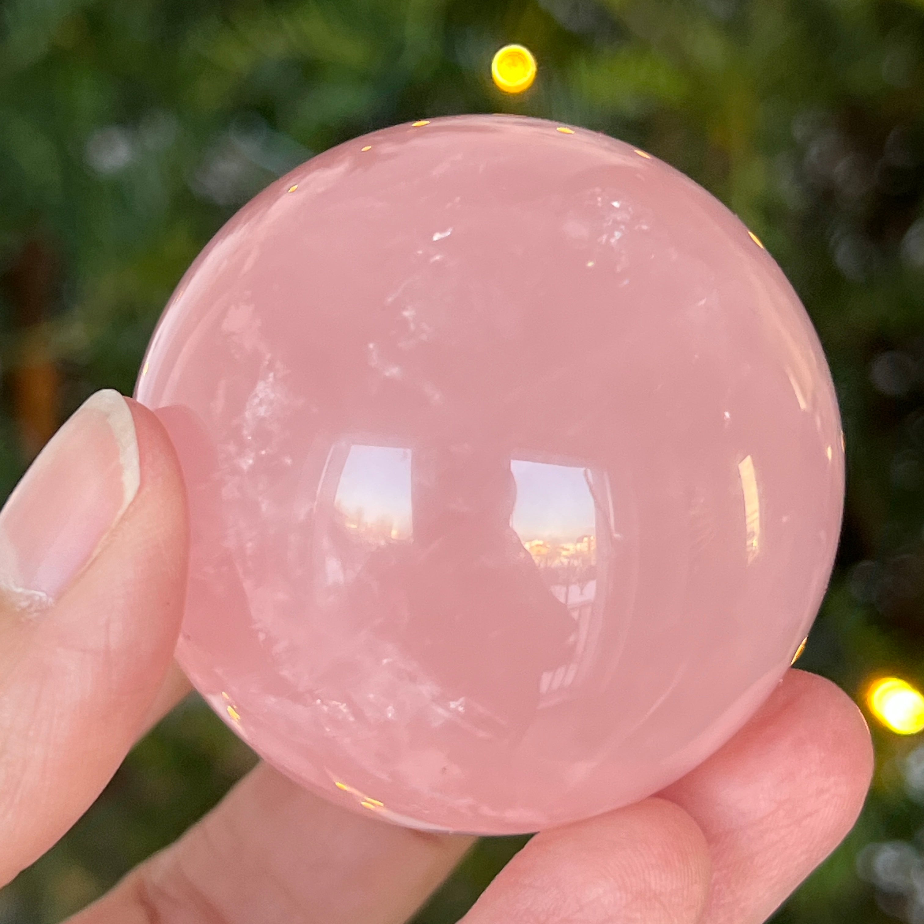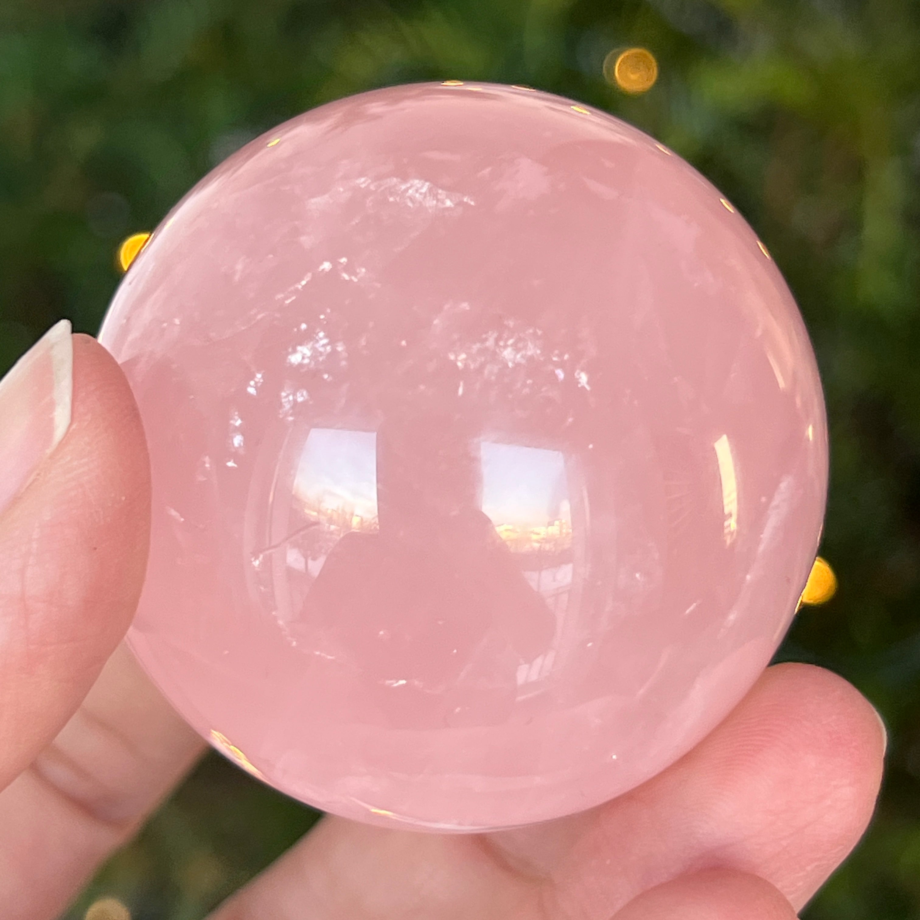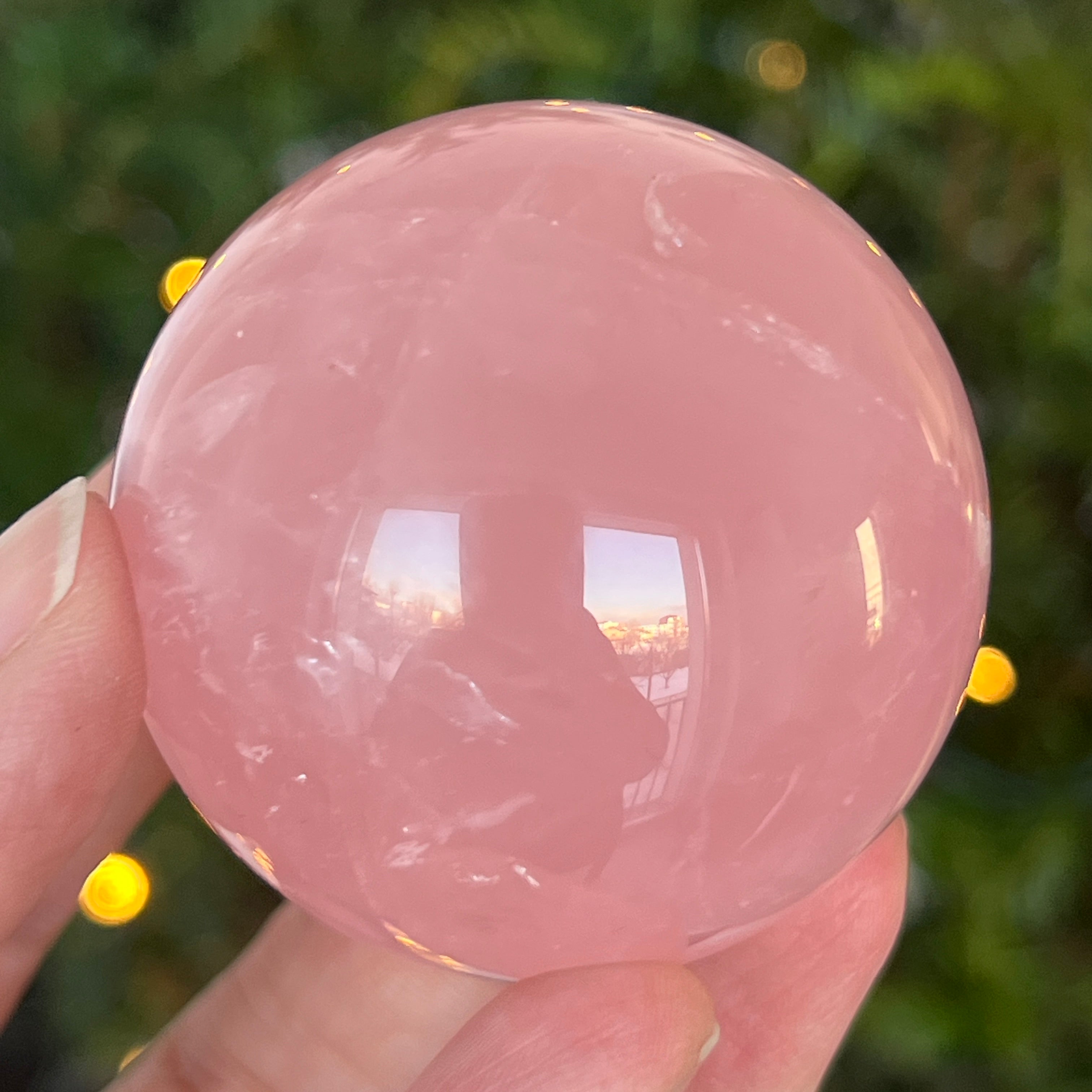 • Piatra: cuarț roz natural cu asterism – sferă șlefuită integral