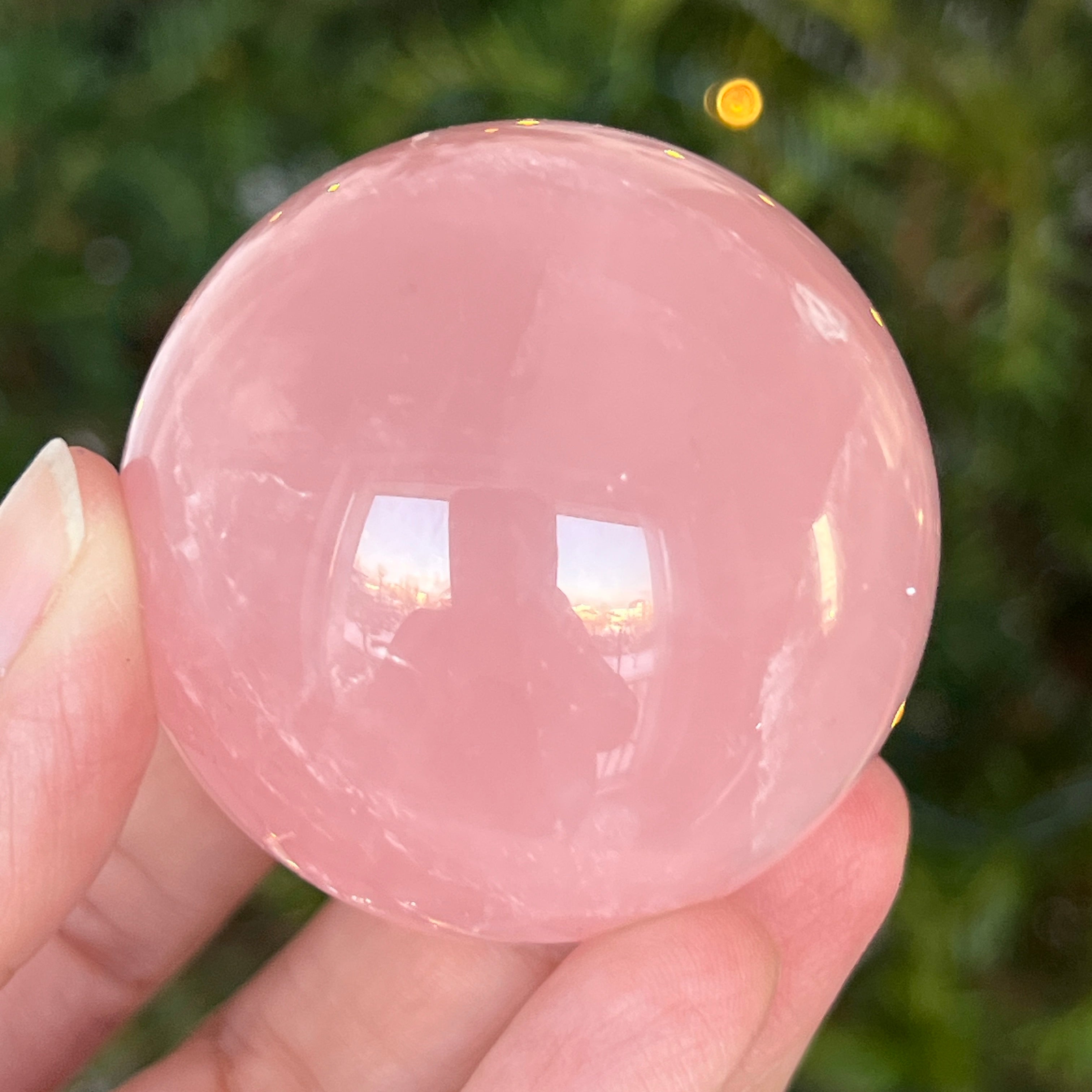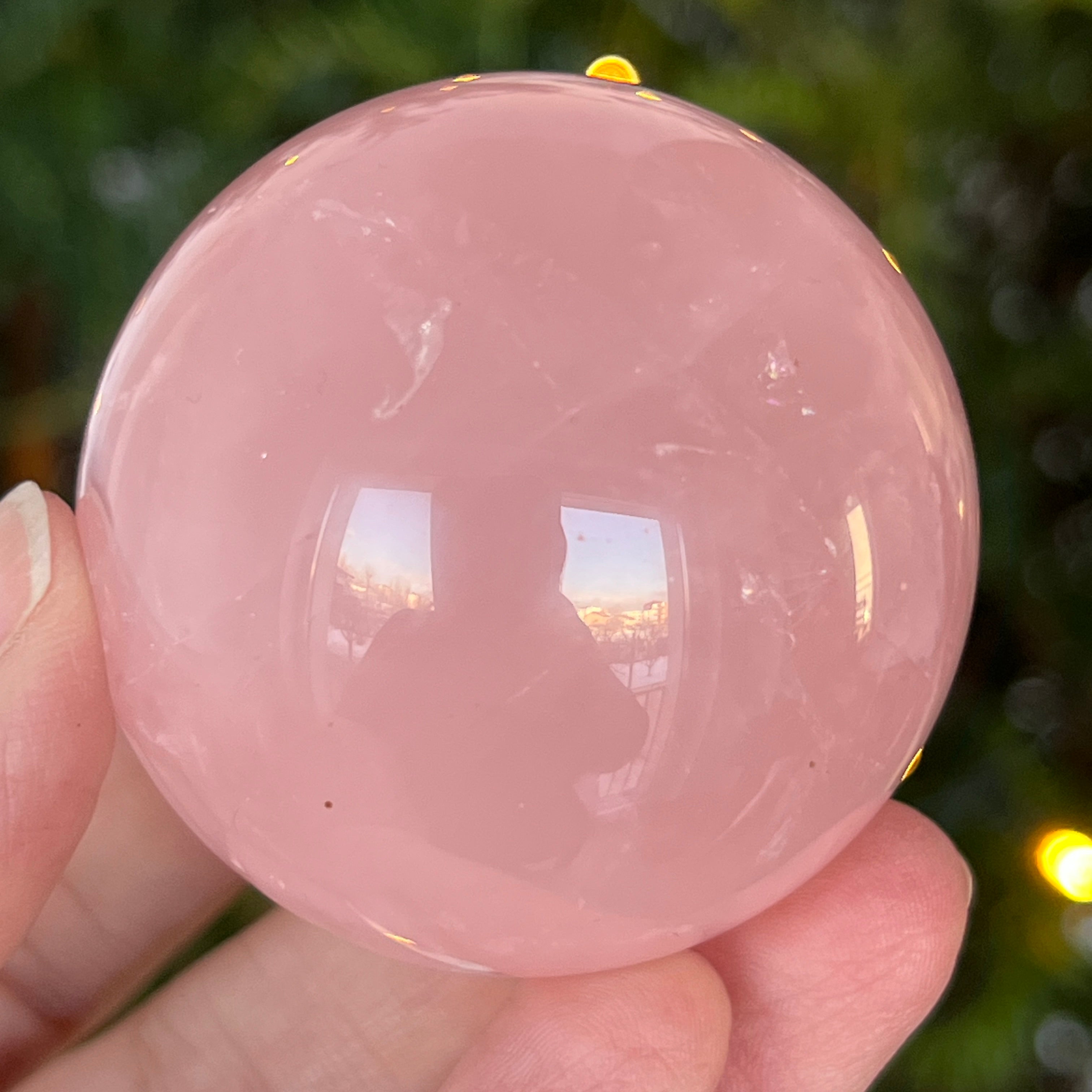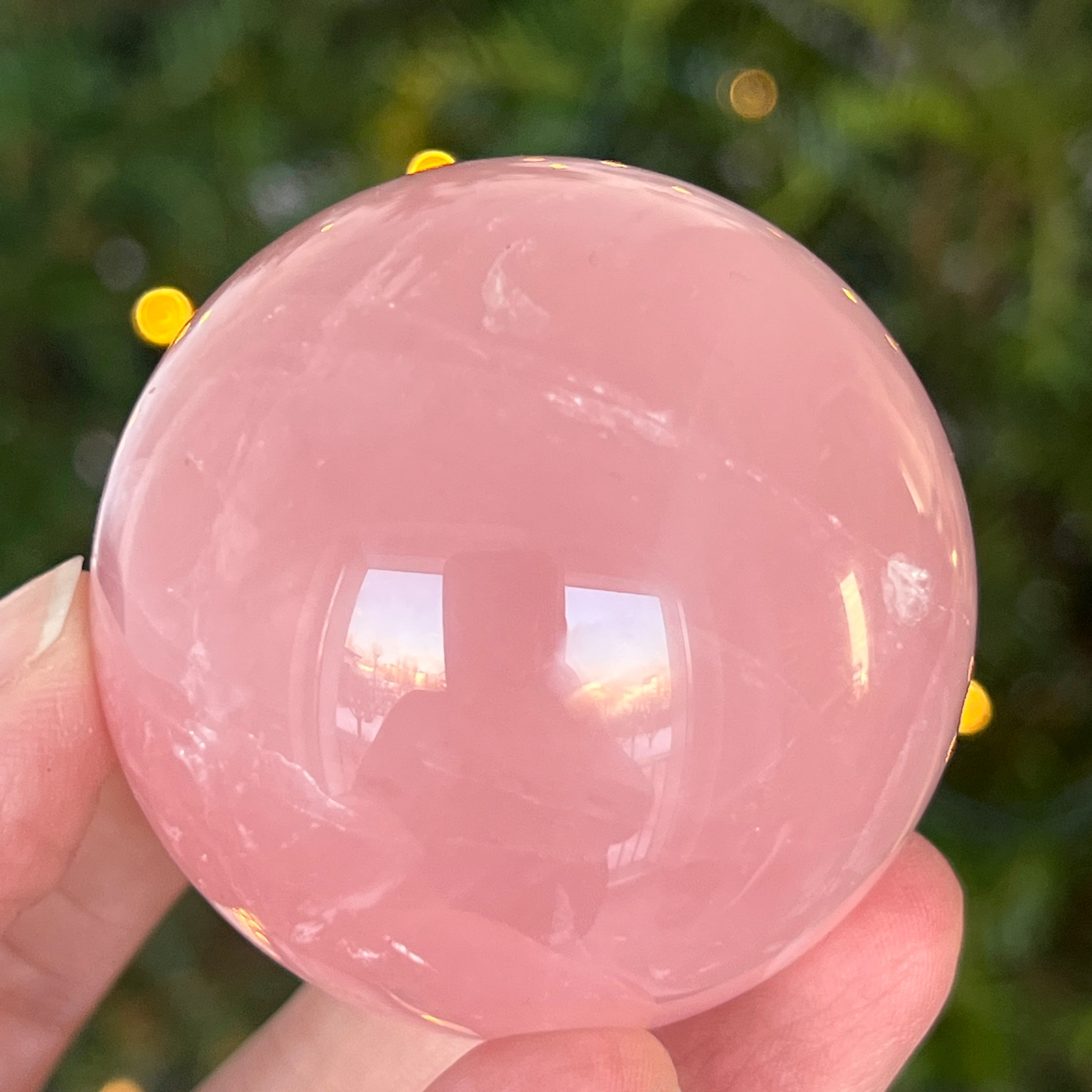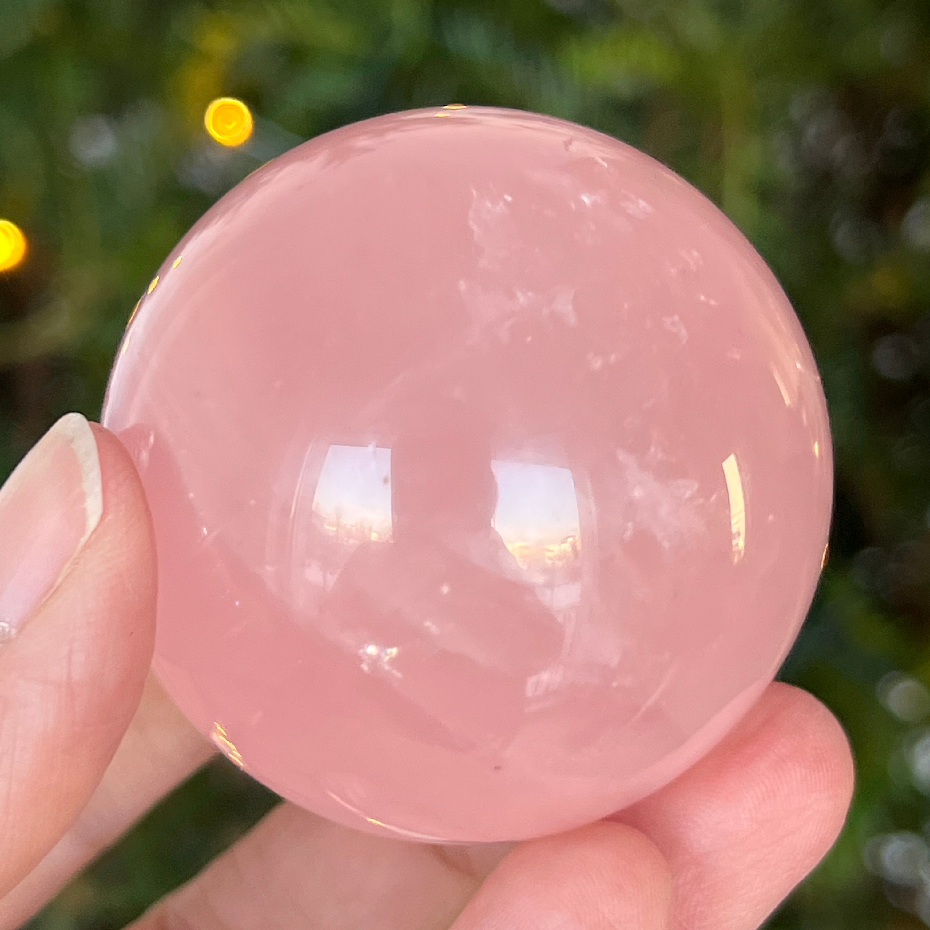 • Piatra: cuarț roz natural cu asterism – sferă șlefuită integral