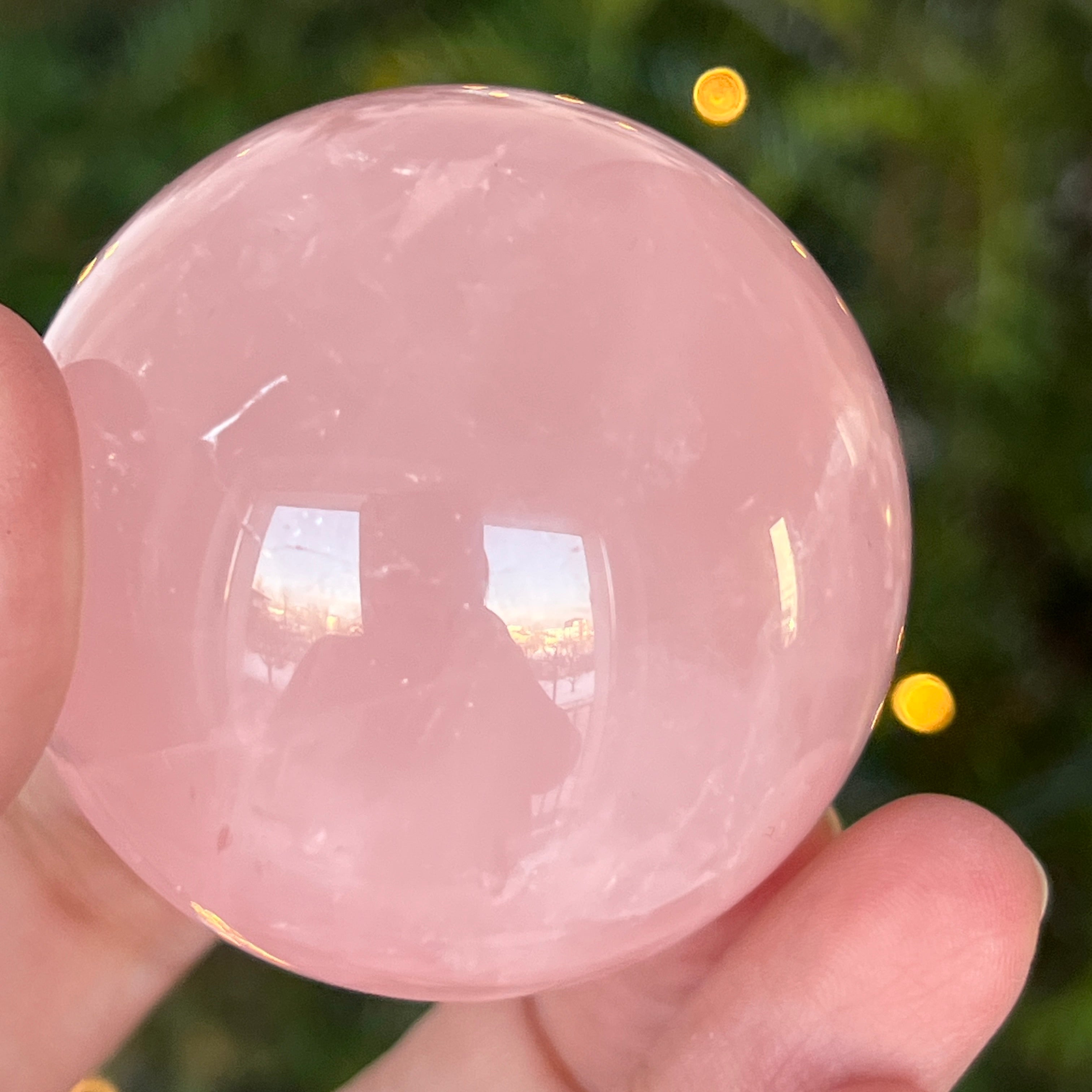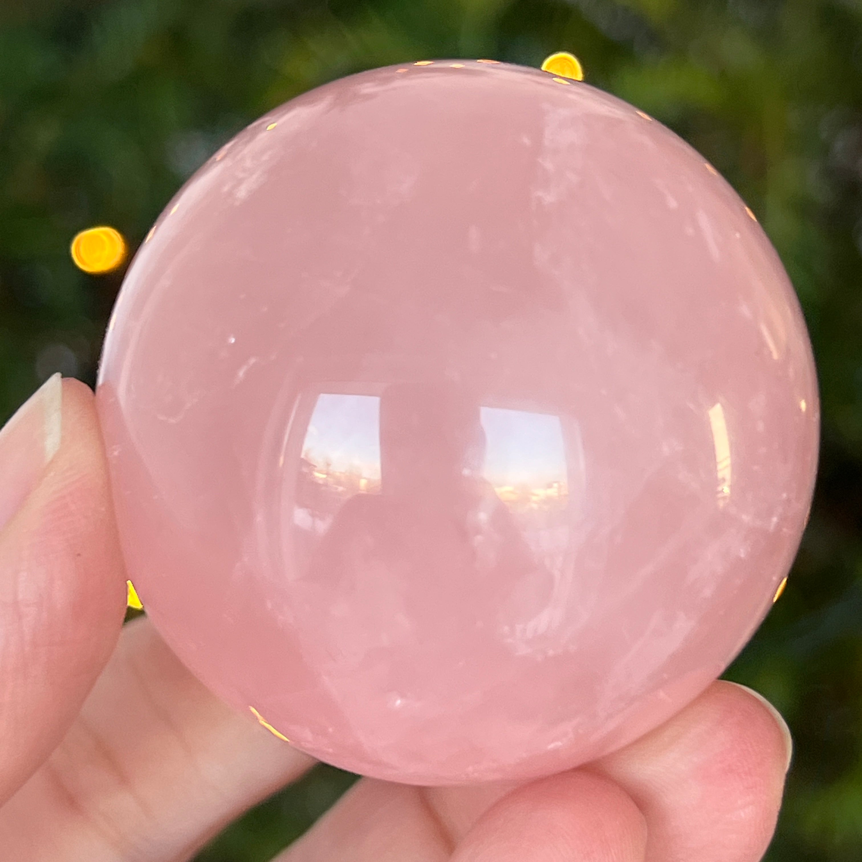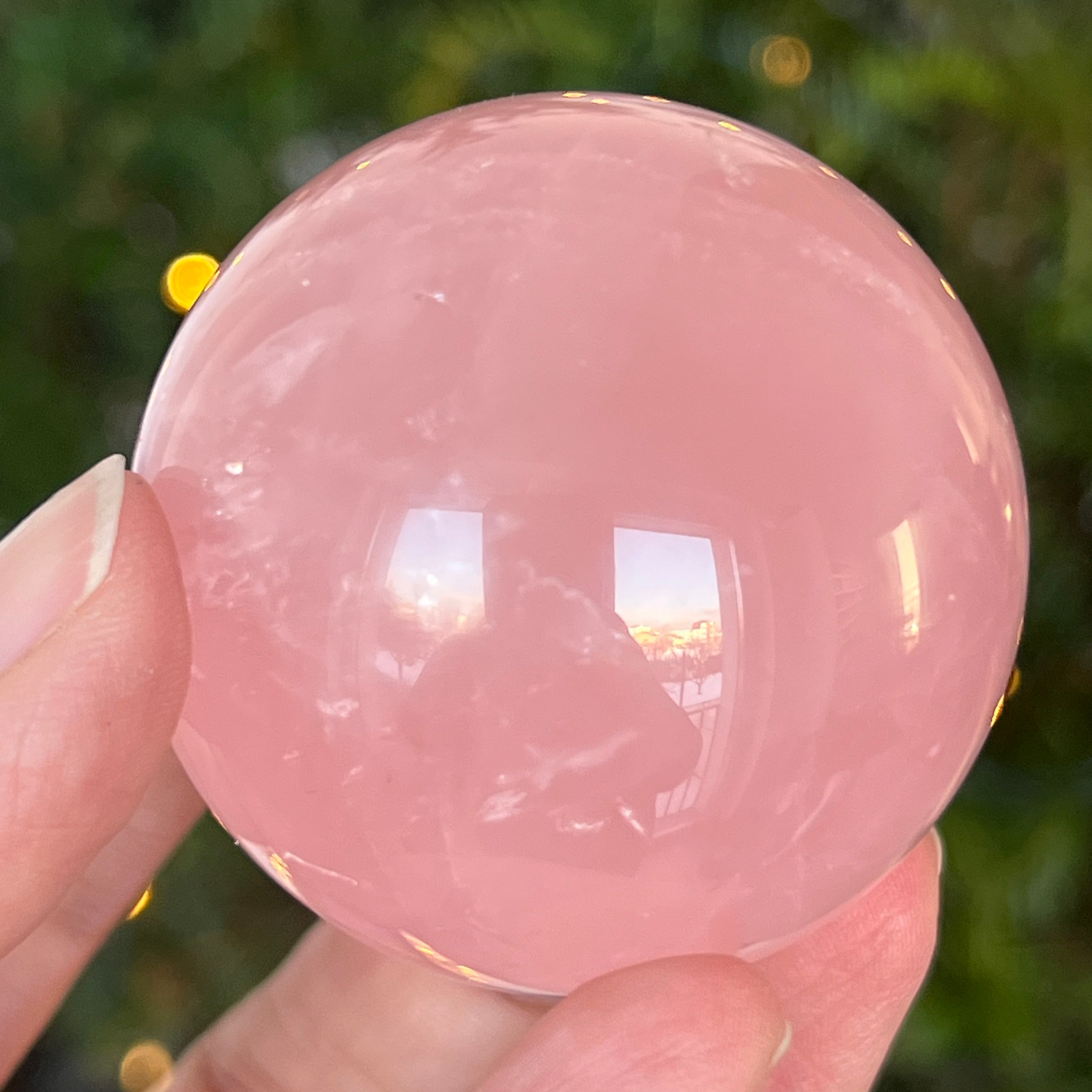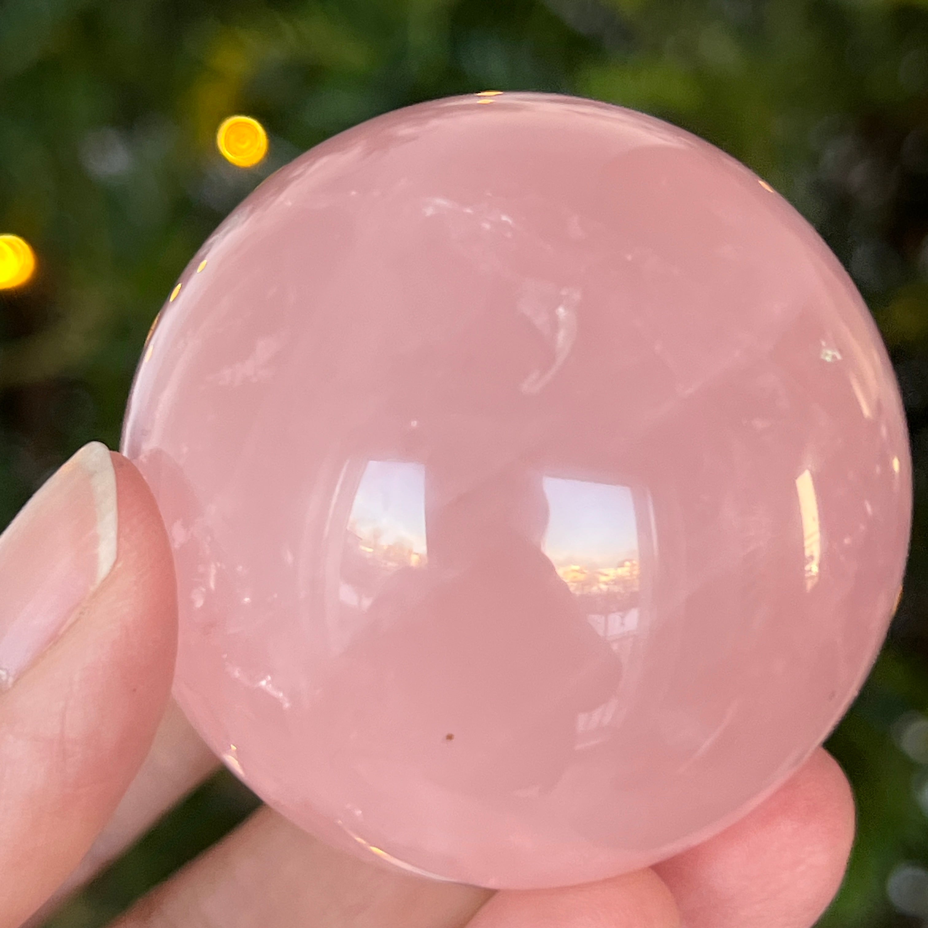 • Piatra: cuarț roz natural cu asterism – sferă șlefuită integral