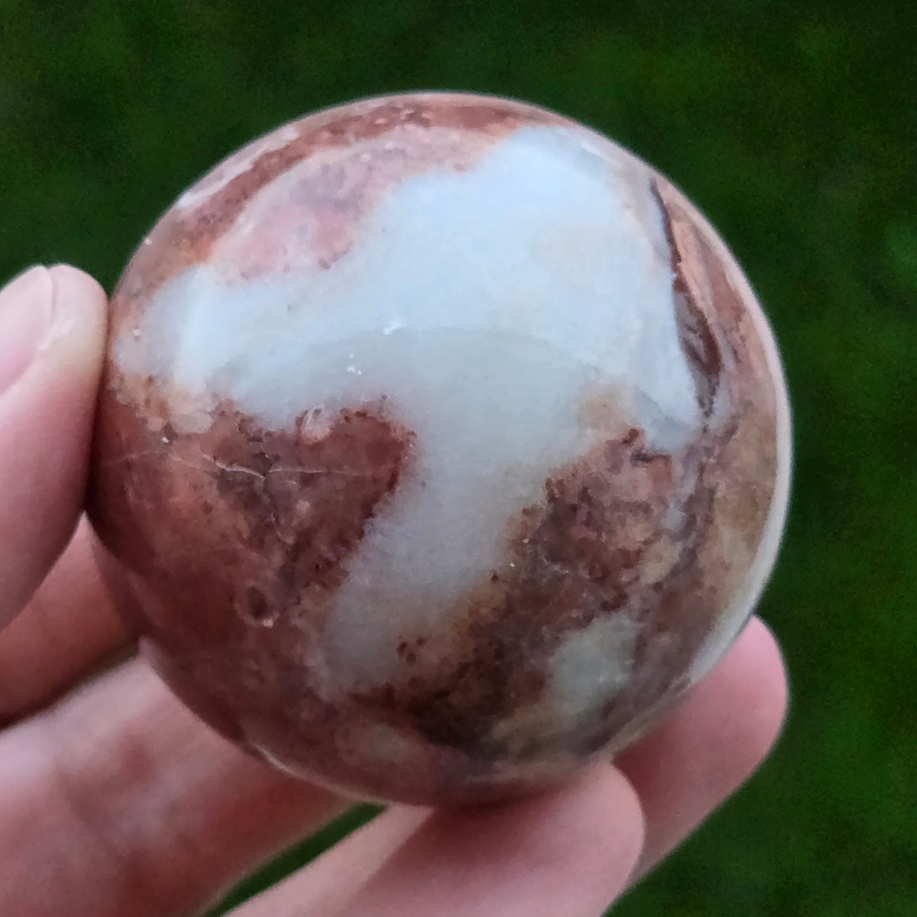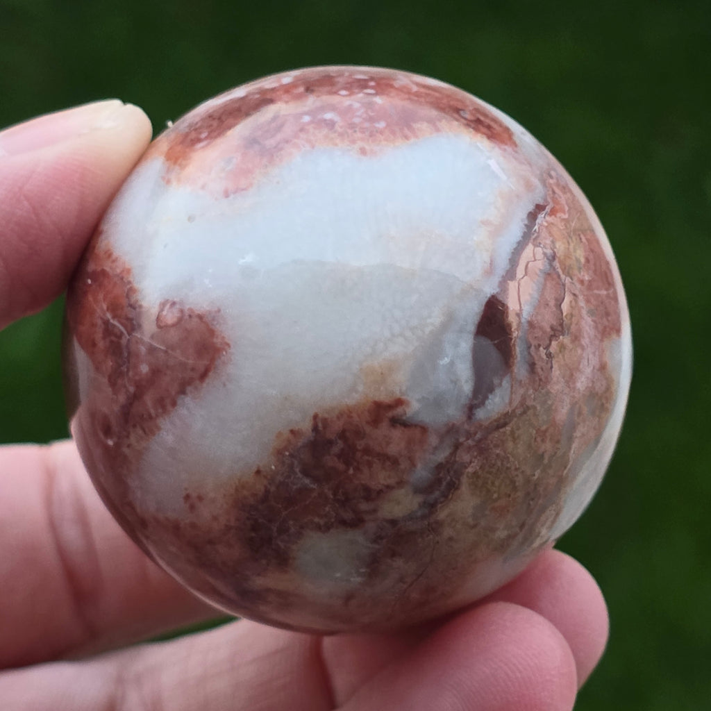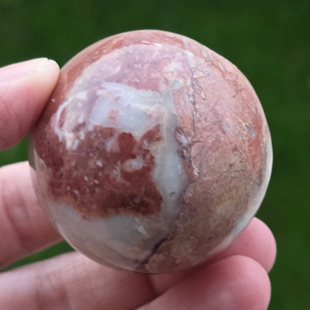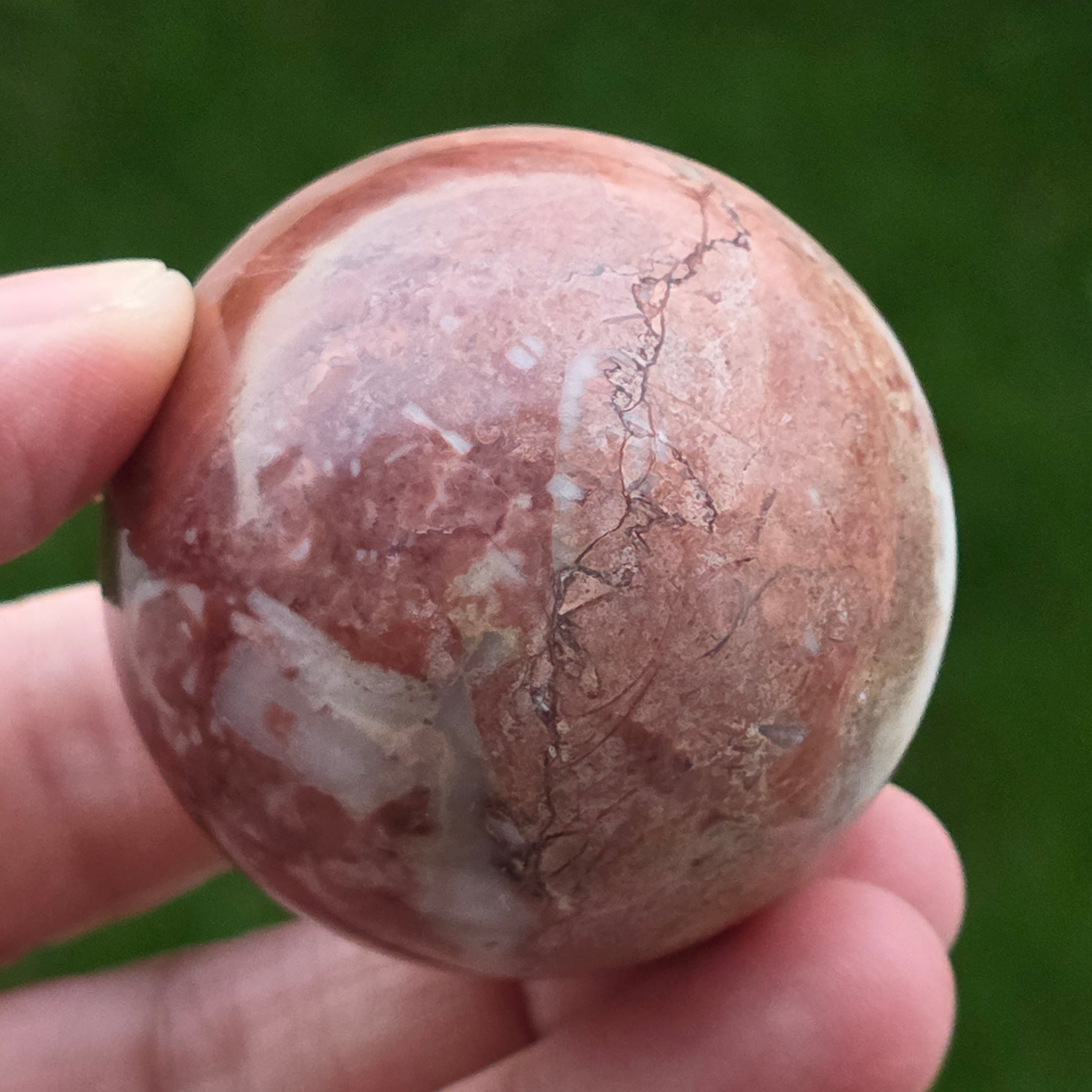 Sfera din Jasp Căpșună este o piesă vibrantă și expresivă, sculptată cu atenție pentru a evidenția nuanțele calde de roșu căpșună, texturile organice și desenul mineral specific acestei varietăți de jasp. Fiecare piesă este complet unică, cu modele naturale care se împletesc în forme fluide, evocând stratificarea rocilor și frumusețea lor brută.