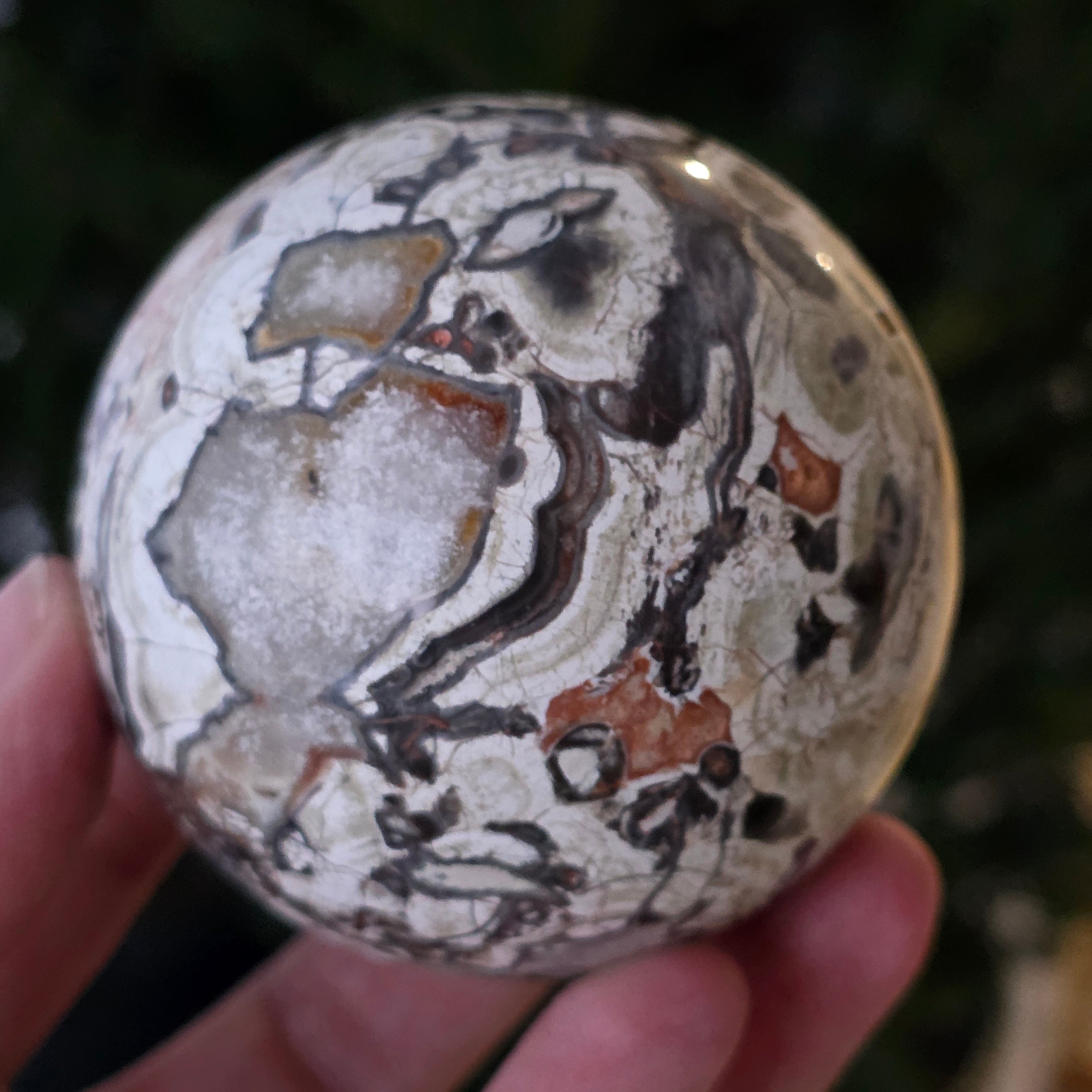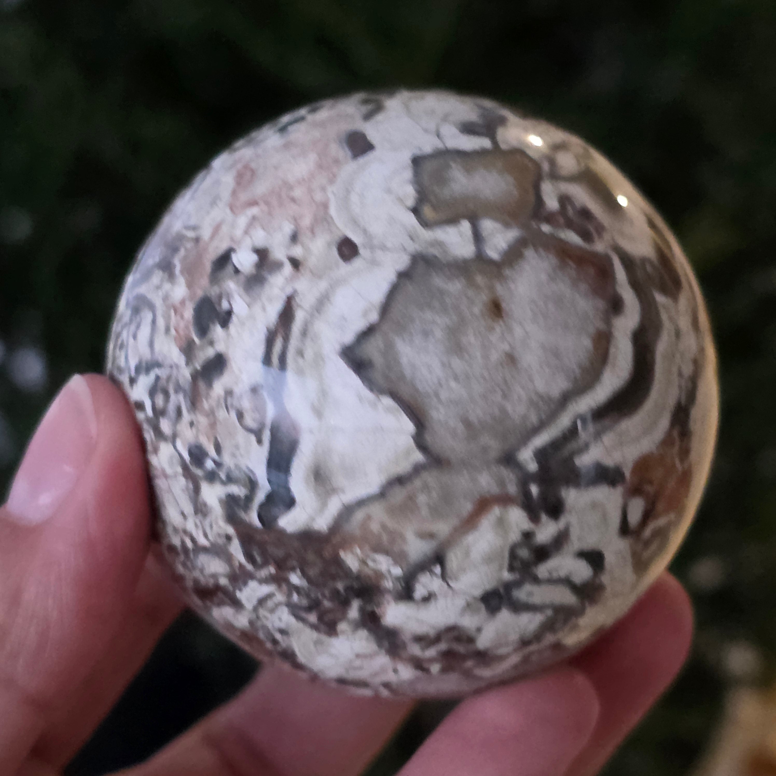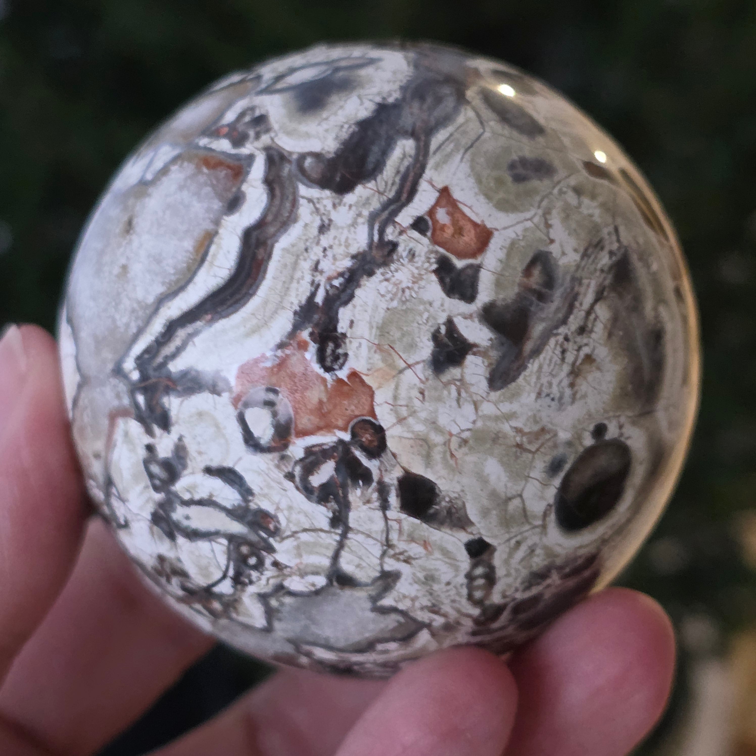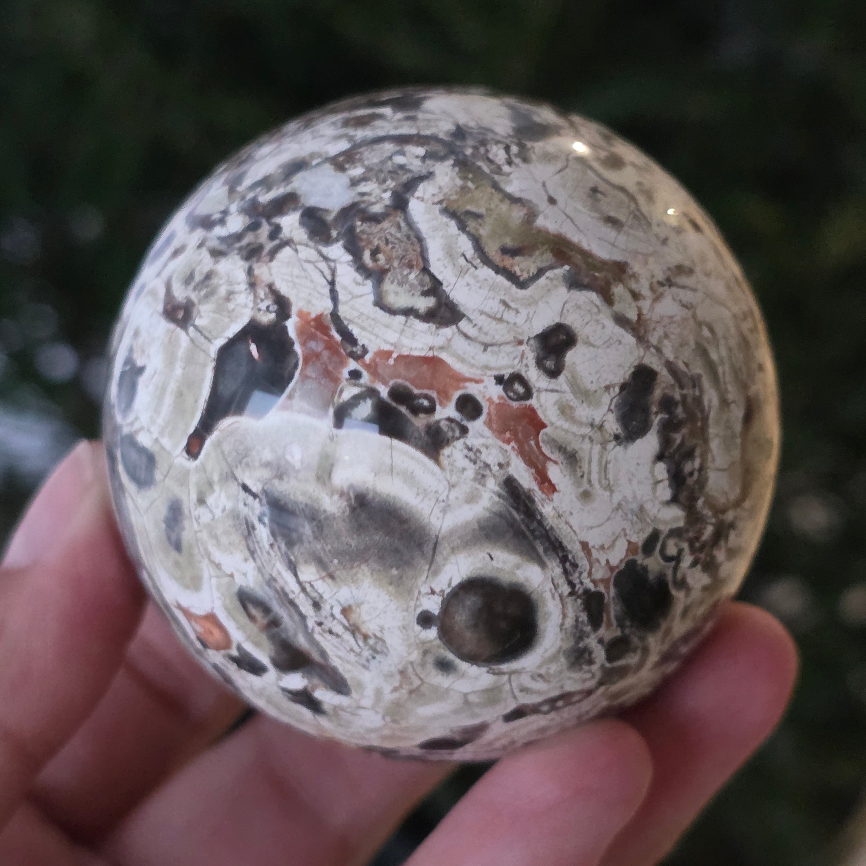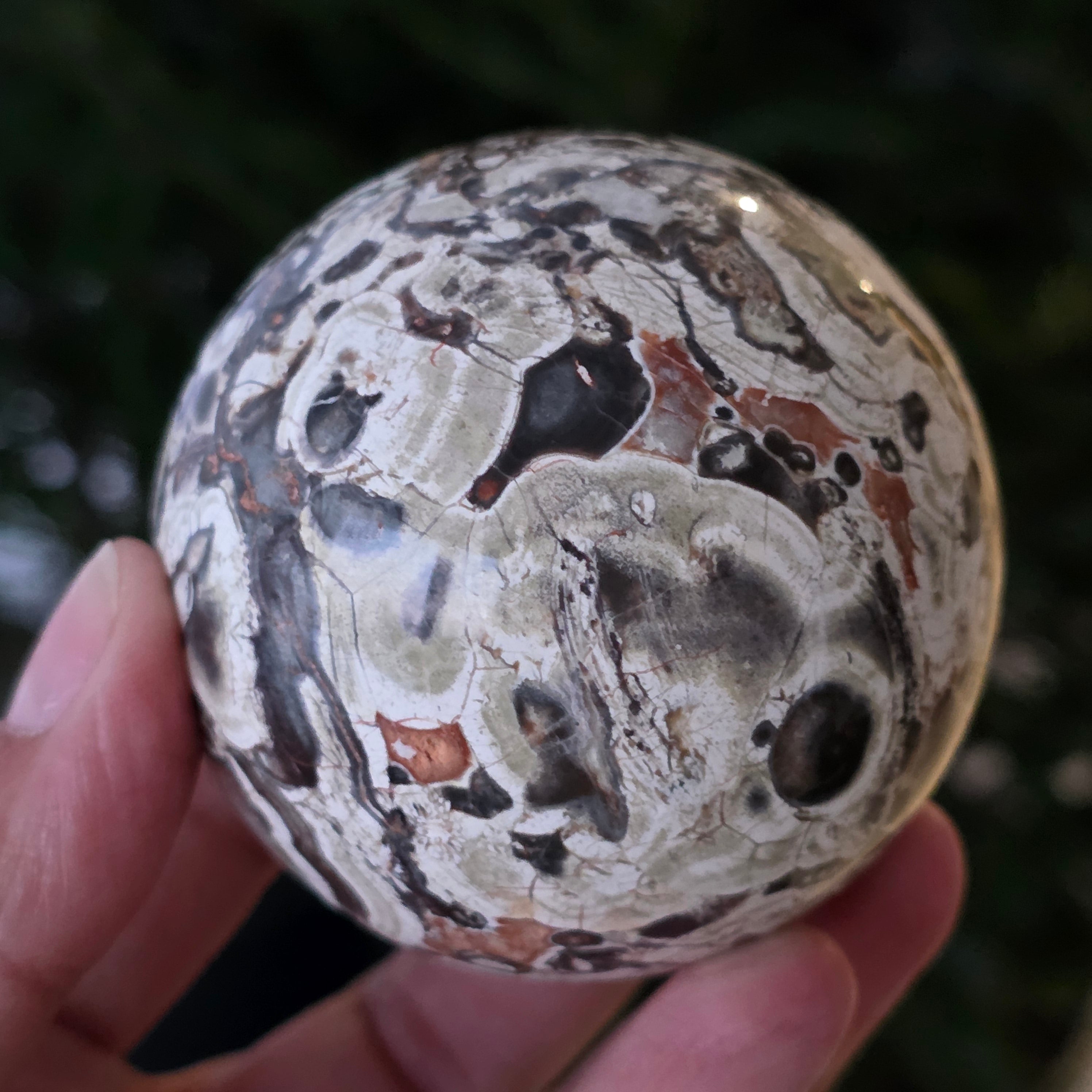 Sfera din jasp roșu breccia este asociată cu stabilitatea, vitalitatea și ancorarea în prezent, combinând energia protectoare a jaspului cu dinamismul fragmentelor unite în mod natural. Forma sferică sugerează echilibru și continuitate, susținând o stare de siguranță interioară și forță calmă.