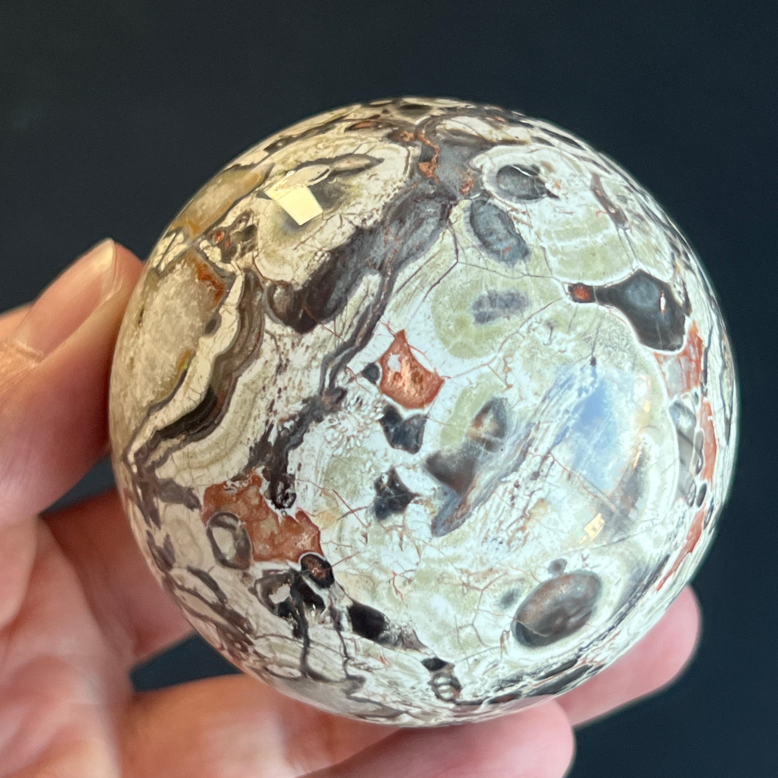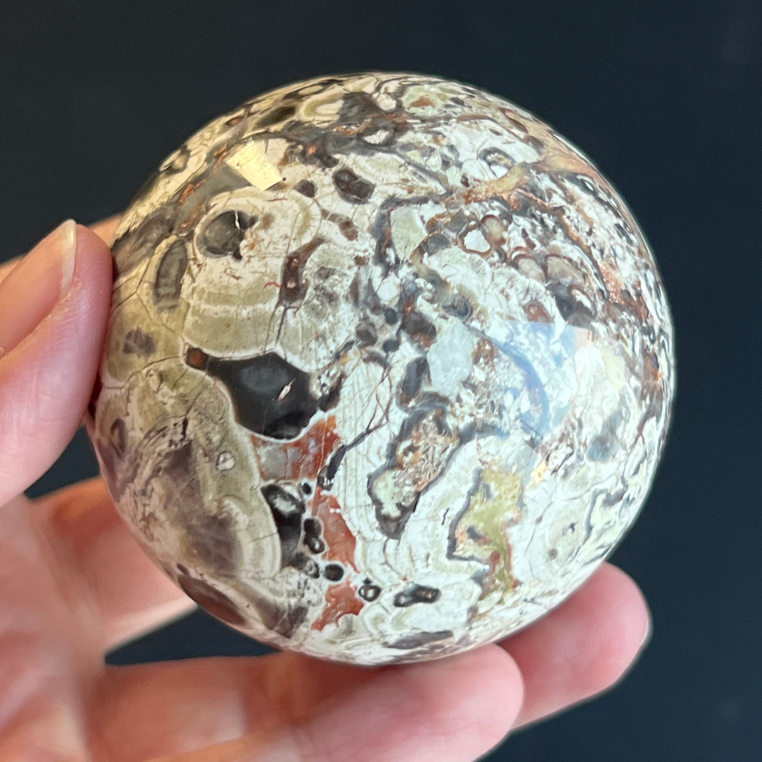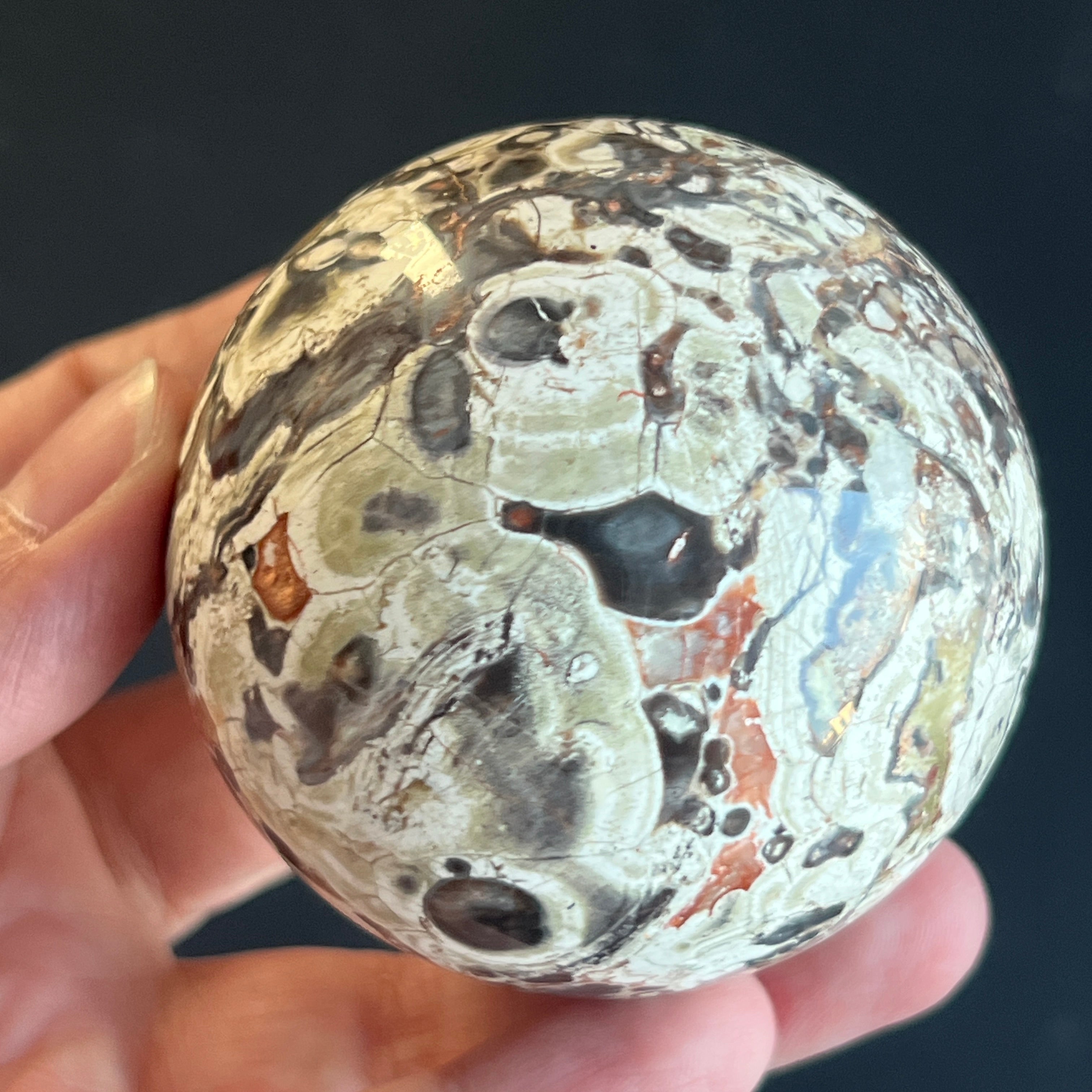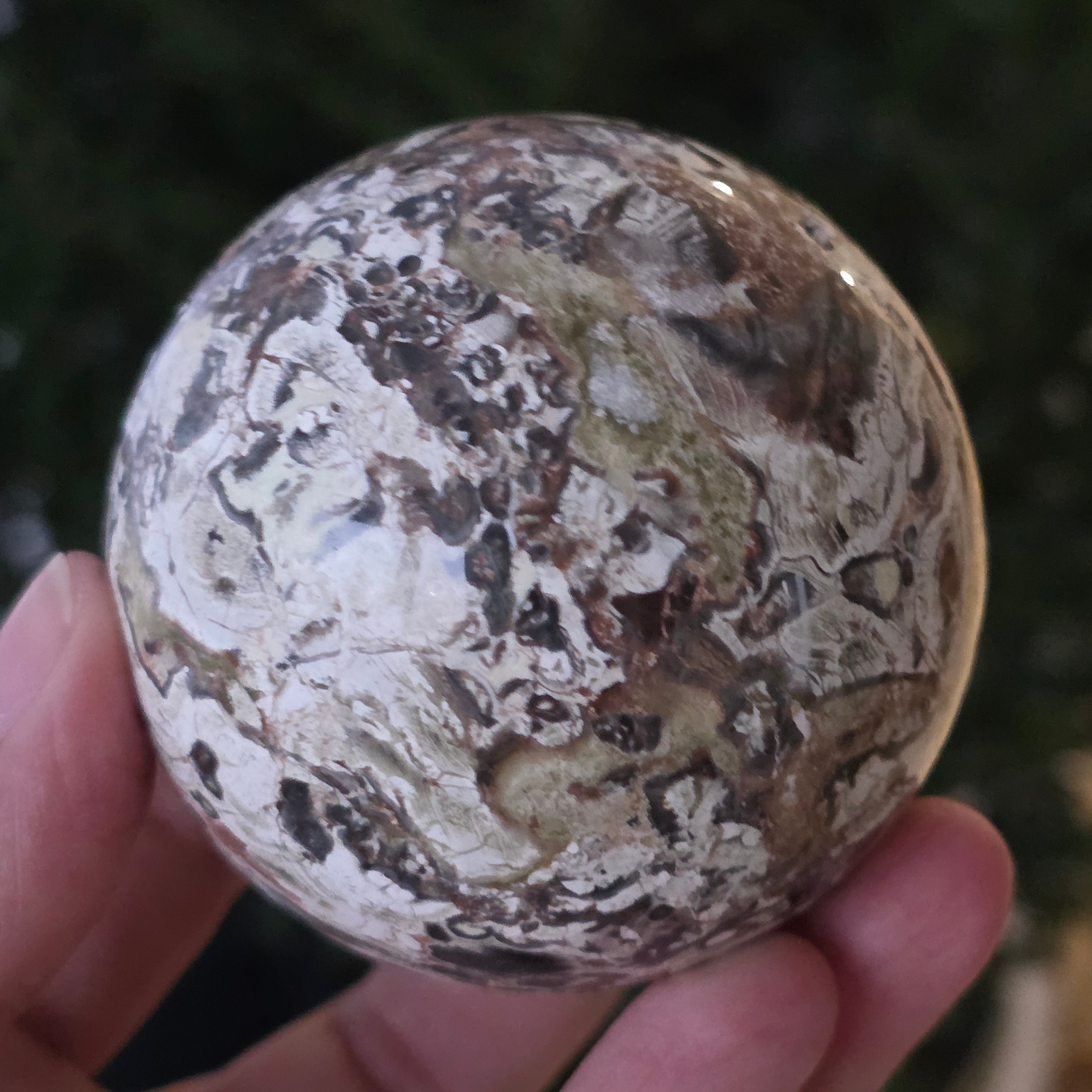 Sfera din jasp roșu breccia este asociată cu stabilitatea, vitalitatea și ancorarea în prezent, combinând energia protectoare a jaspului cu dinamismul fragmentelor unite în mod natural. Forma sferică sugerează echilibru și continuitate, susținând o stare de siguranță interioară și forță calmă.