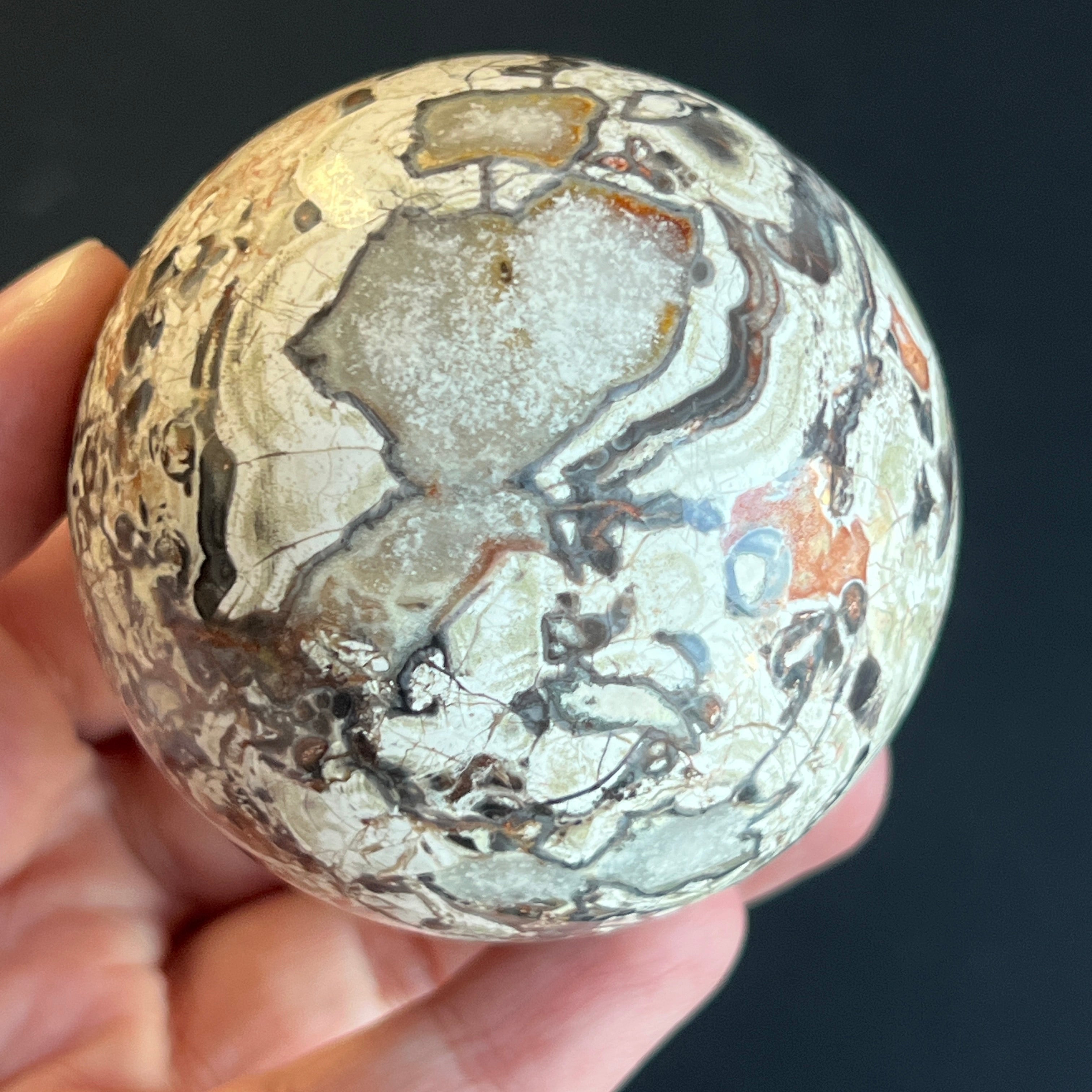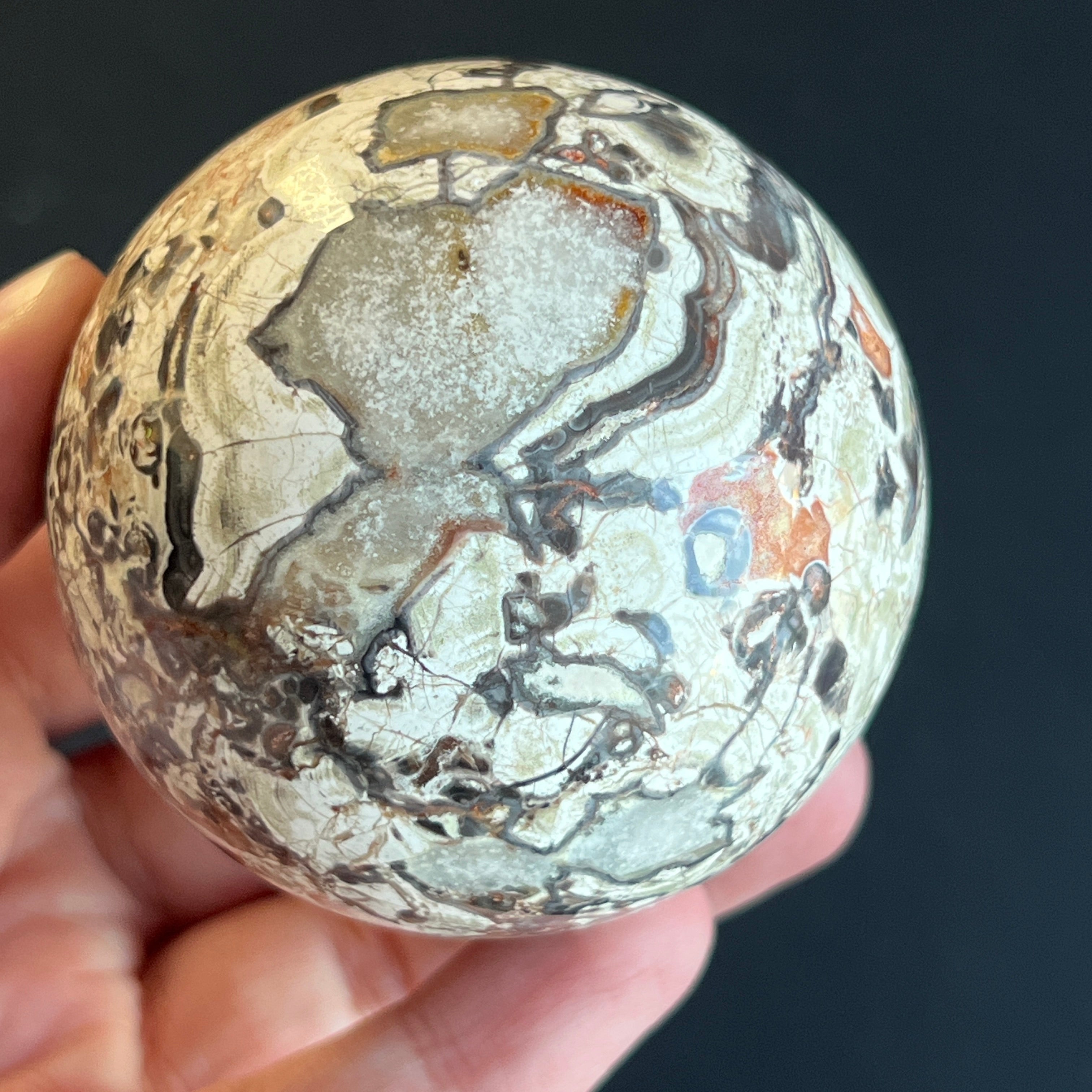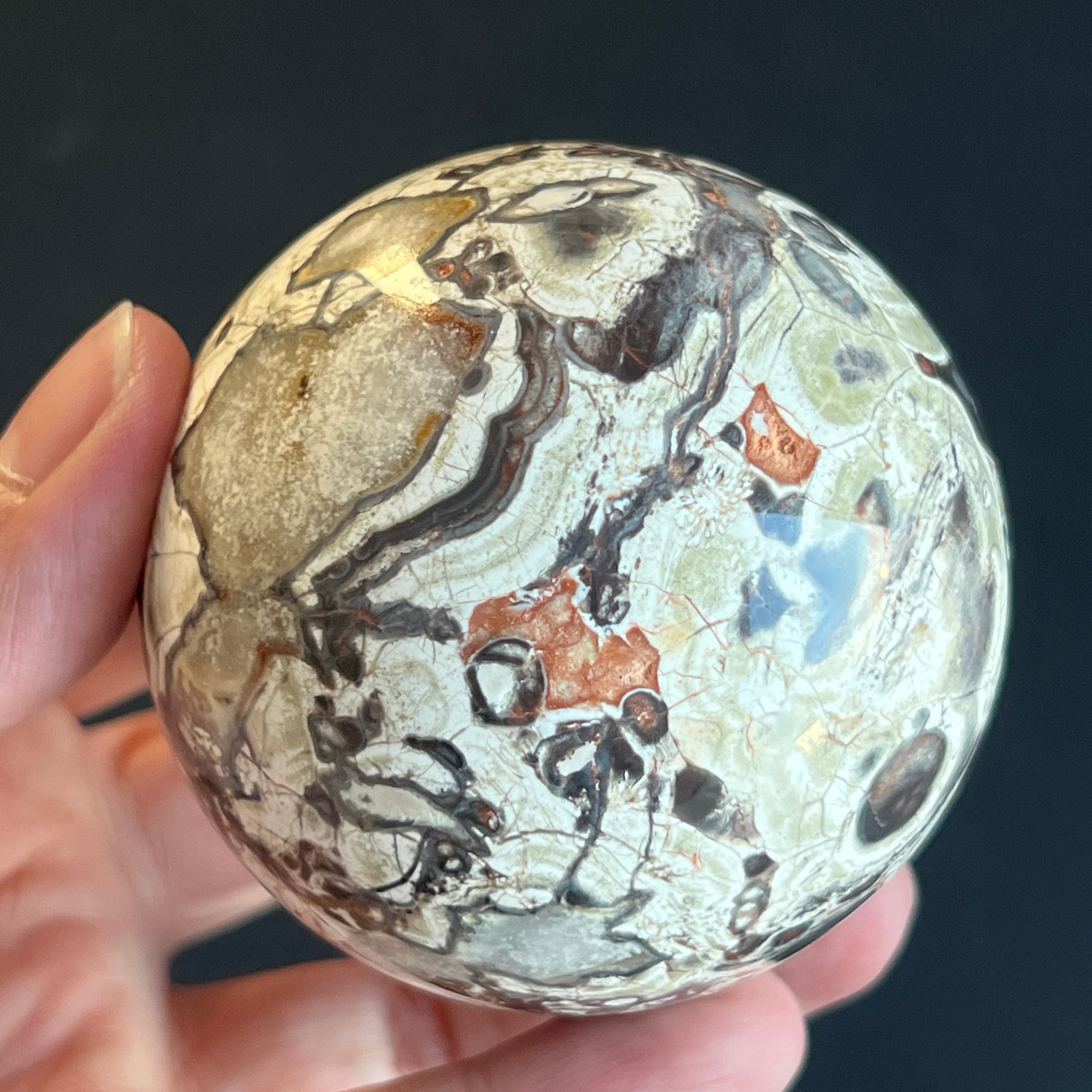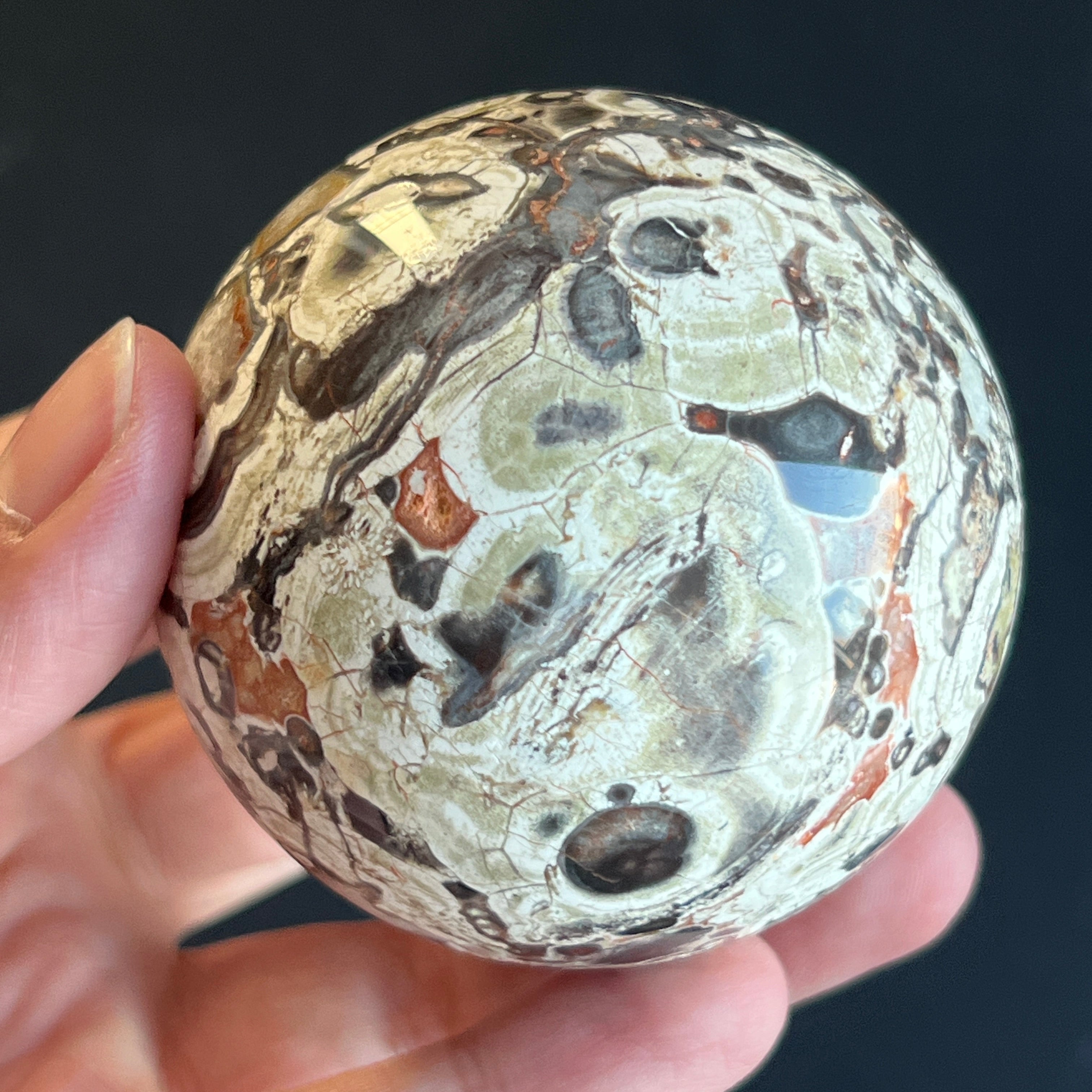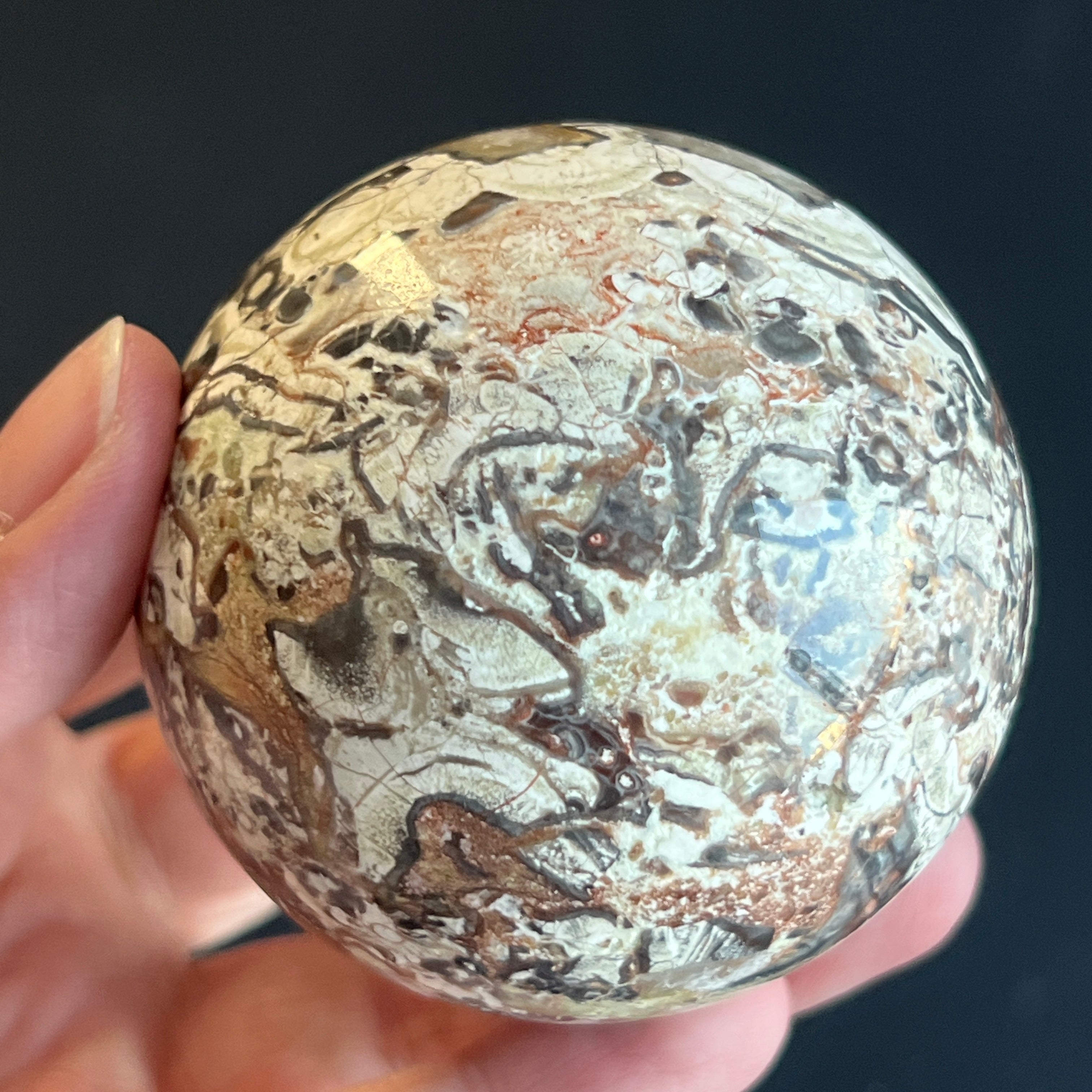 Sfera din jasp roșu breccia este asociată cu stabilitatea, vitalitatea și ancorarea în prezent, combinând energia protectoare a jaspului cu dinamismul fragmentelor unite în mod natural. Forma sferică sugerează echilibru și continuitate, susținând o stare de siguranță interioară și forță calmă.
