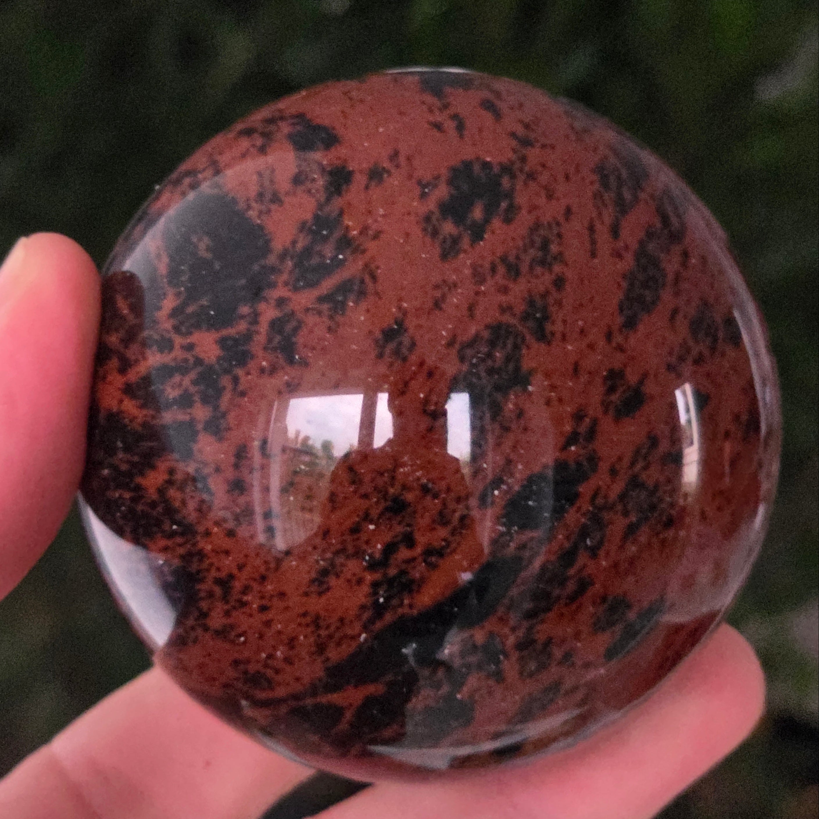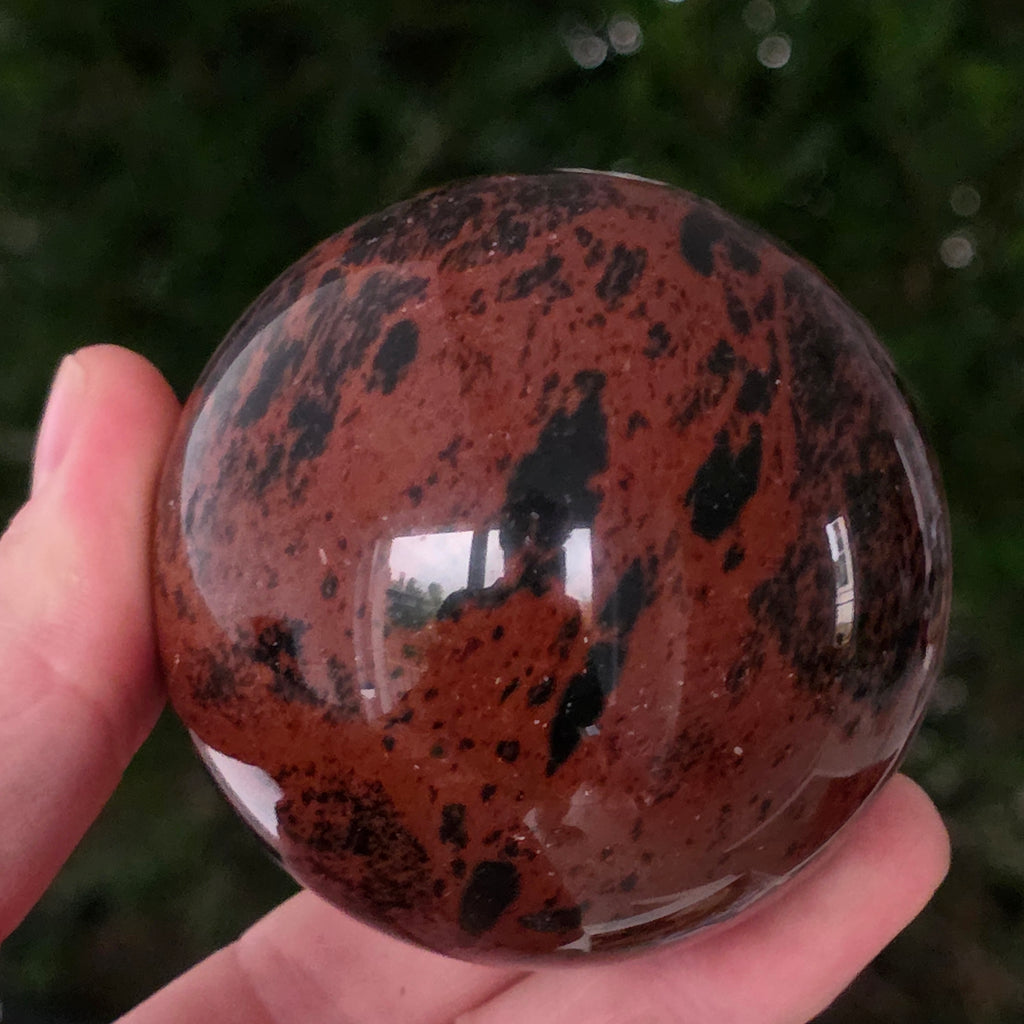 Această sferă din obsidian mahon este o întrupare a forței primordiale a Pământului — o piatră a rădăcinilor, a siguranței și a transformării interioare.