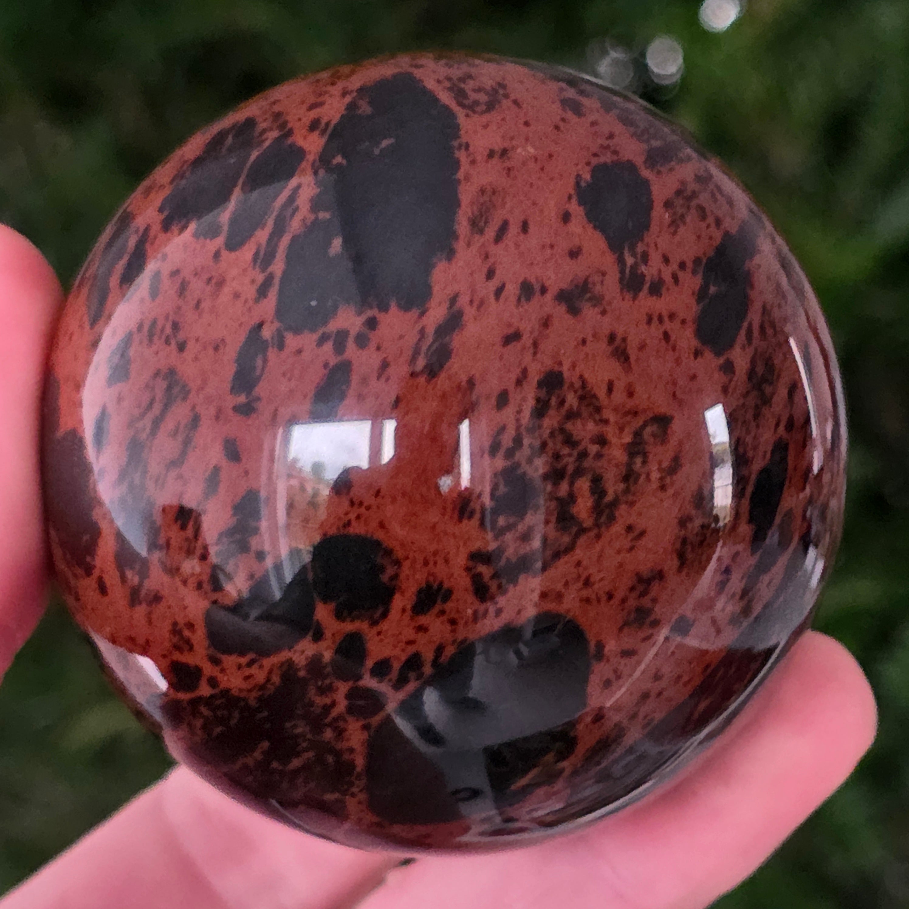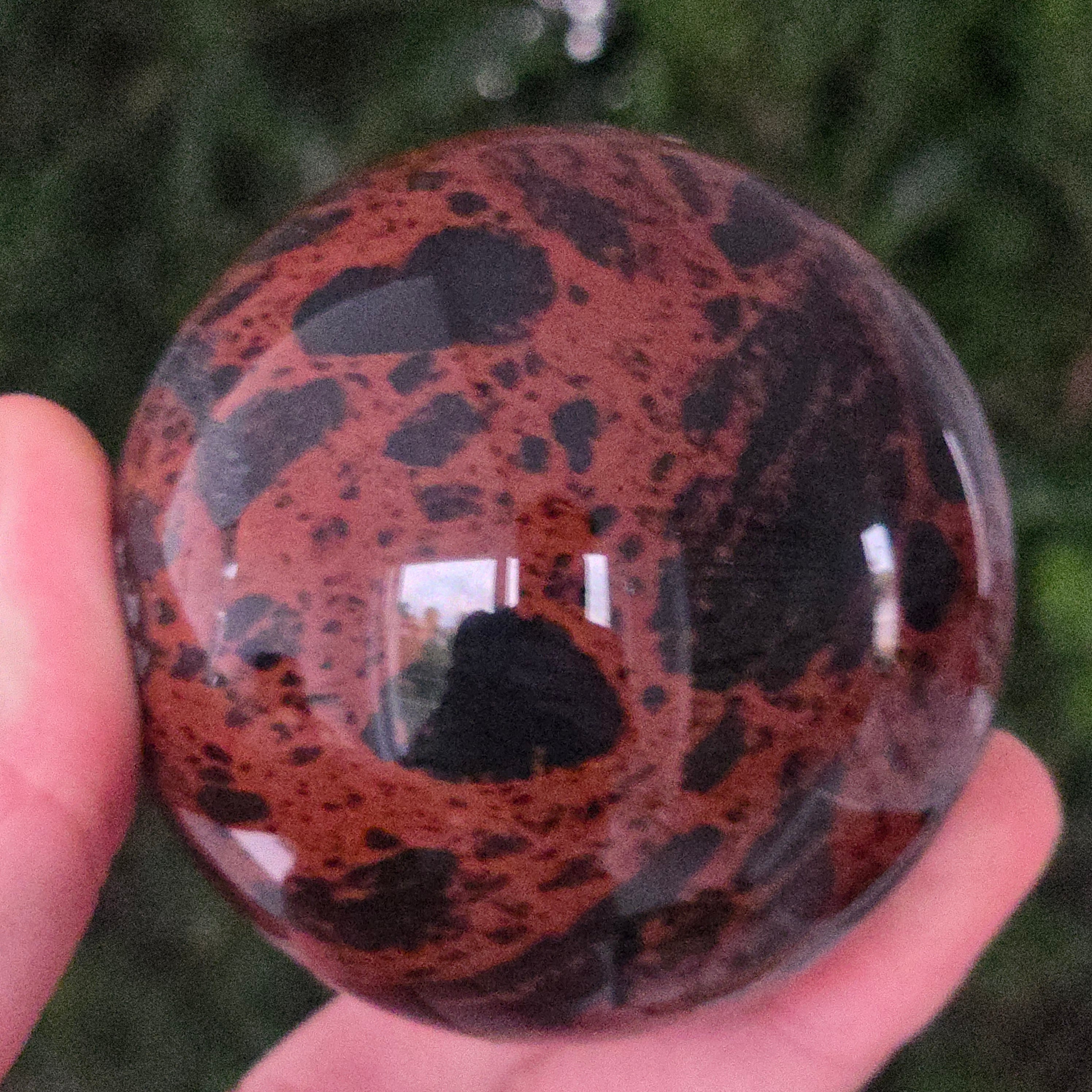 Această sferă din obsidian mahon este o întrupare a forței primordiale a Pământului — o piatră a rădăcinilor, a siguranței și a transformării interioare.