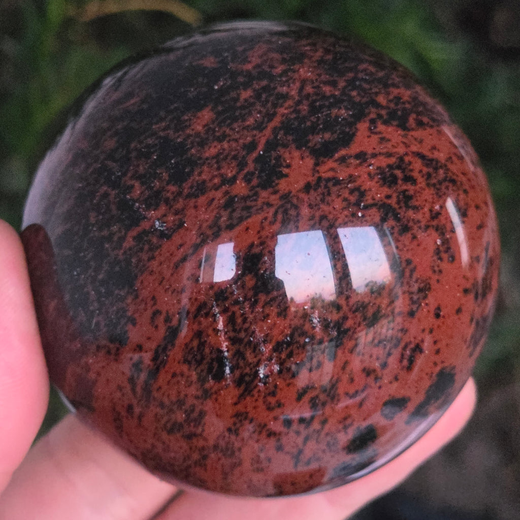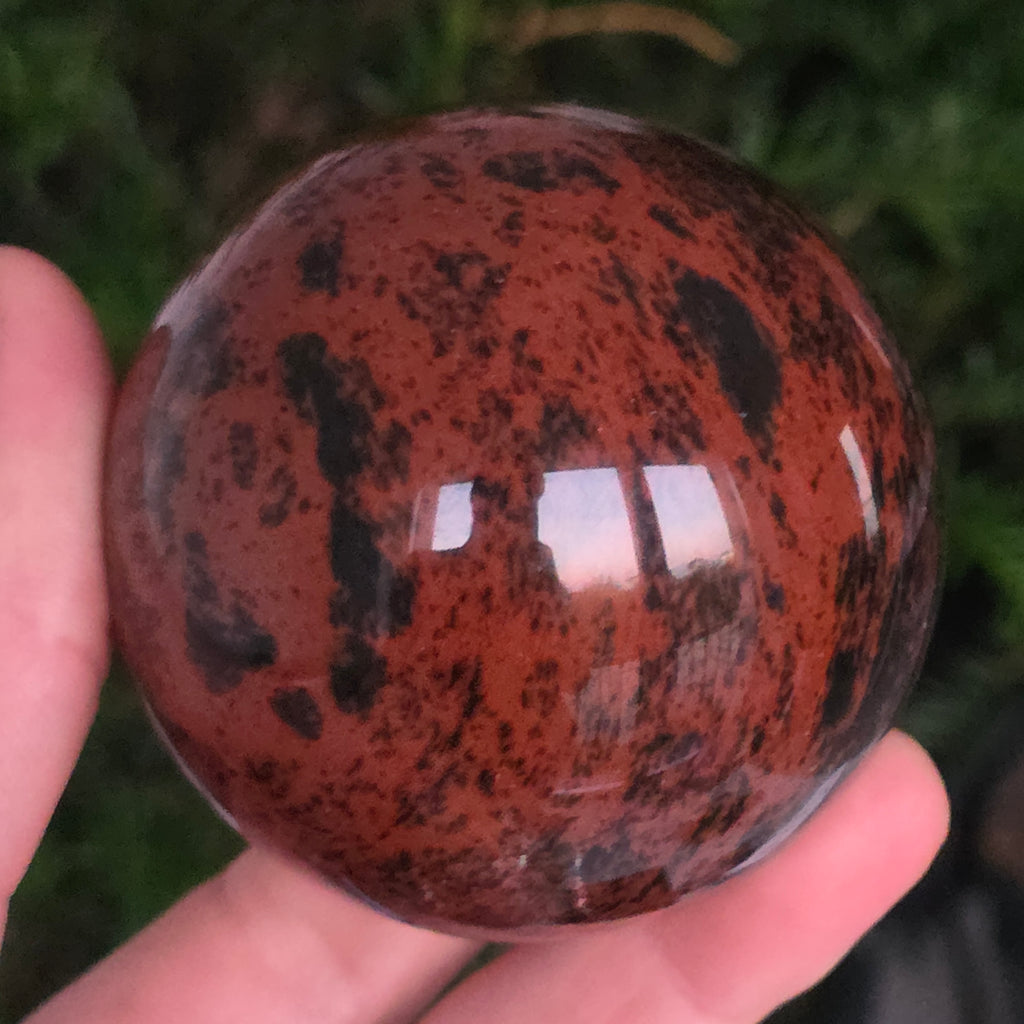 Această sferă din obsidian mahon este o întrupare a forței primordiale a Pământului — o piatră a rădăcinilor, a siguranței și a transformării interioare.