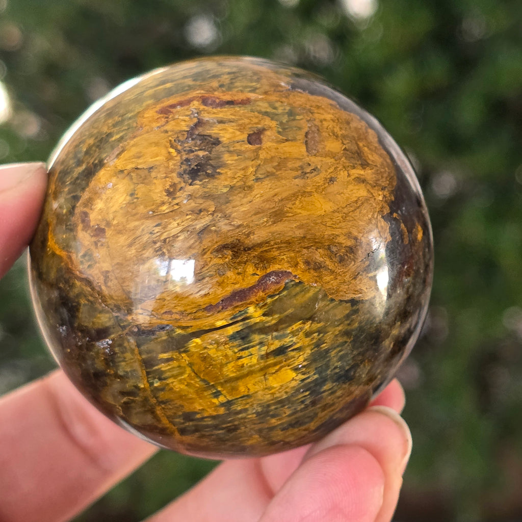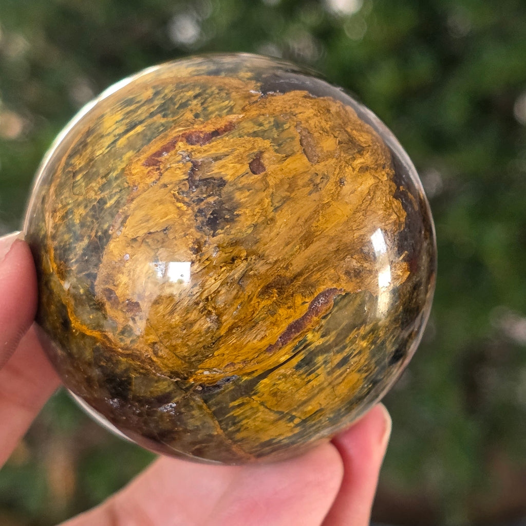 Această sferă din Pietersit pare să conțină o furtună cosmică prinsă în piatră. Reflexele sale albastre și aurii se mișcă asemenea norilor și fulgerelor înghețate în timp, creând o iluzie de mișcare perpetuă.