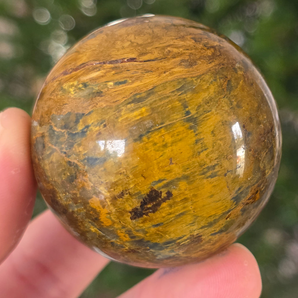 Această sferă din Pietersit pare să conțină o furtună cosmică prinsă în piatră. Reflexele sale albastre și aurii se mișcă asemenea norilor și fulgerelor înghețate în timp, creând o iluzie de mișcare perpetuă.