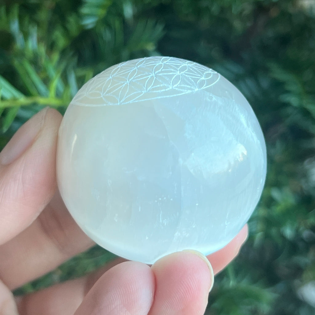 Sfera din Selenit natural gravată cu Floarea Vieții / Flower of Life emană o energie blândă, luminoasă și purificatoare. Forma sferică simbolizează totalitatea, unitatea și echilibrul universal, în timp ce gravura sacrală a Floarea Vieții / Flower of Life amplifică această armonie prin geometria perfectă a creației.