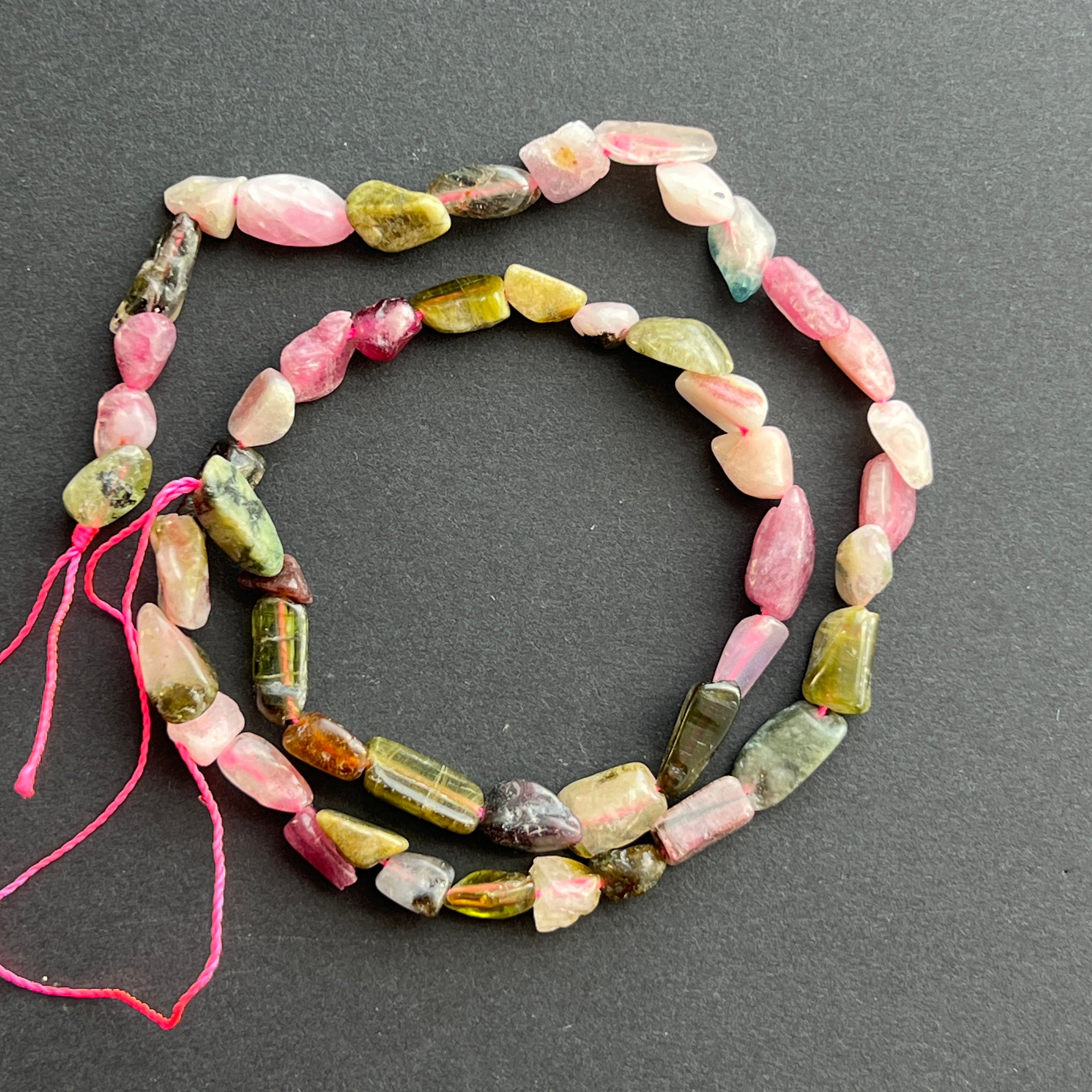 Sirag de turmalina roz mix, alcătuit din pietre brute rulate naturale, perfect pentru coliere, brățări sau alte bijuterii handmade.