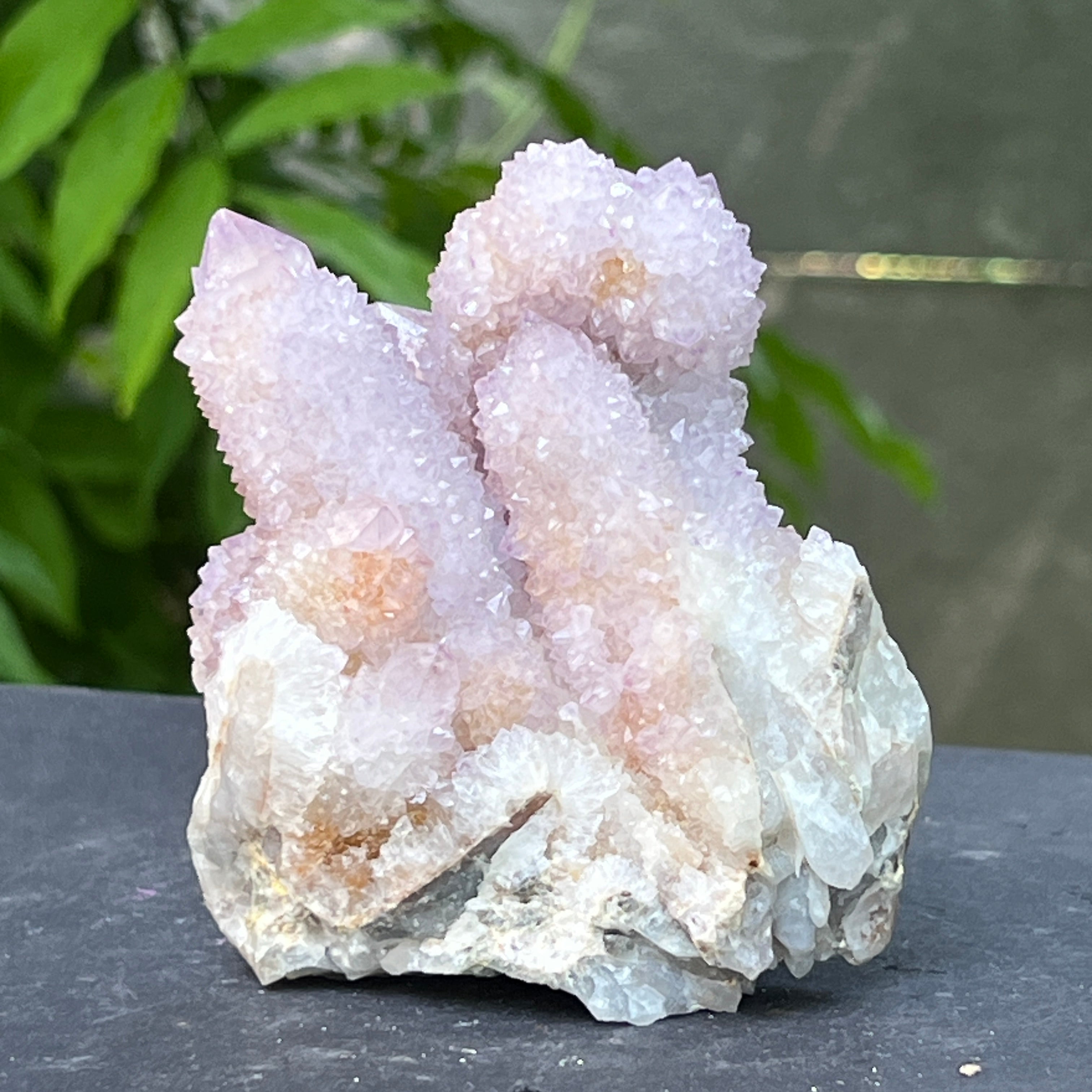 În adâncurile pământului african, acolo unde tăcerea munților ascunde povești nespuse, ia naștere un cristal de o frumusețe neobișnuită: Ametistul Spirit Quartz, cunoscut și ca „Cactus Quartz”. Această minune mineralogică pare învăluită într-o aură mistică – o singură bază solidă, acoperită cu mii de vârfuri delicate, ca o comunitate de cristale unite într-un dans al luminii.