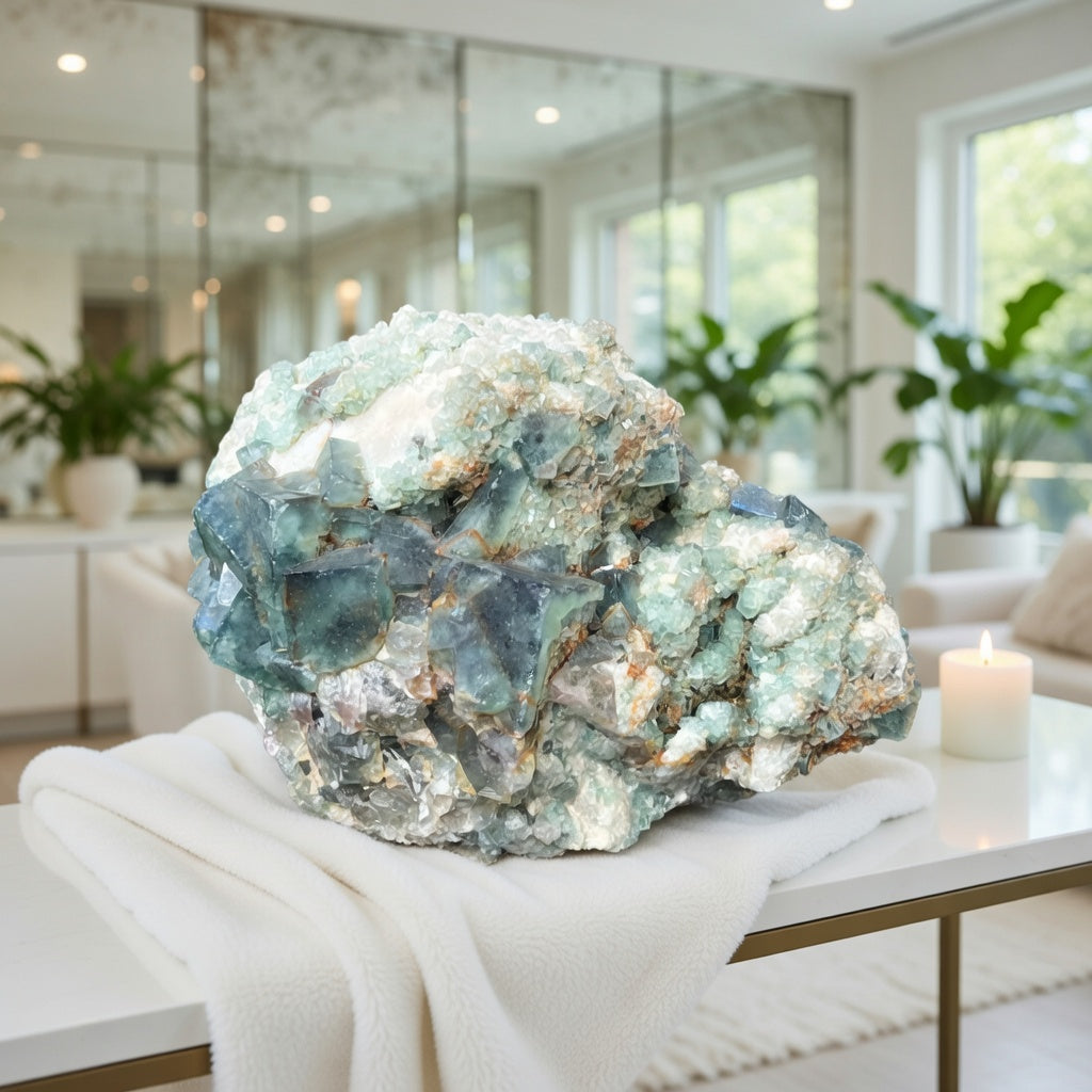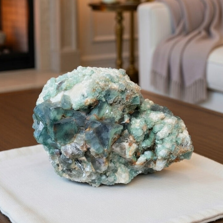 Acest exemplar ilustrează fidel trăsăturile tipice ale fluoritei: formă cubică perfectă, transparență parțială și o nuanță ce variază subtil în funcție de compoziția chimică și condițiile de cristalizare. Prezența culorii – fie ea verde, violet, albastru sau galben – este asociată cu incluziuni și impurități naturale precum ittriu, ceriu sau urme de hidrocarburi, iar zonarea cromatică oferă informații valoroase despre modificările din mediul de formare.