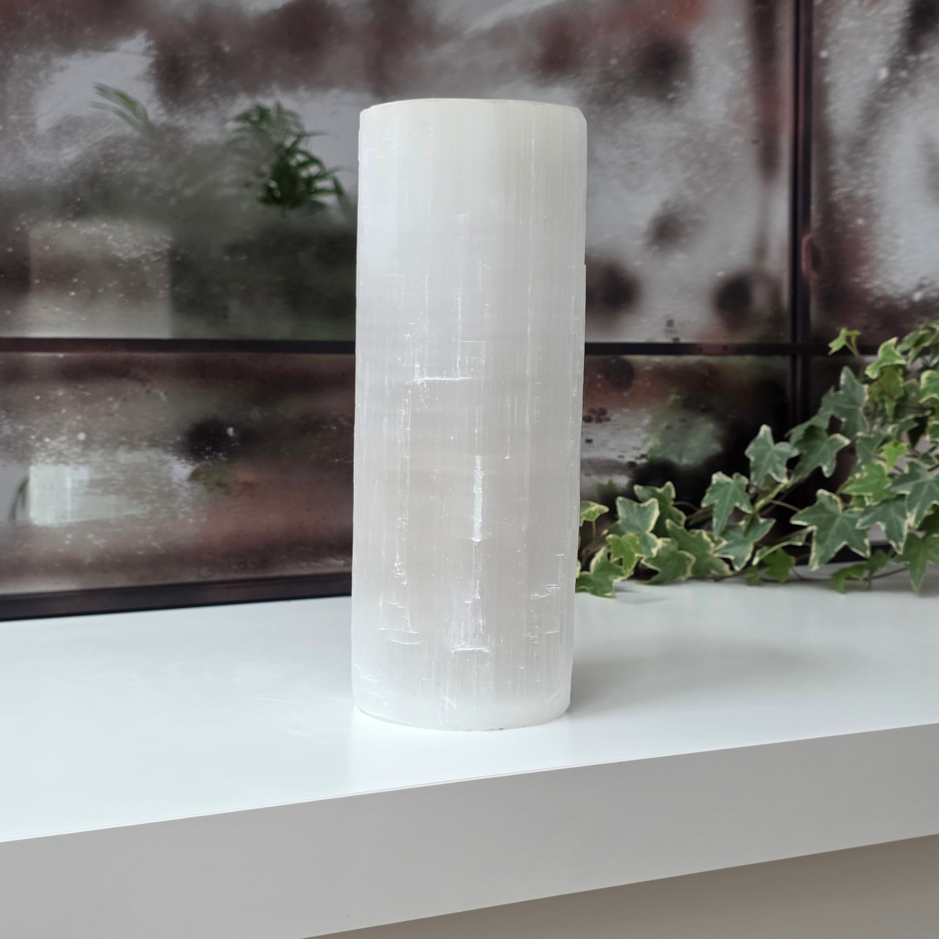 Acest suport de lumânare în formă de turn cilindru, realizat din selenit natural, aduce un strop de magie și lumină oricărui spațiu. Selenitul este considerat piatra purității și a liniștii interioare.
