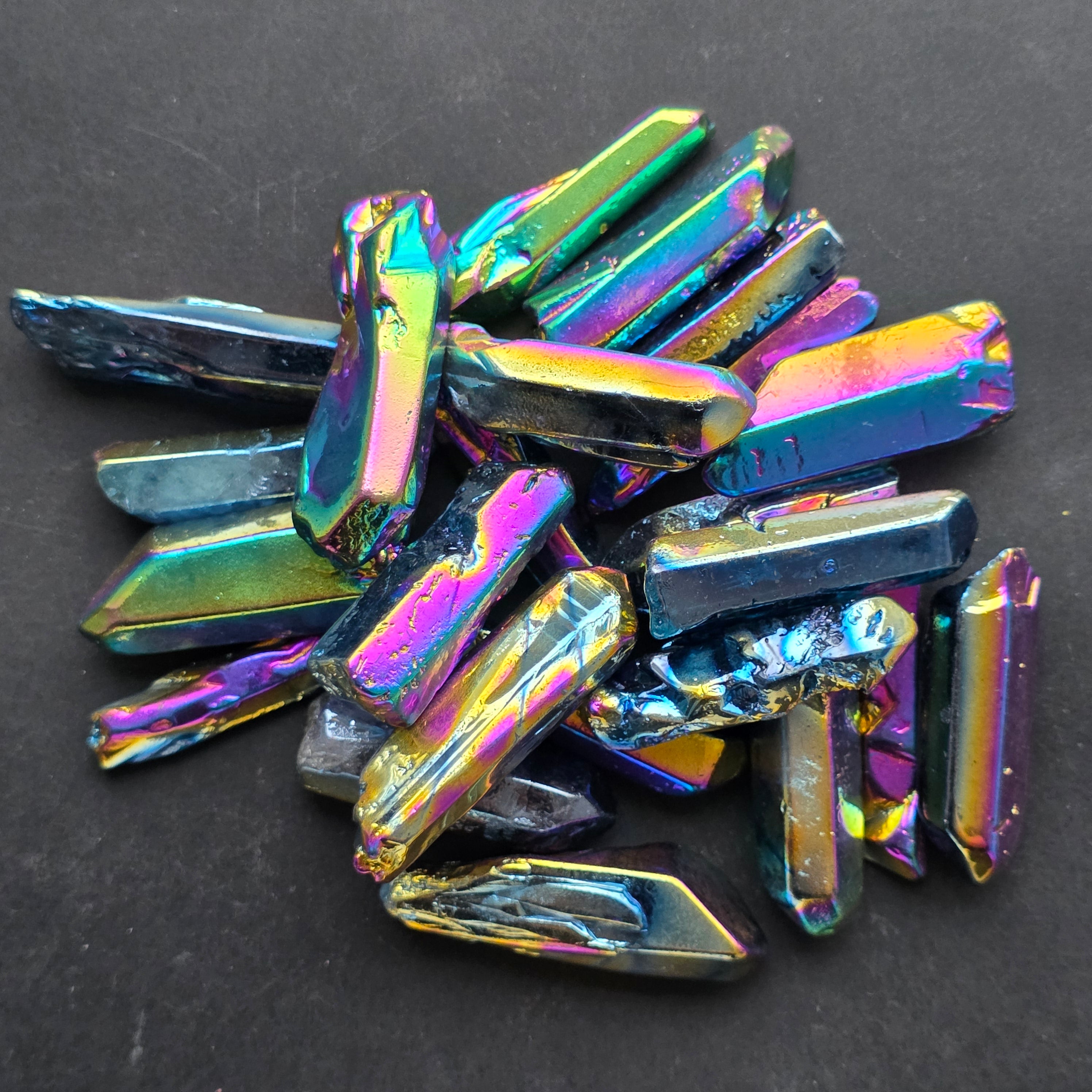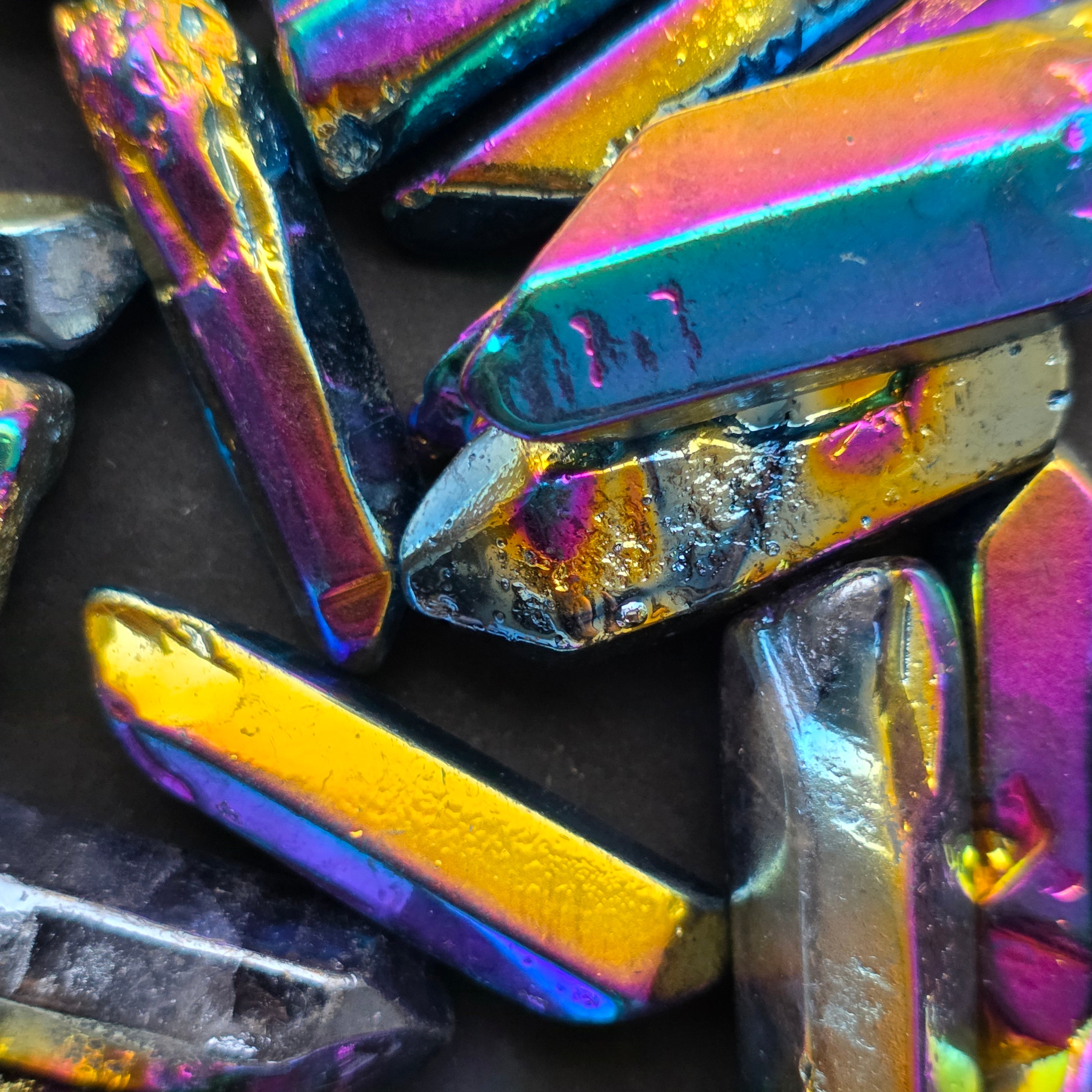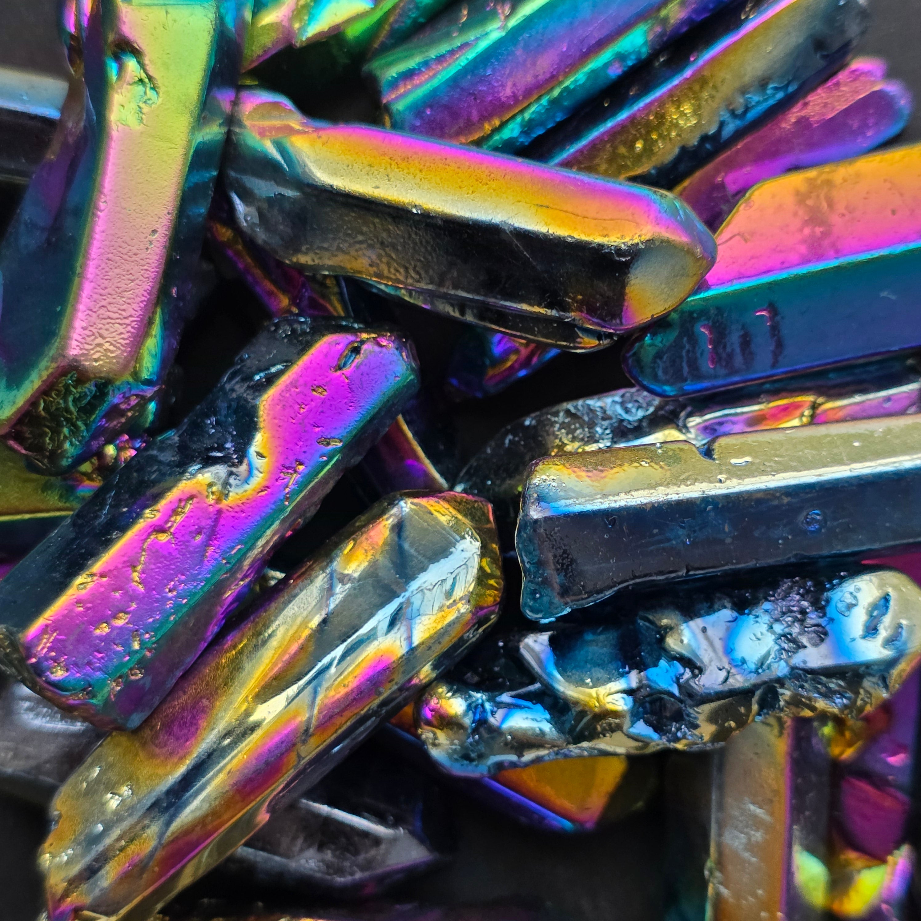 Acest cuarț este colorat, prin procesul cunoscuta ca si aura coating pentru a intensifica reflexele irizate și energia vibrantă a cristalului.