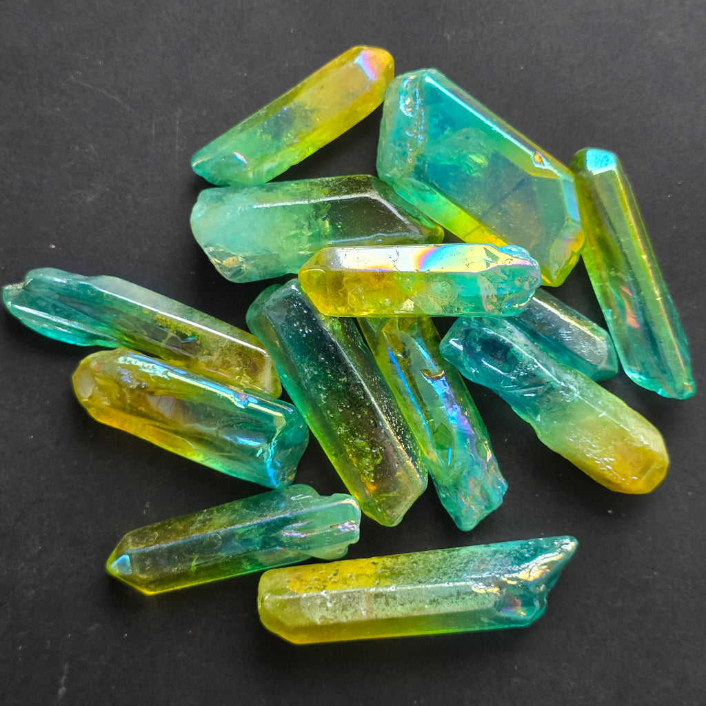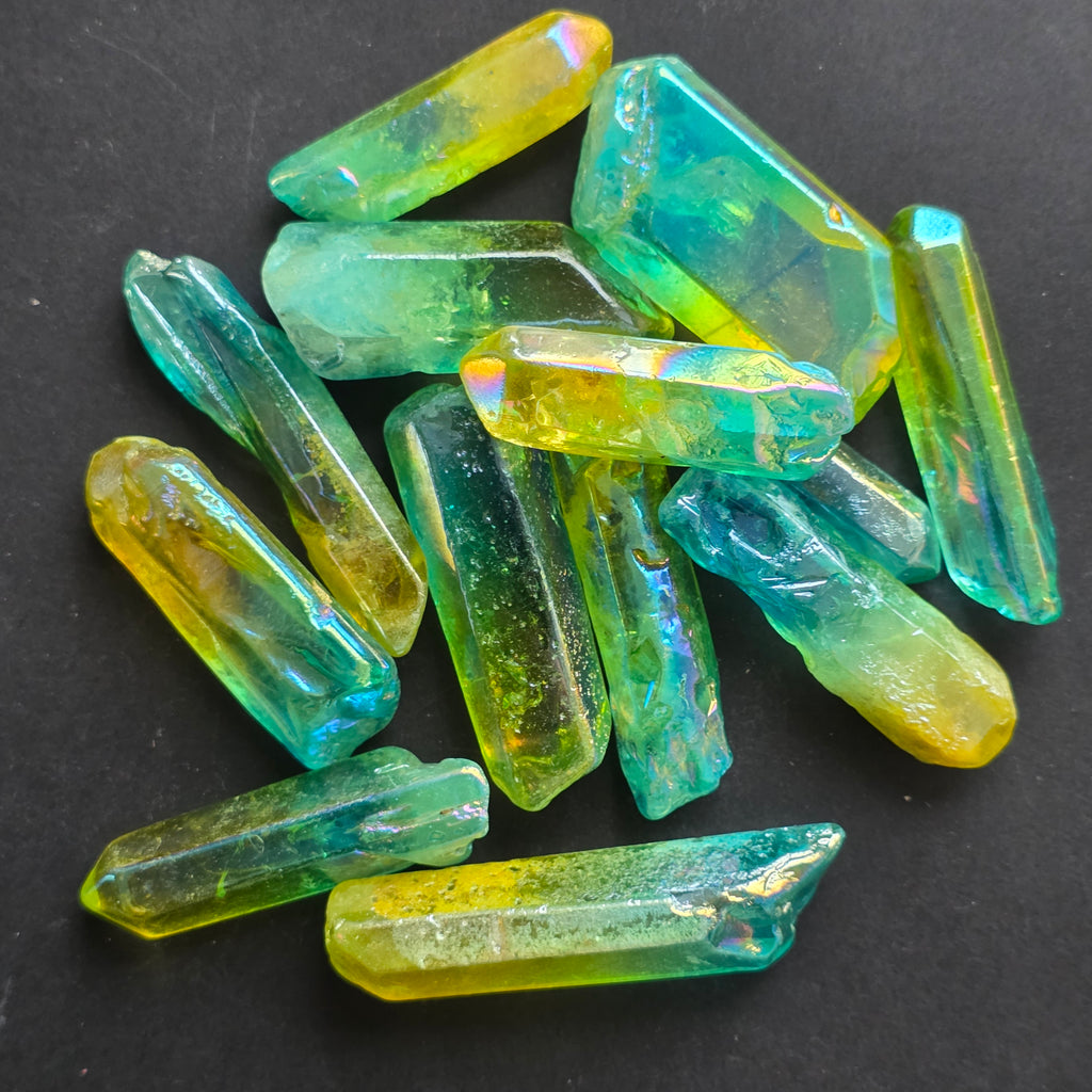 Acest cuarț este colorat, prin procesul cunoscuta ca si aura coating pentru a intensifica reflexele irizate și energia vibrantă a cristalului.